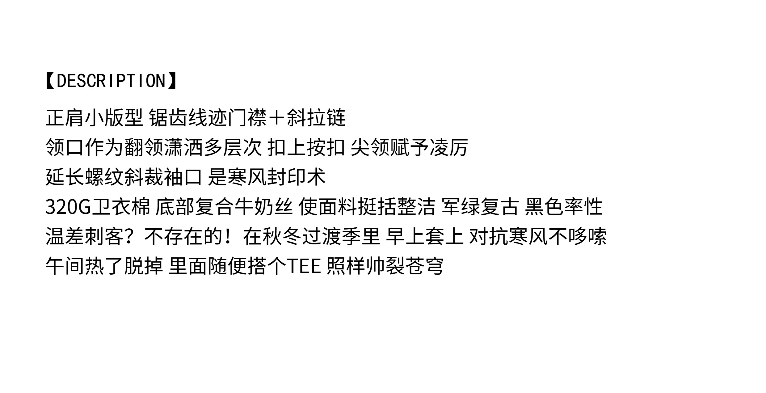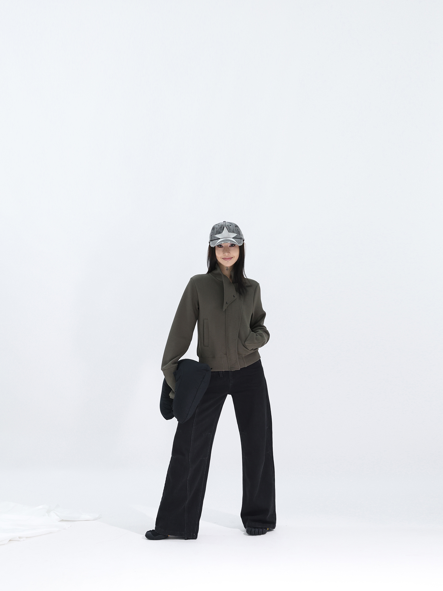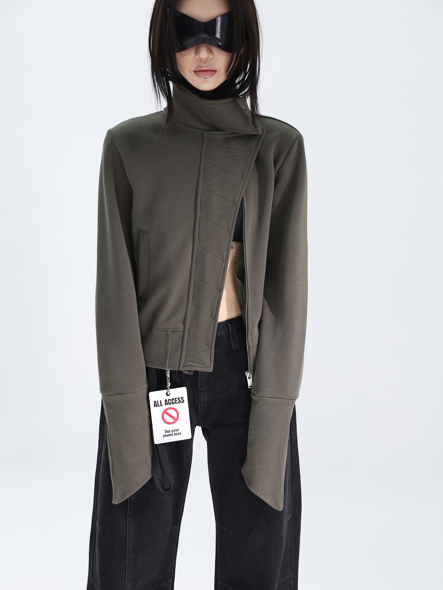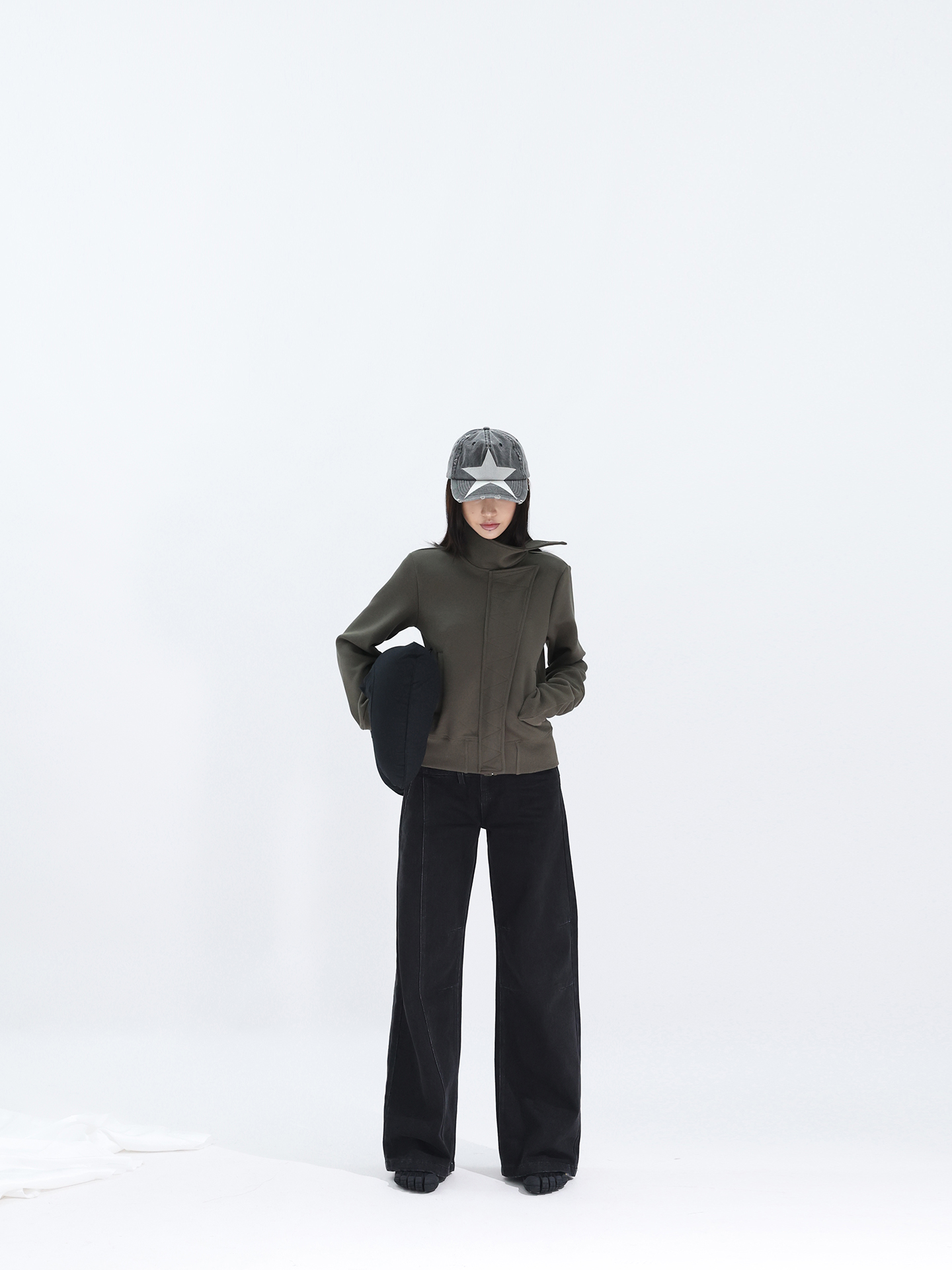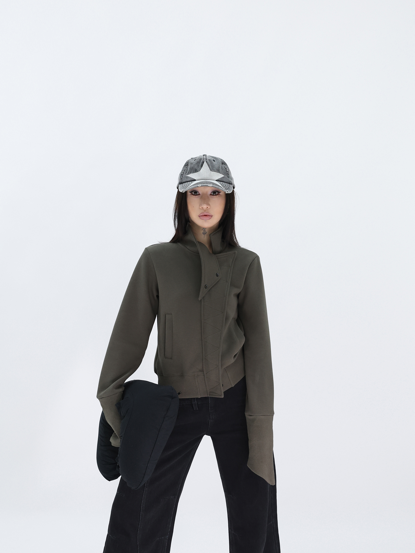 Meiya Fuzzykon Sharp Pointed Collar 320g Sweatshirt with Zigzag Stitching and Diagonal Zipper Jacket Black/Military Green