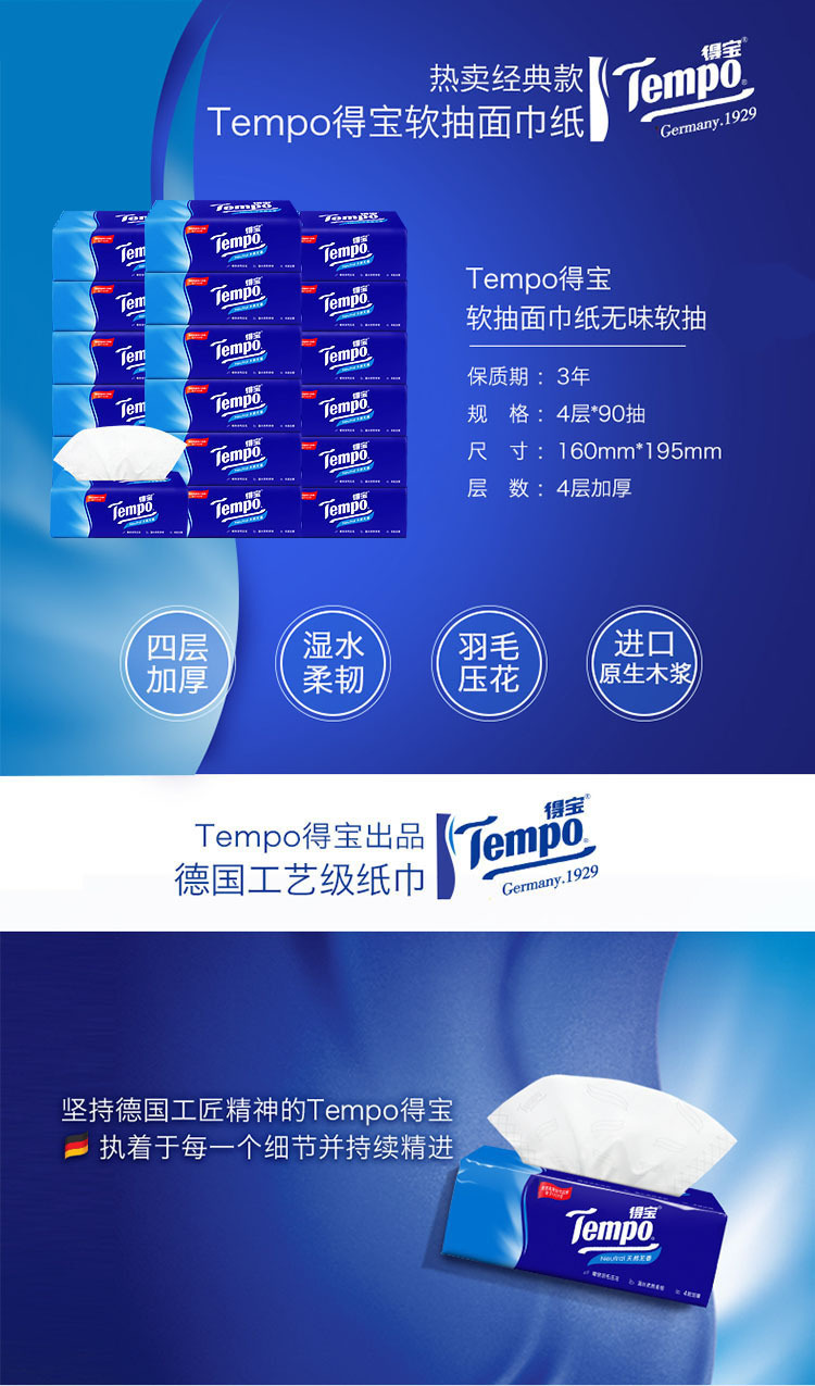 Tempo Debao Paper 90 Non-fragrant 4-layer 12-pack large box toilet paper car tissue affordable pack