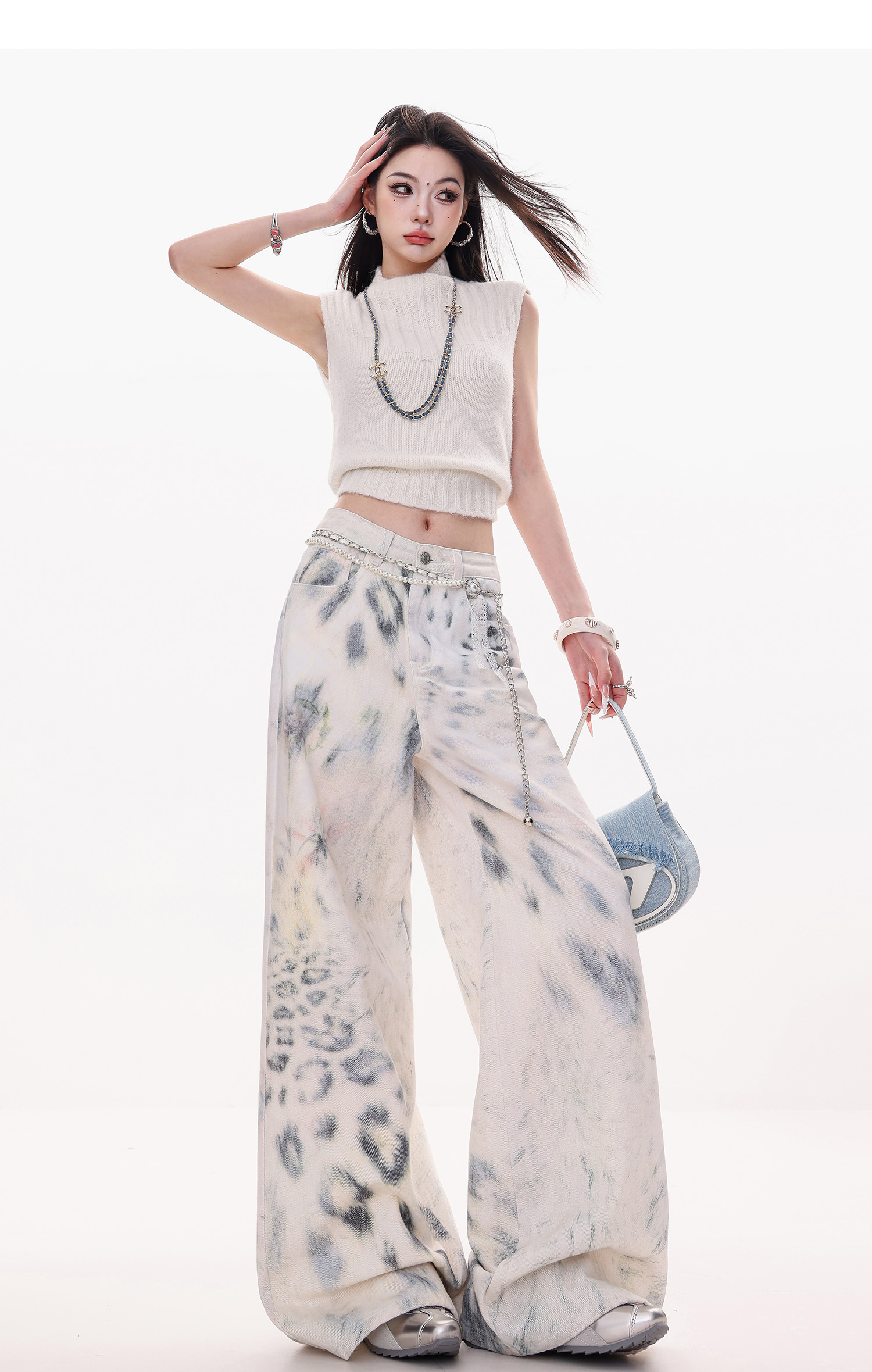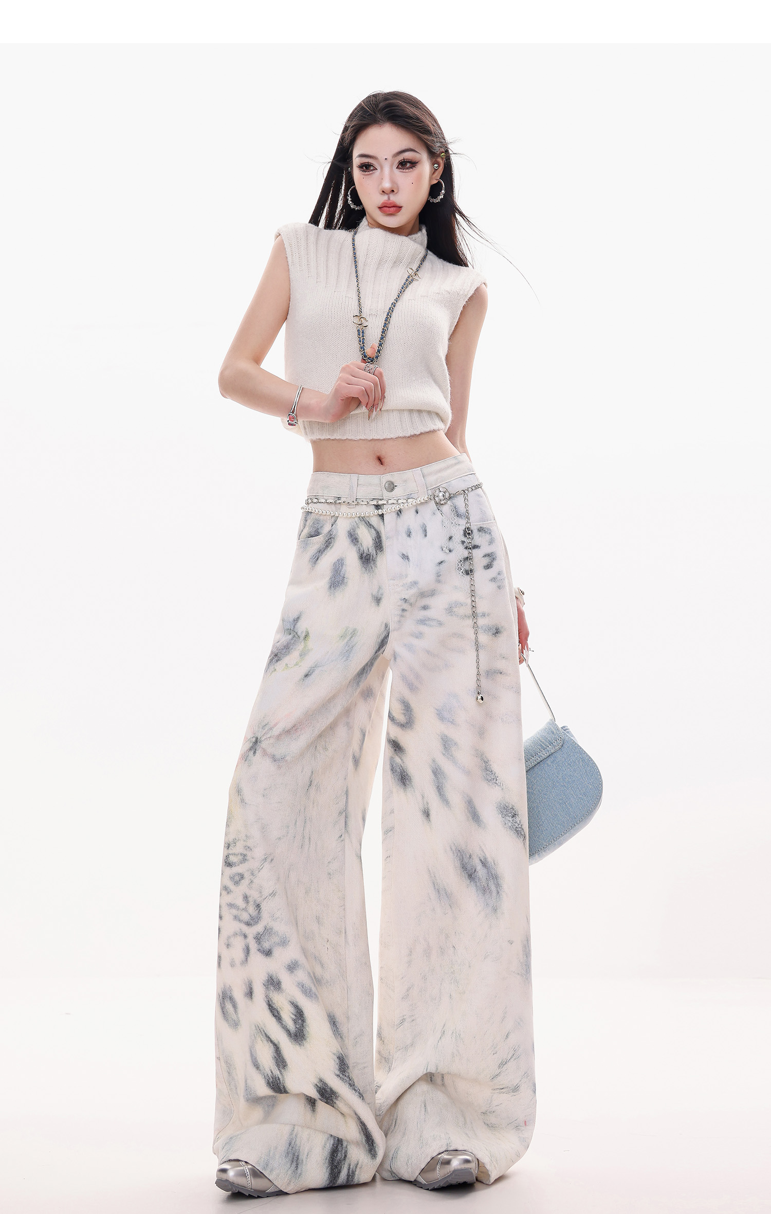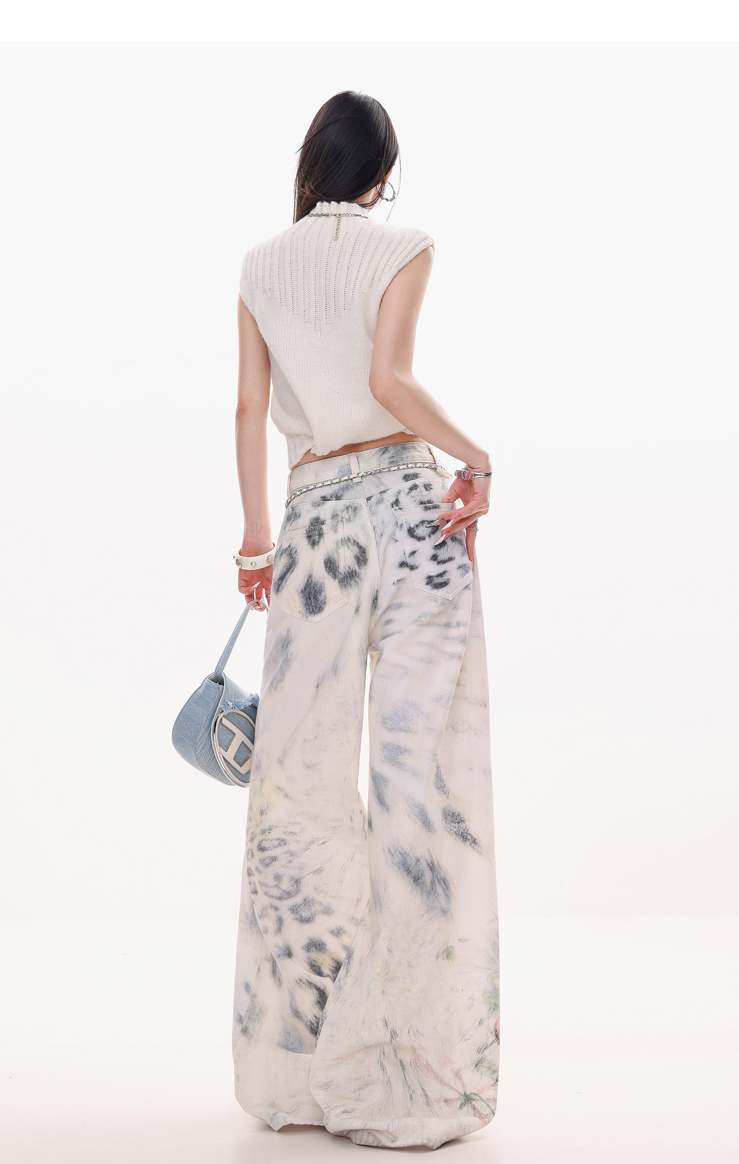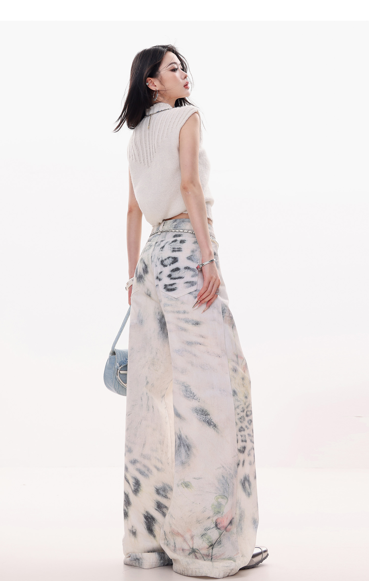 Abwlr Evening Snow Flowing Years - Original Leopard Print Tie-Dye Wide-Leg Jeans for Women, New Autumn/Winter Loose Fleece-Lined Floor-Length Pants