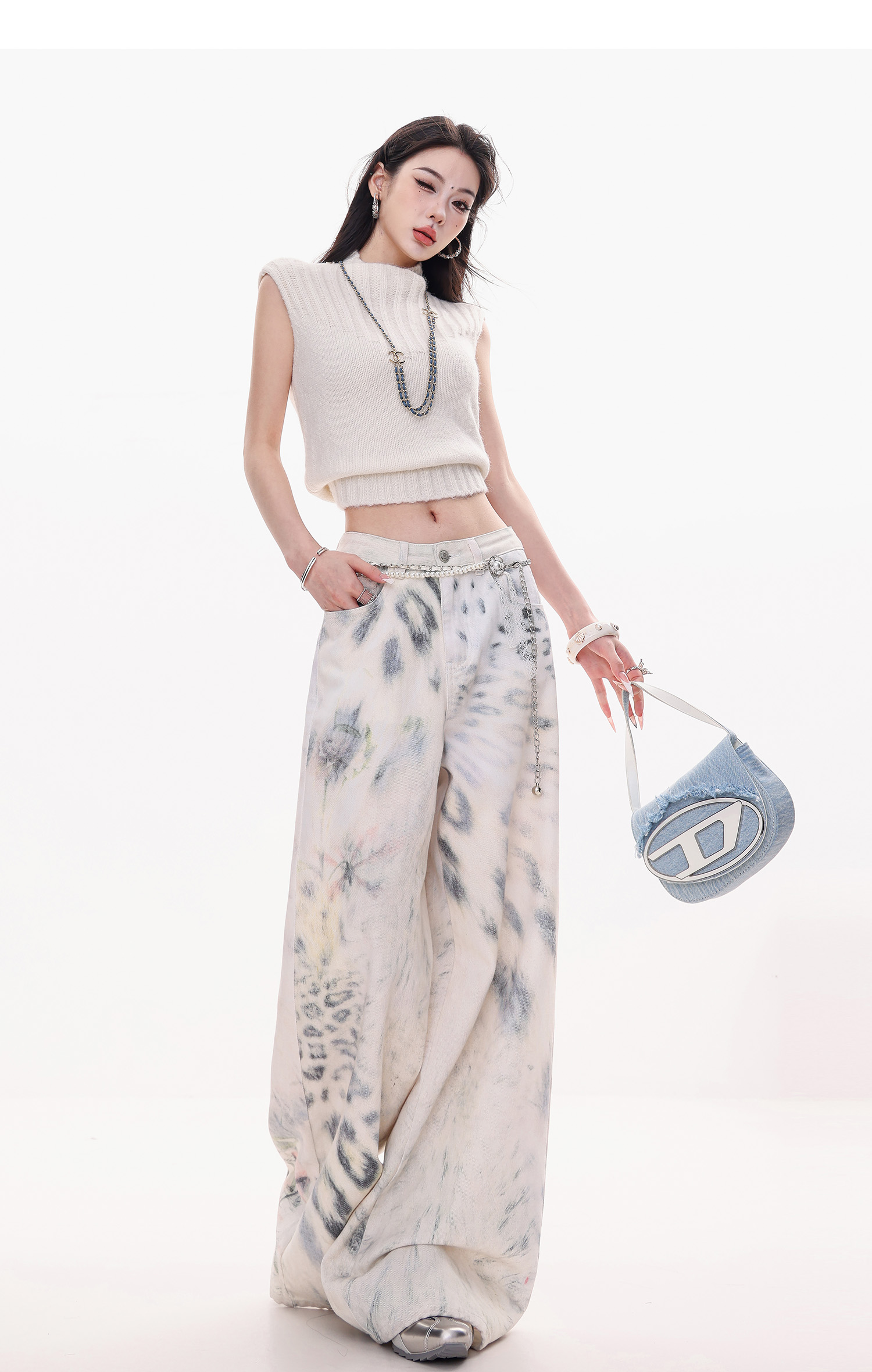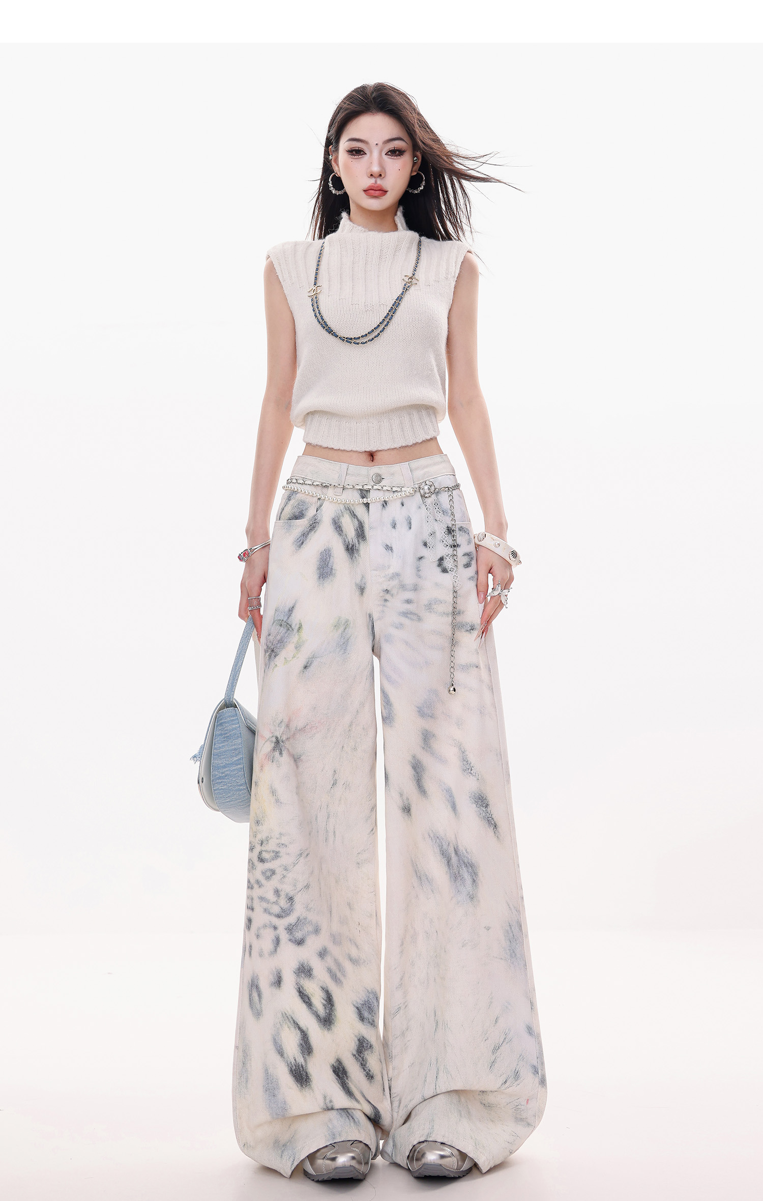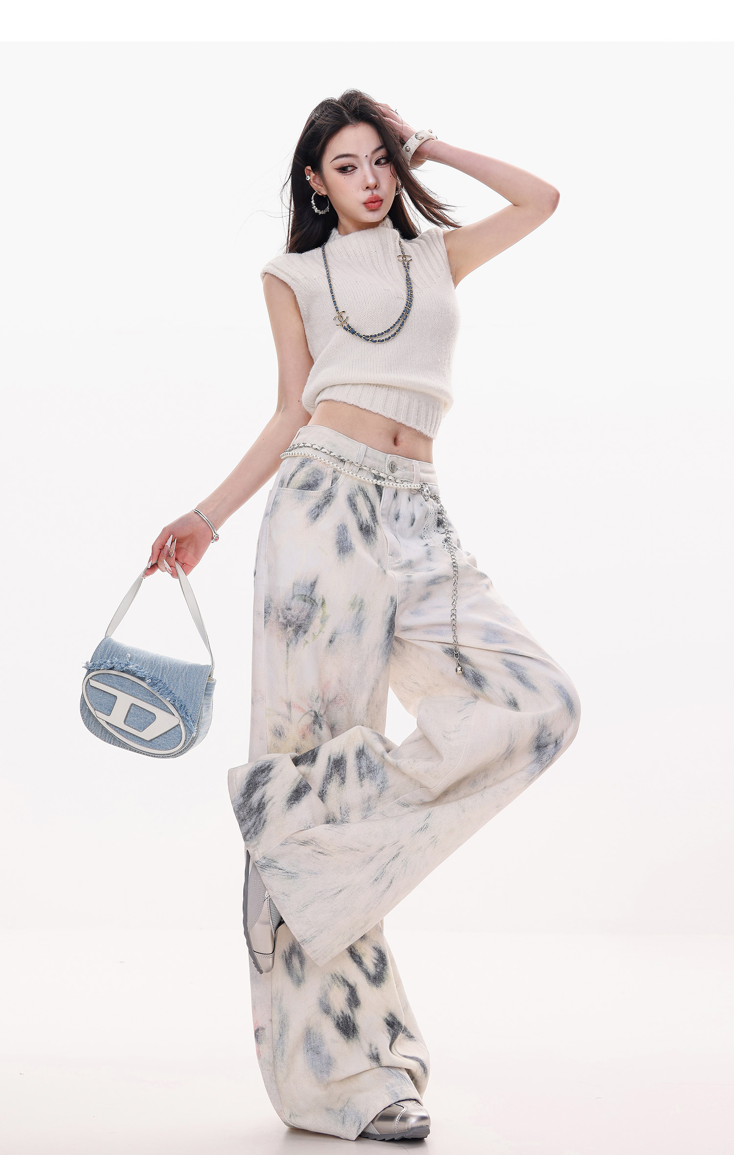 Abwlr Evening Snow Flowing Years - Original Leopard Print Tie-Dye Wide-Leg Jeans for Women, New Autumn/Winter Loose Fleece-Lined Floor-Length Pants