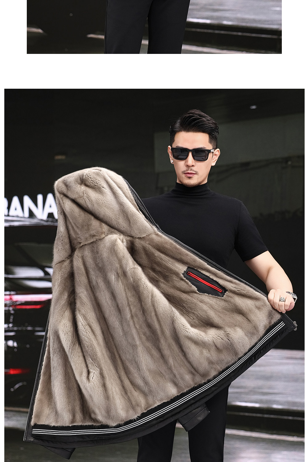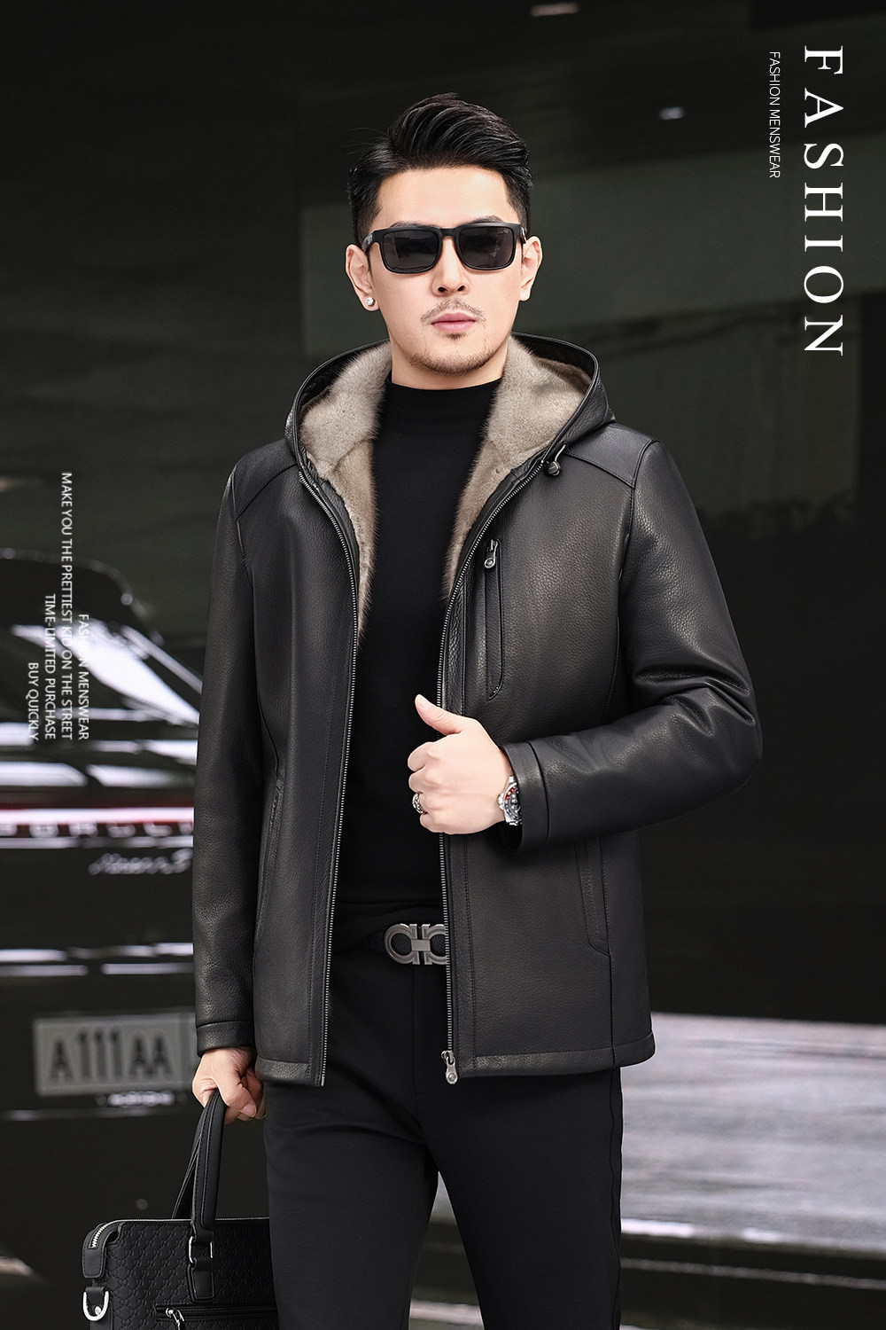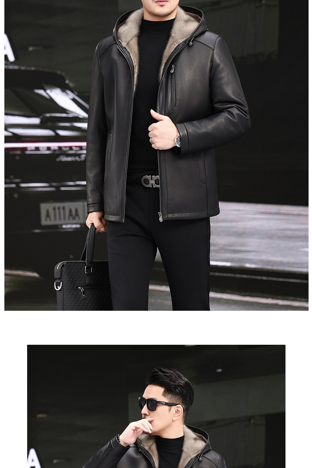 Imported Silver Orchid Whole Mink Fur Lining Genuine Leather Jacket for Men, High-End Deerskin Mid-Length Hooded Trench Coat, Winter Fur Coat