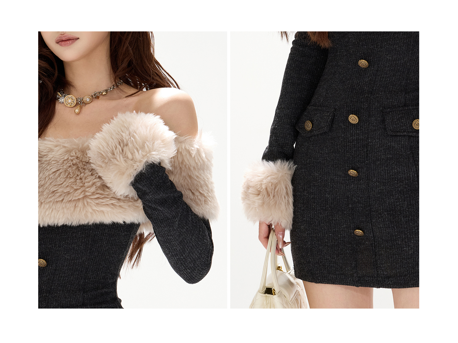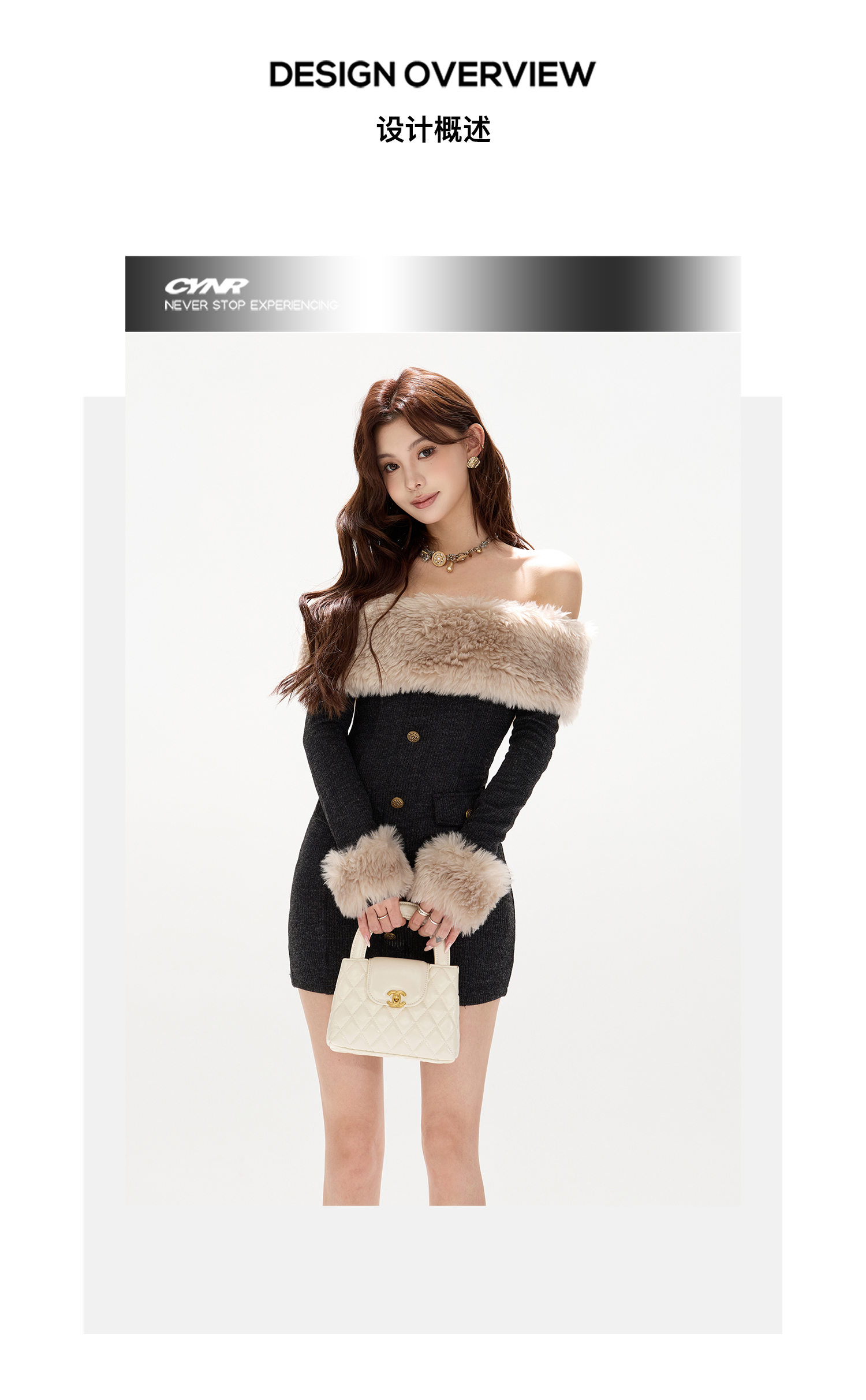 Cynr Original Design Rich Girl Sexy Fur Collar Off-Shoulder Dress Slim Fit Bodycon Knit Mini Skirt