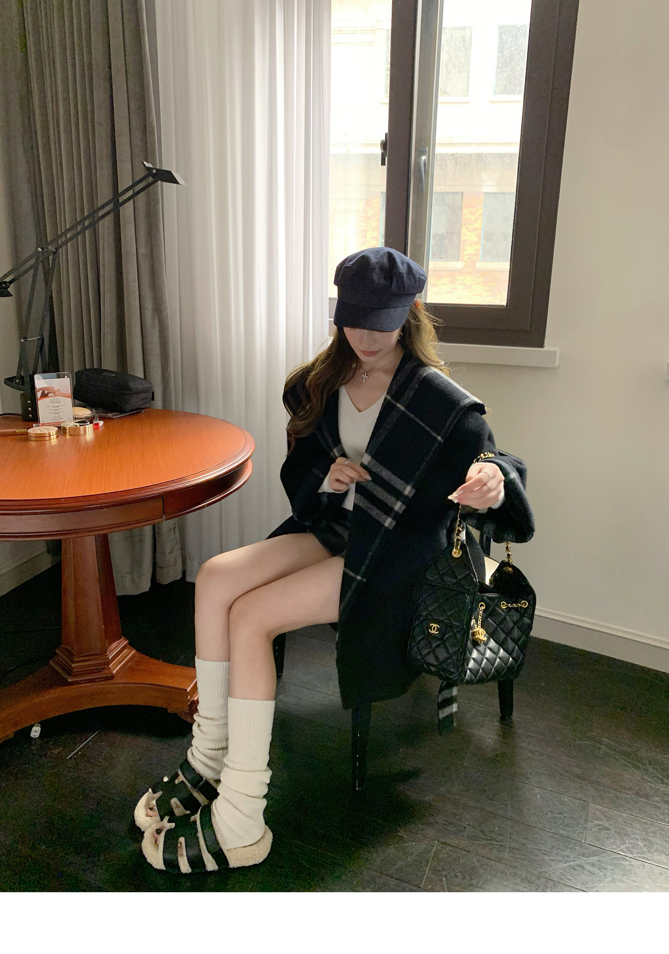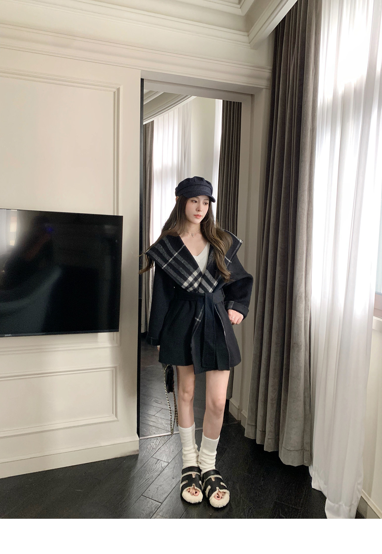 还配有同色系格纹腰带