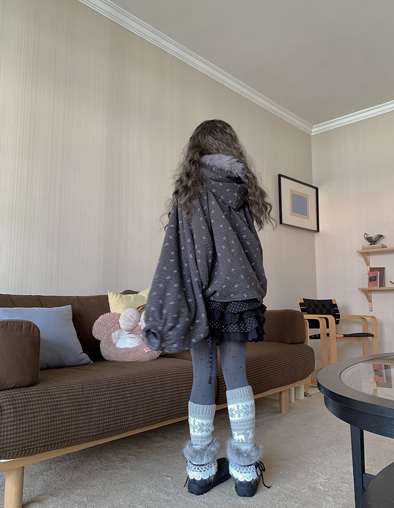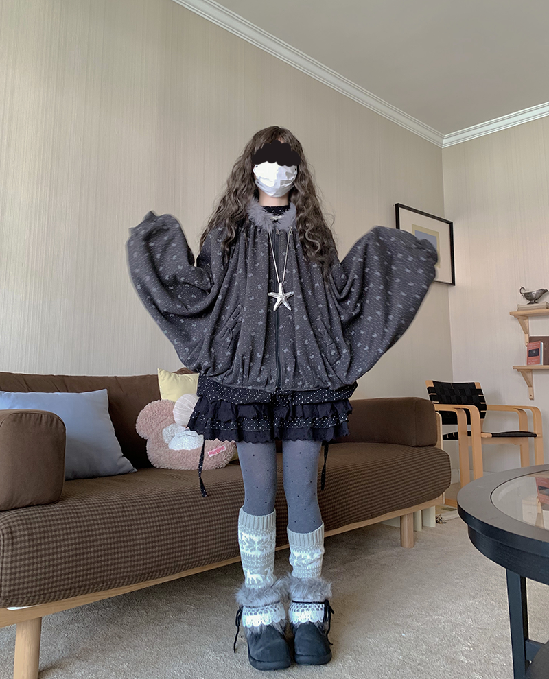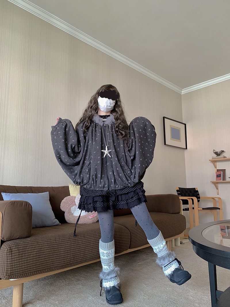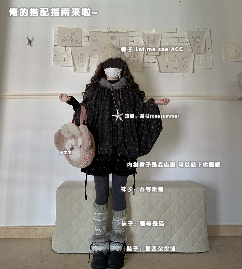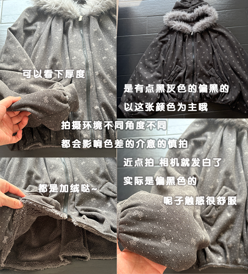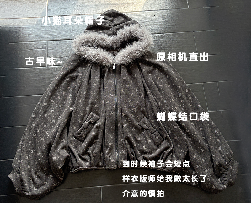 感谢诡秘们!!这期的小斗篷喜欢的人蛮多的~~~呼呼·这款做的是比较厚实的!市面上的斗篷基本加绒的很少~俺就出了款厚实的 但是也不会显胖因为上面做了很多褶皱裁片视觉会比较显瘦!颜色也是不挑肤色的 暗黑色系的~穿上就像披上了小被子出门~帽子是做的猫耳朵的设计 还有一圈灰色的毛领有点古早感~口袋上是有点蝴蝶结的设计~整体容量很大的胸围不限 因为是斗篷蝙蝠袖的版型的 胸围多大都可以穿!!还有袖子稍微做短了点版师给我做的太长了整体还是很好看的