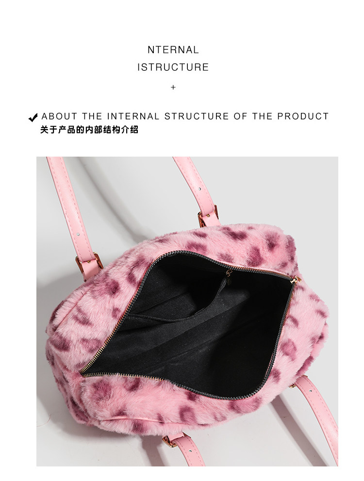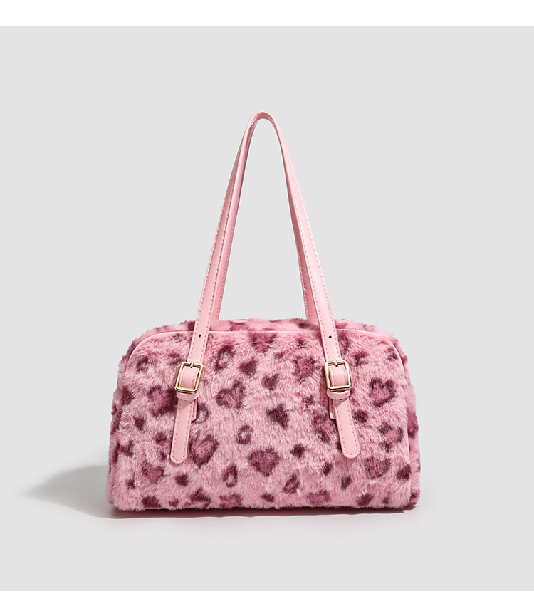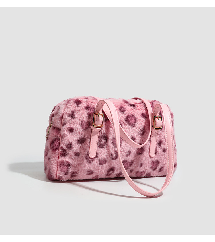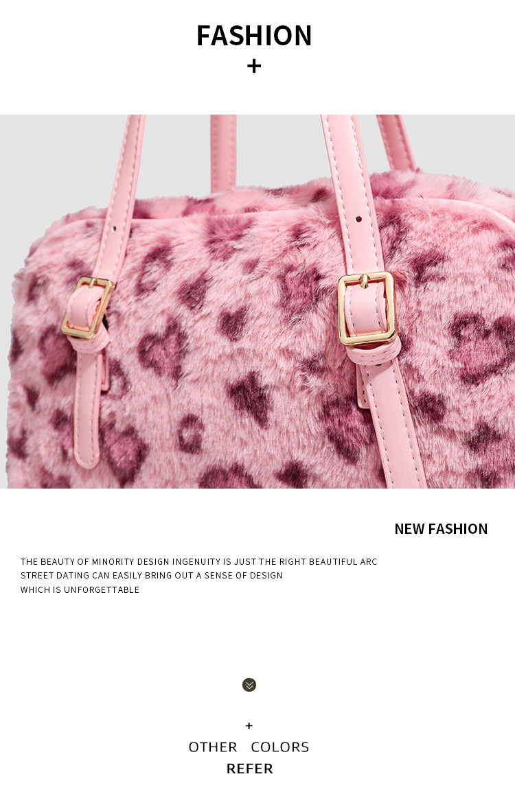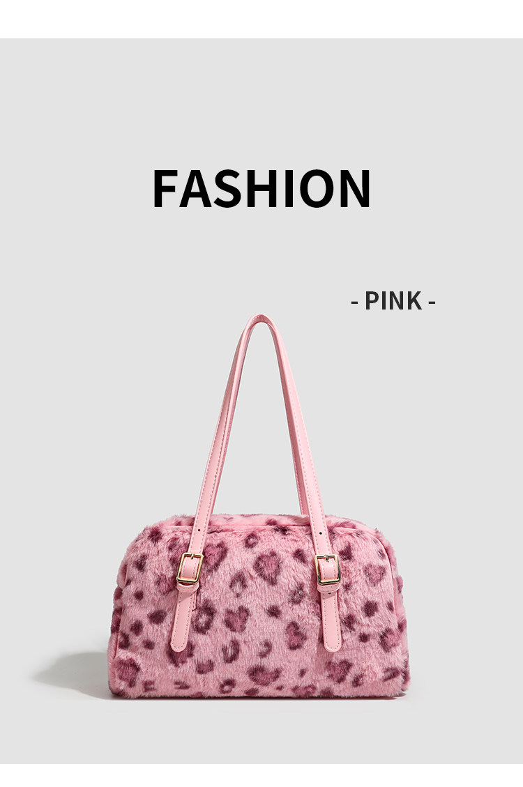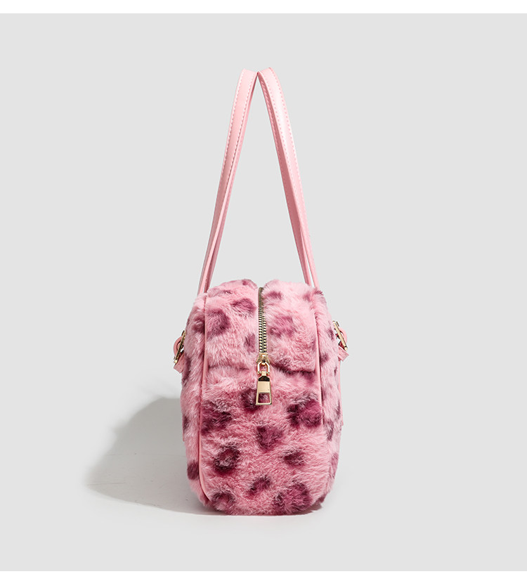Ur Bag for Women, Autumn and Winter Korean Style, Fluffy Pink Leopard Print Boston Pillow Bag, Furry Bowling Bag, Shoulder Bag