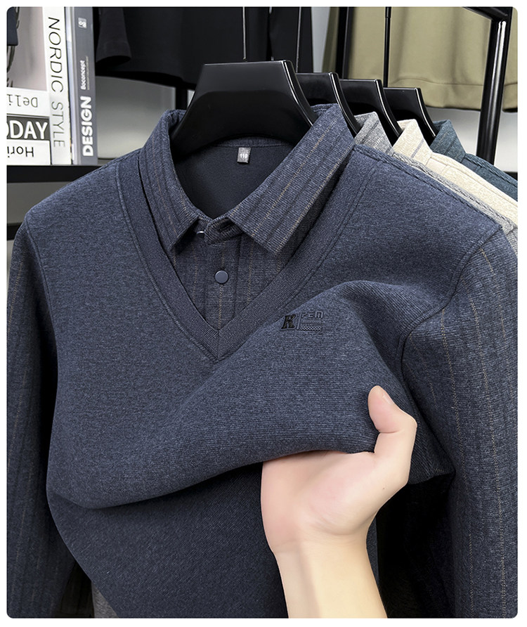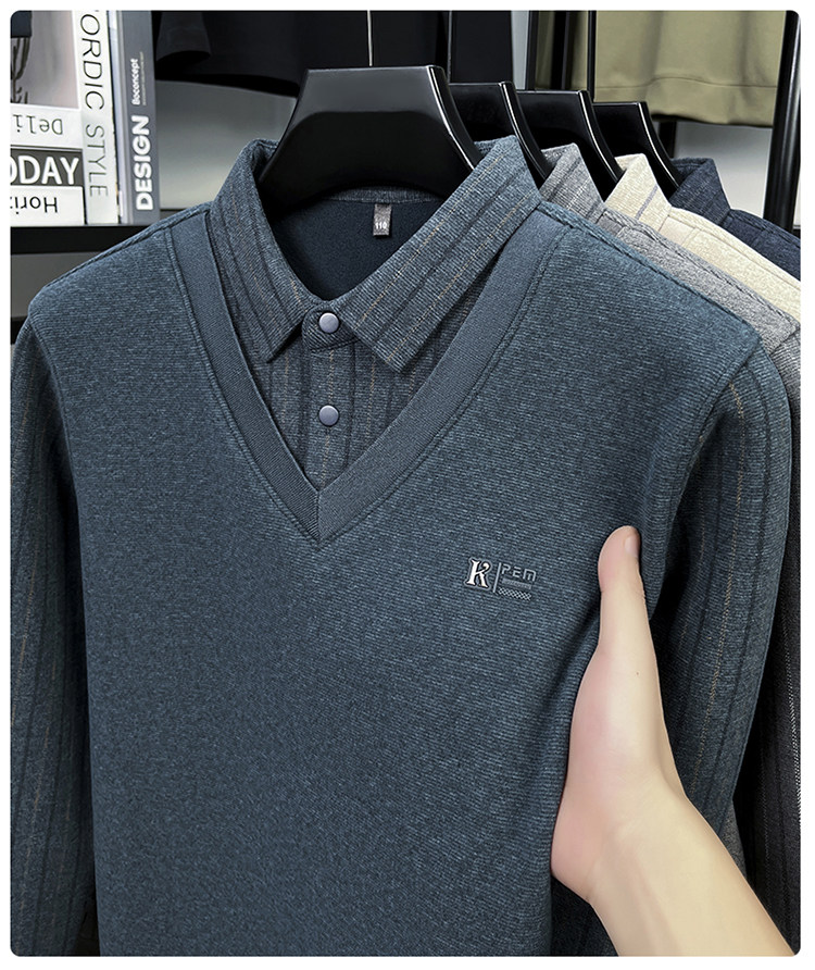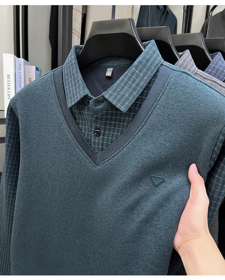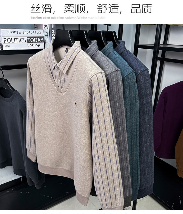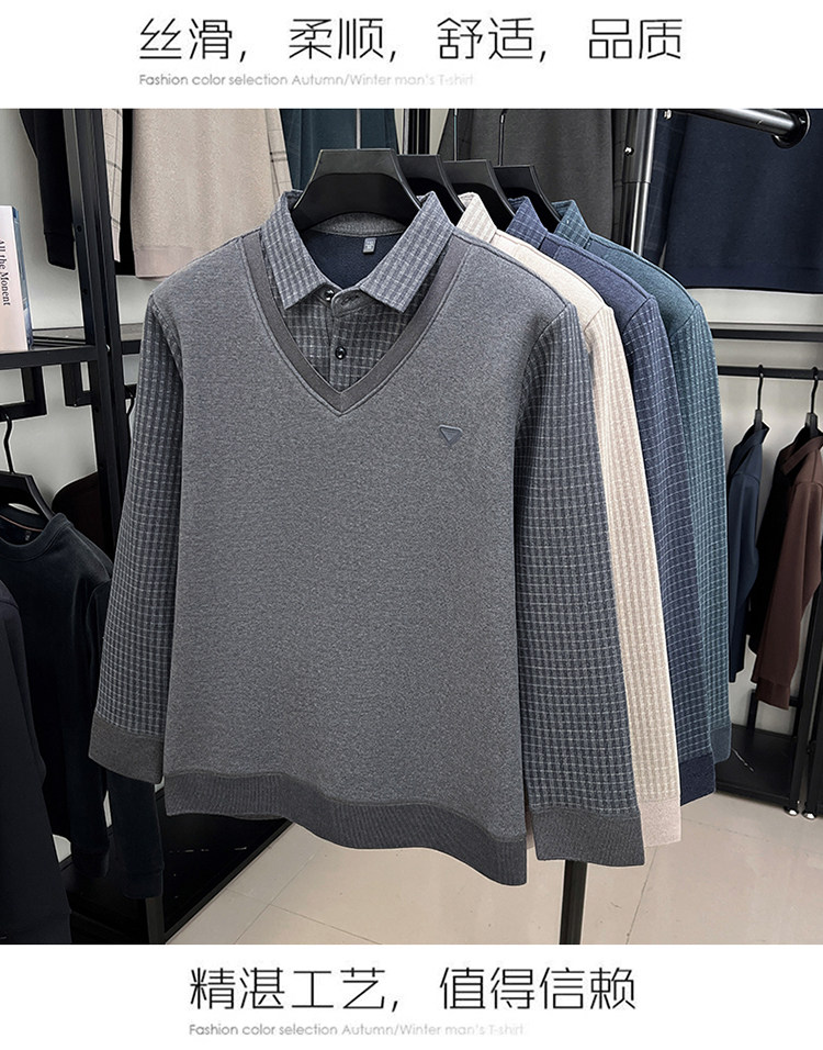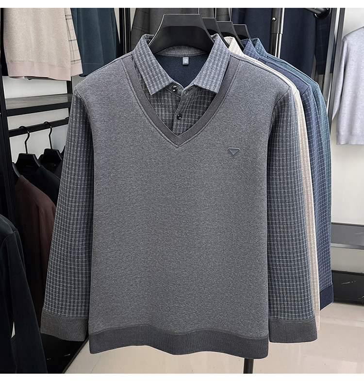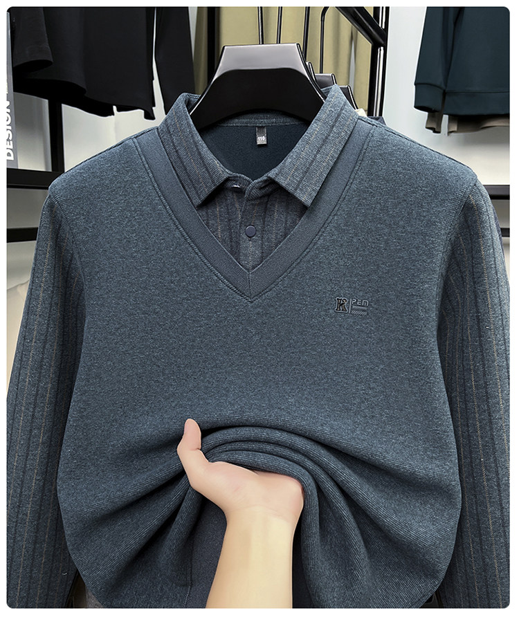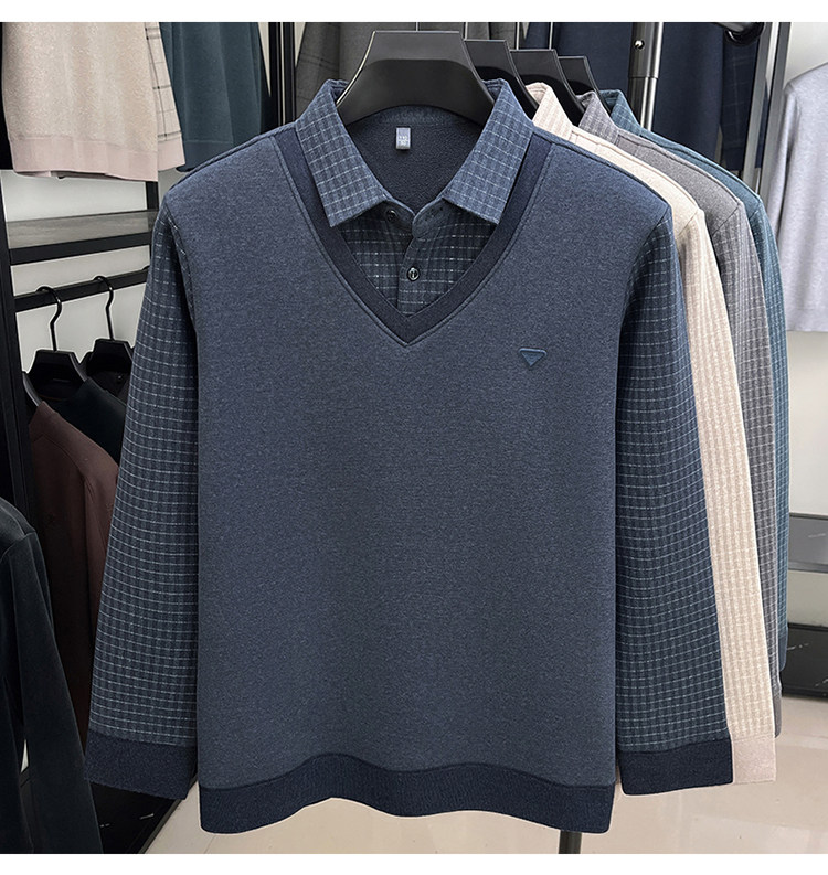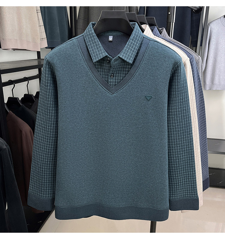 Hengyuanxiang New Autumn and Winter Men's Wool Sweater, Middle-Aged Dad's Casual Fleece-Lined Thickened Faux Two-Piece Warm Base Shirt