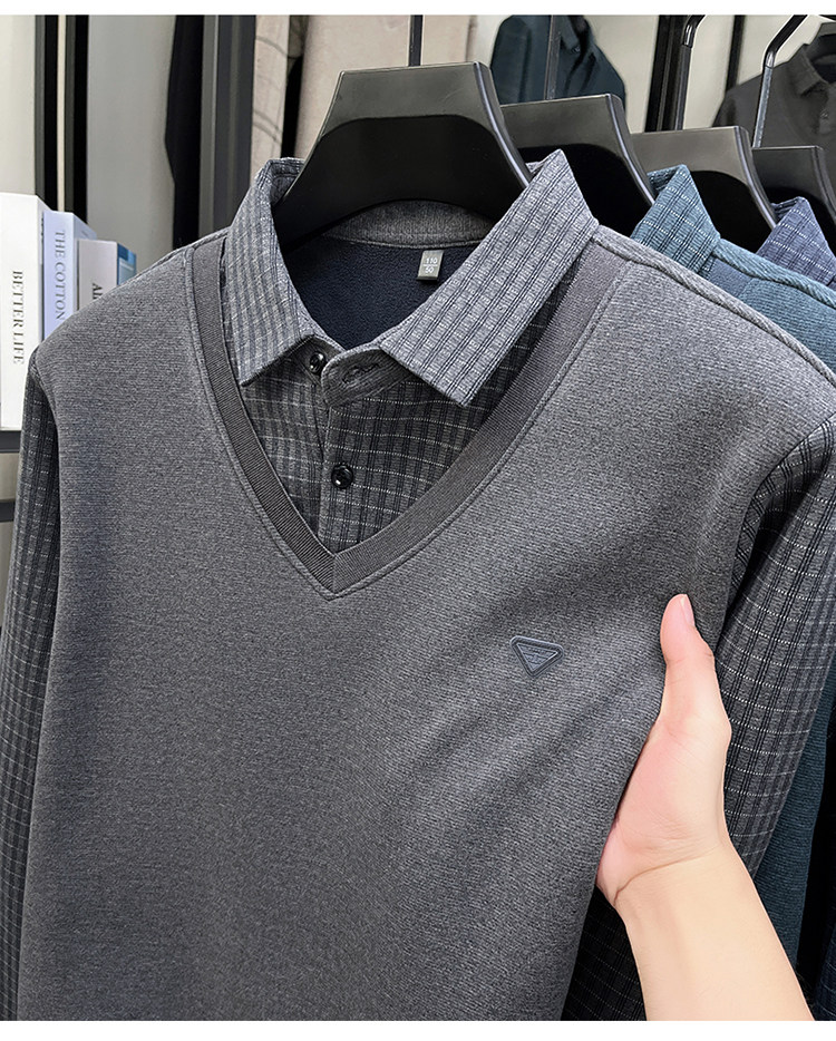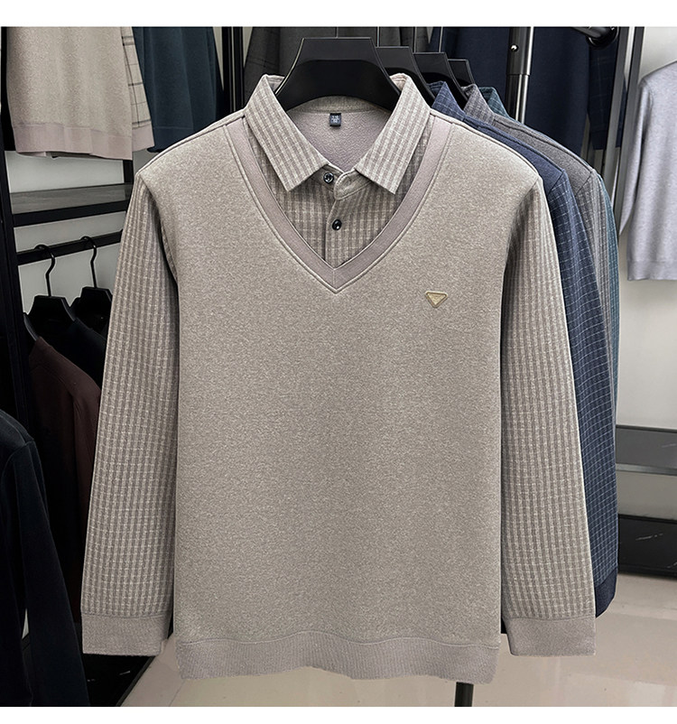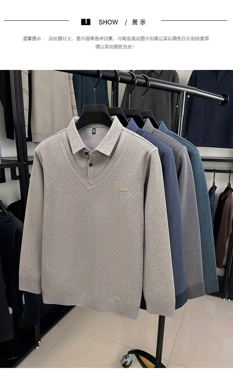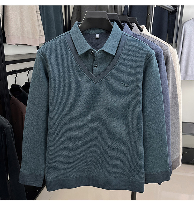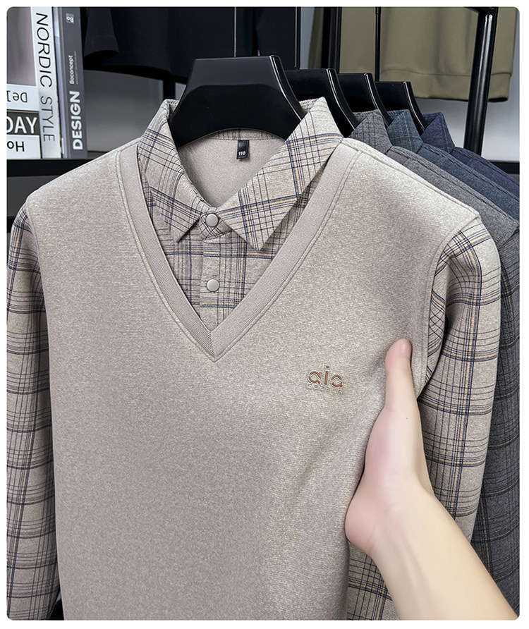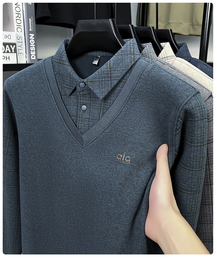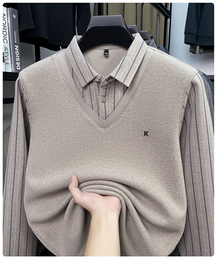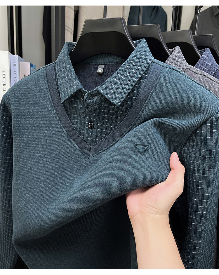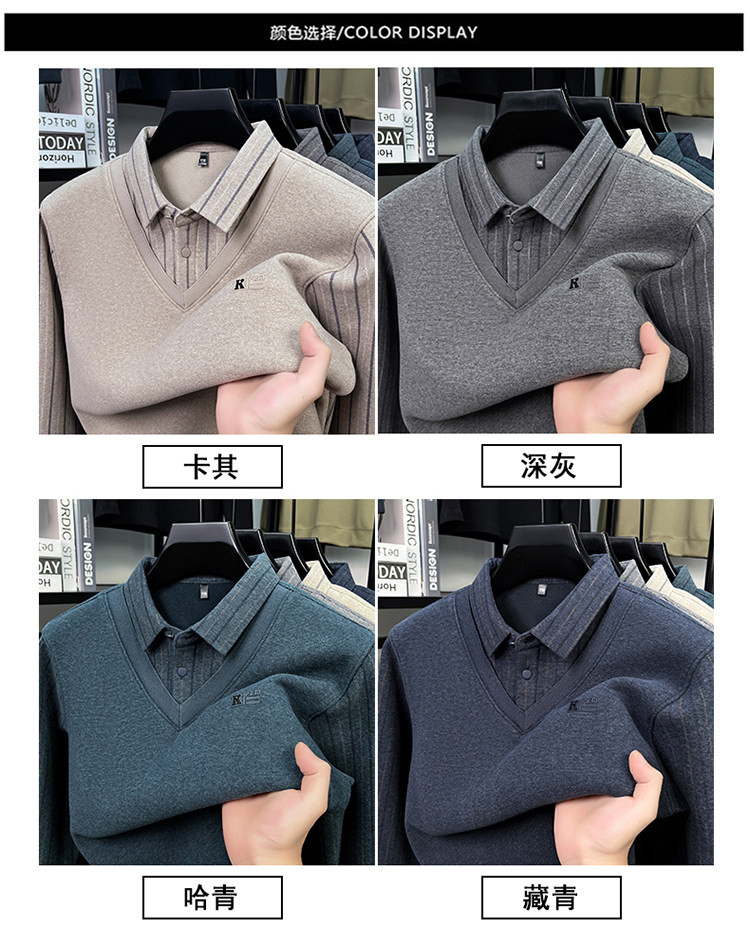 Hengyuanxiang New Autumn and Winter Men's Wool Sweater, Middle-Aged Dad's Casual Fleece-Lined Thickened Faux Two-Piece Warm Base Shirt