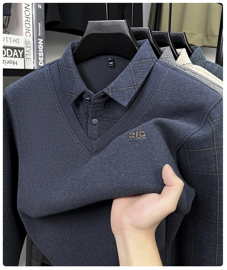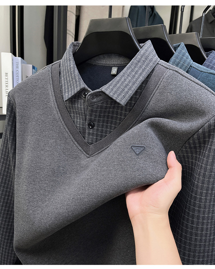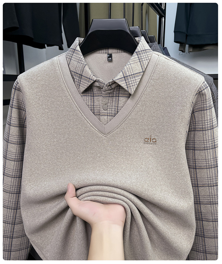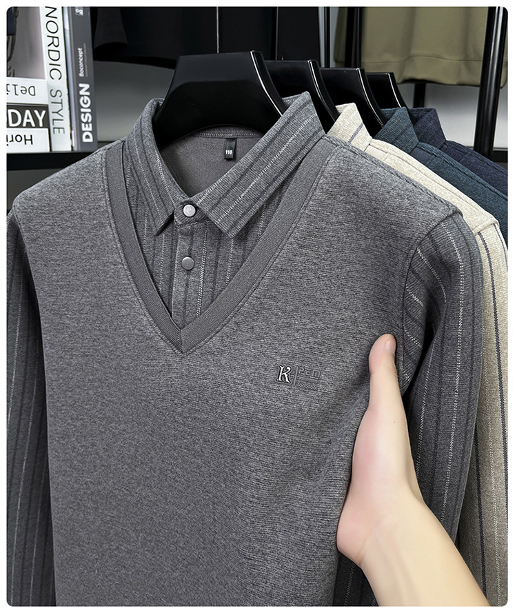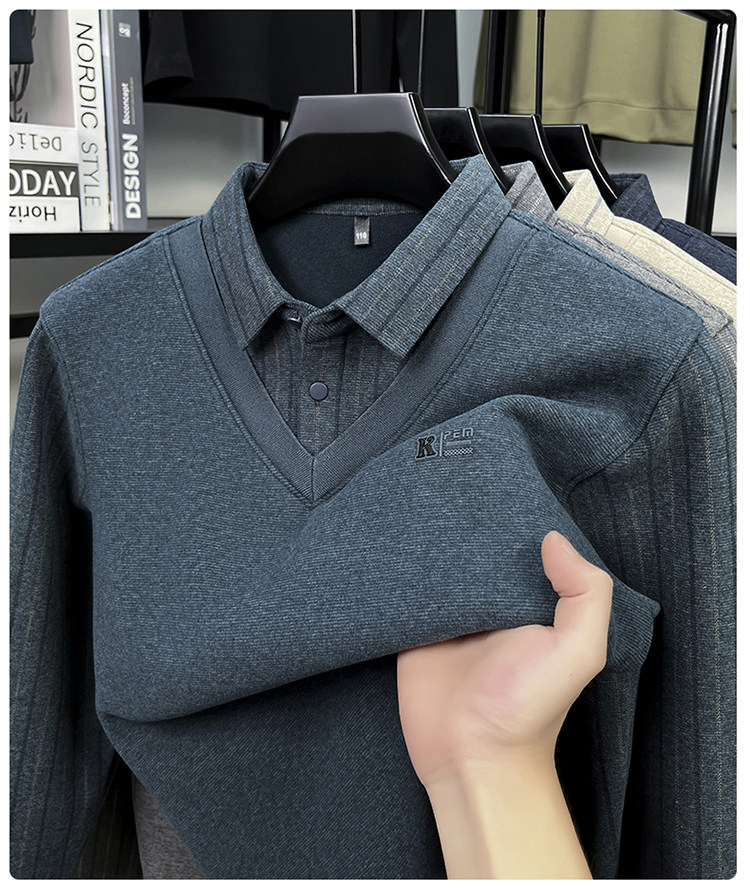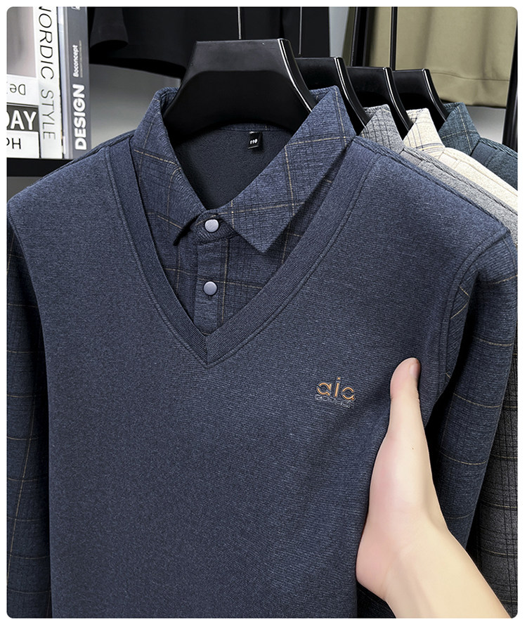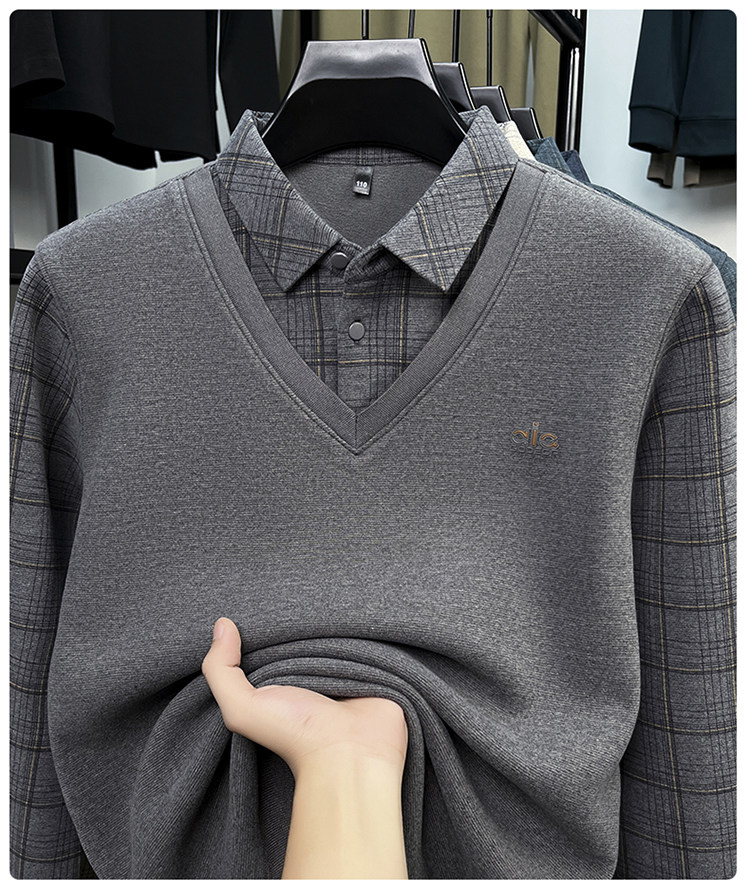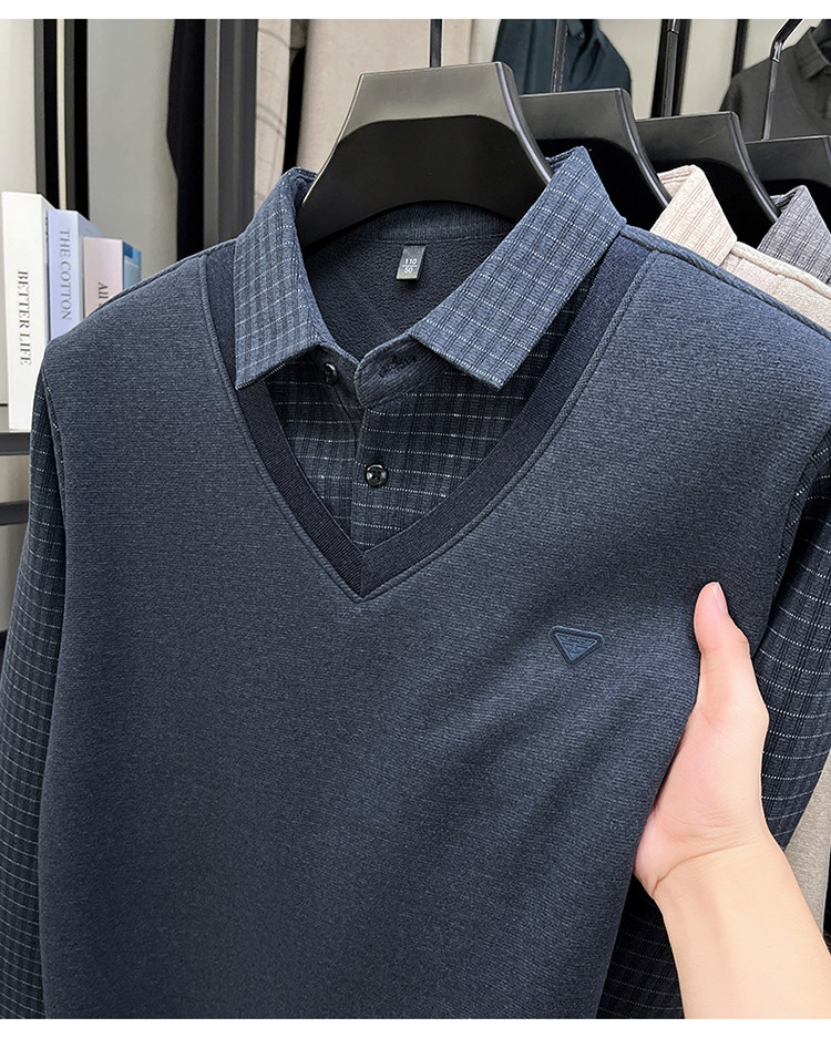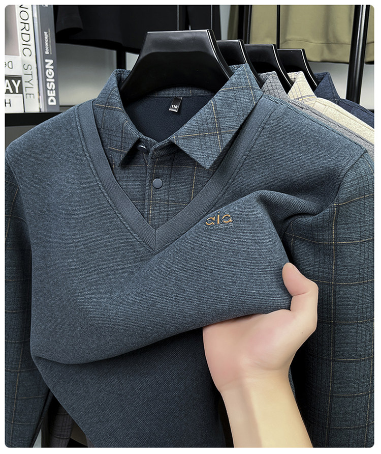 Hengyuanxiang New Autumn and Winter Men's Wool Sweater, Middle-Aged Dad's Casual Fleece-Lined Thickened Faux Two-Piece Warm Base Shirt