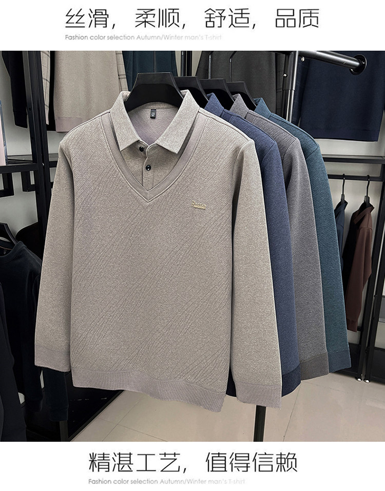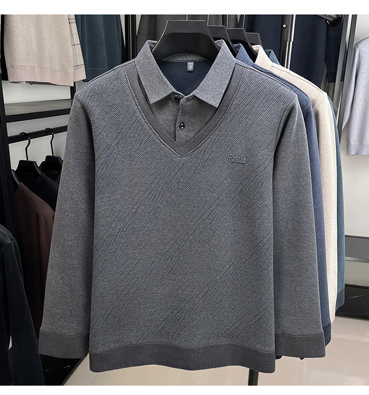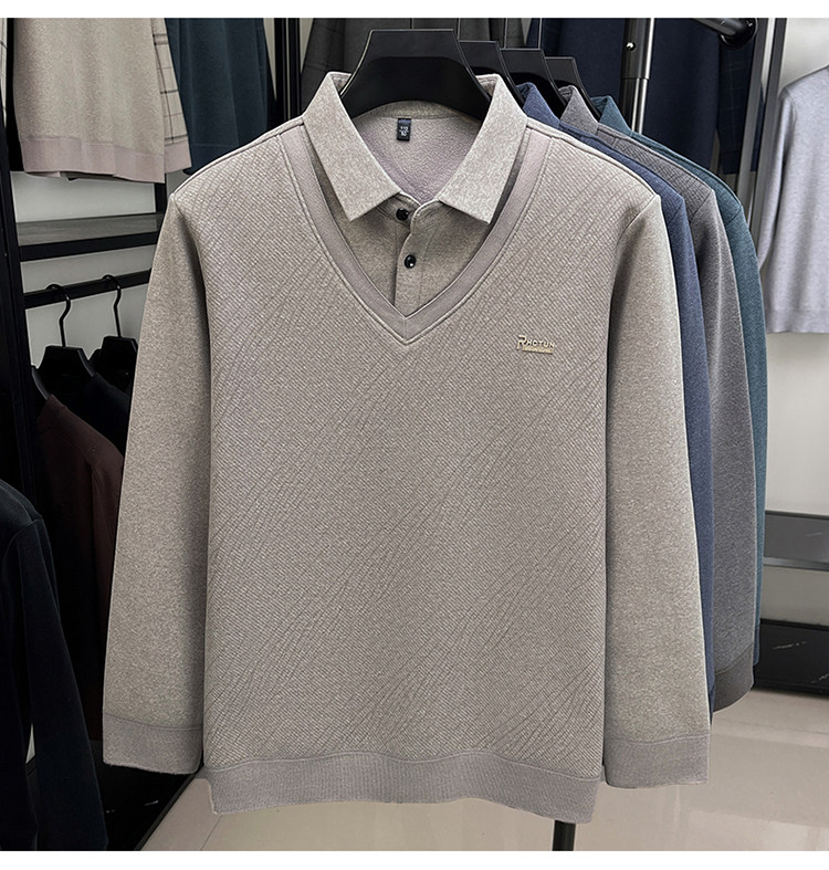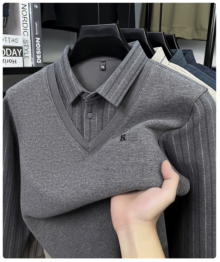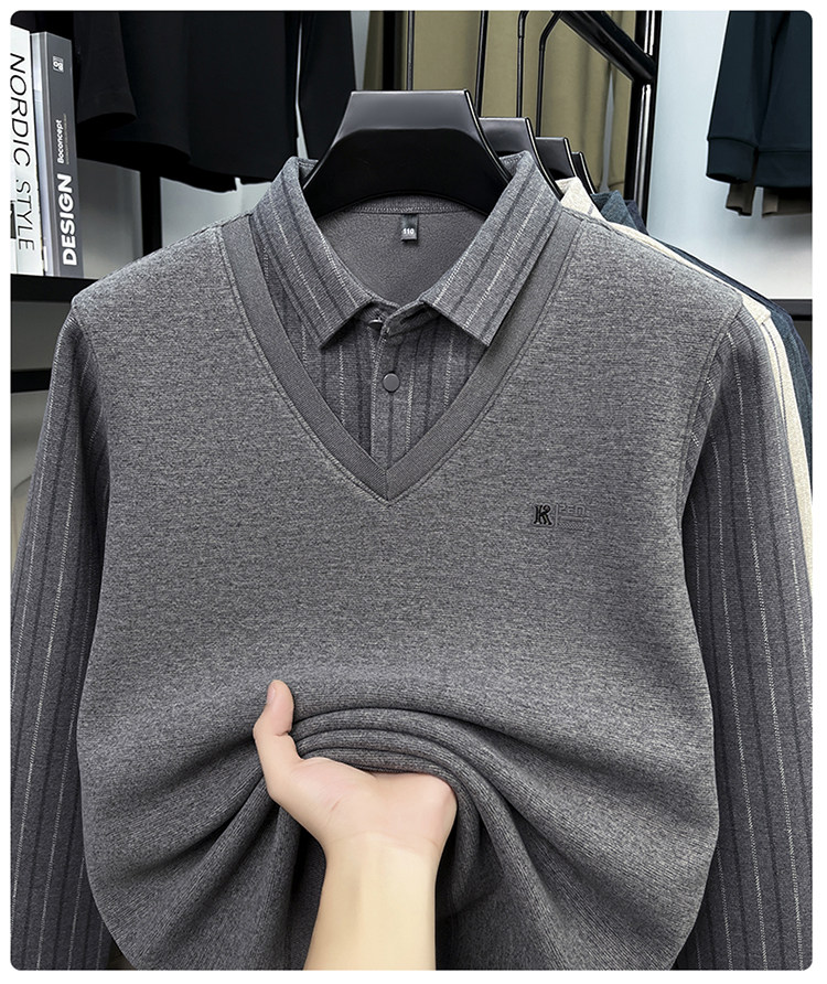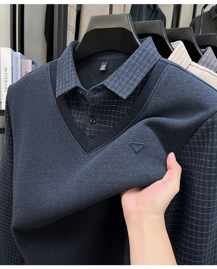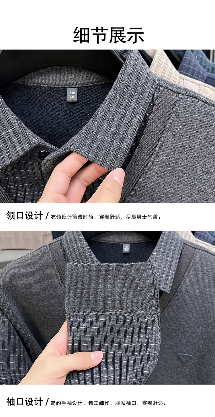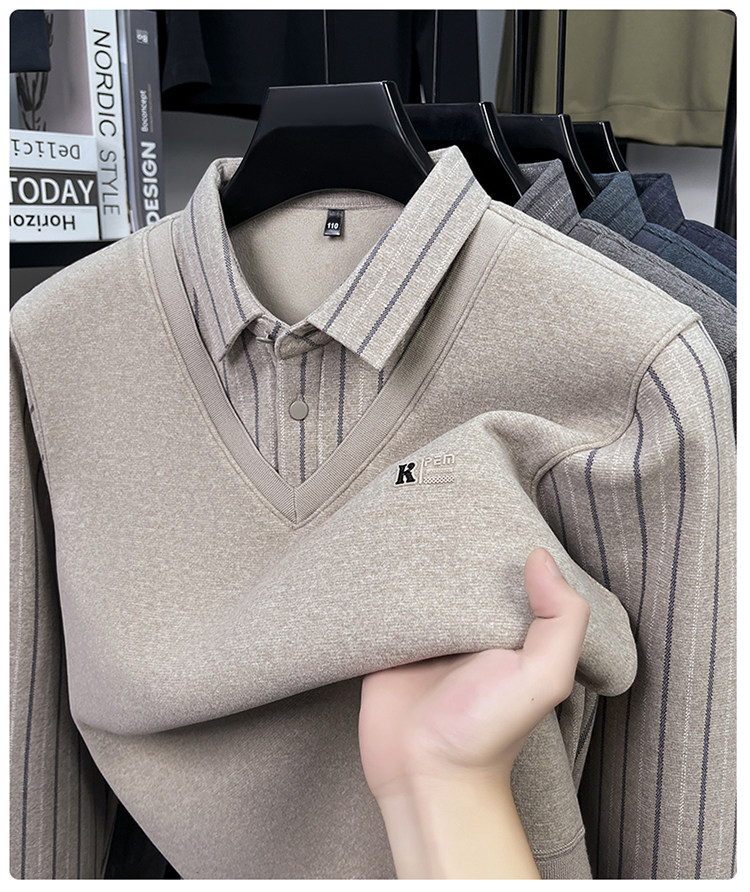 Hengyuanxiang New Autumn and Winter Men's Wool Sweater, Middle-Aged Dad's Casual Fleece-Lined Thickened Faux Two-Piece Warm Base Shirt
