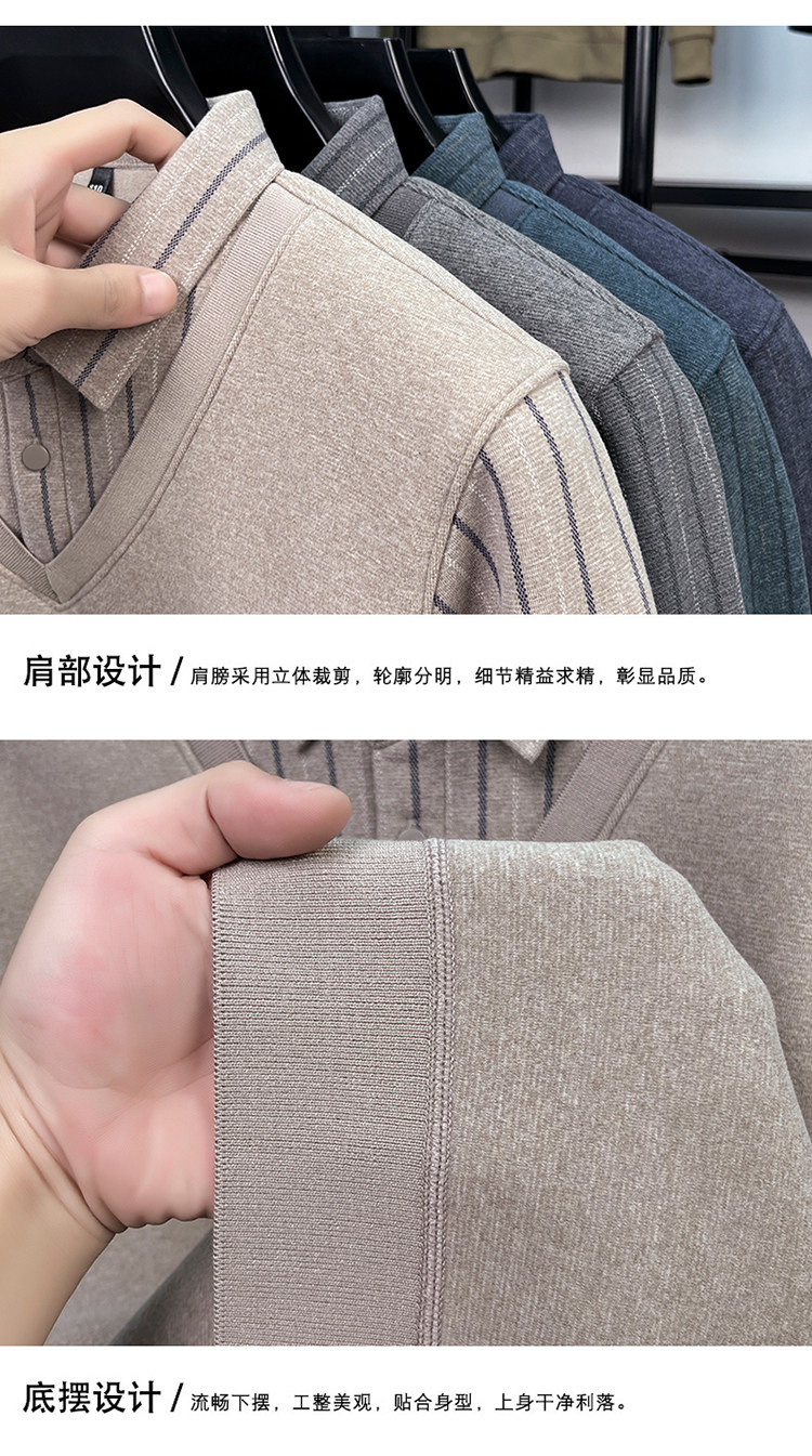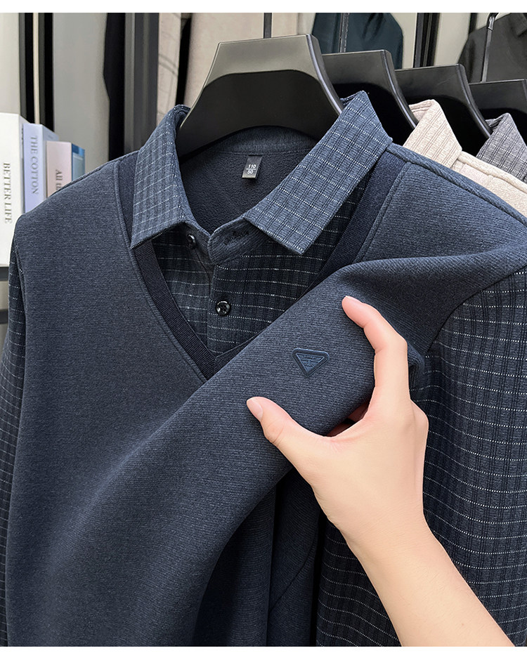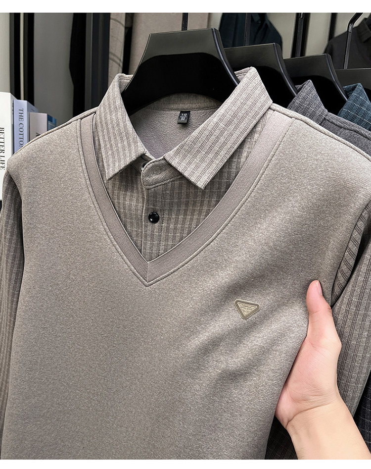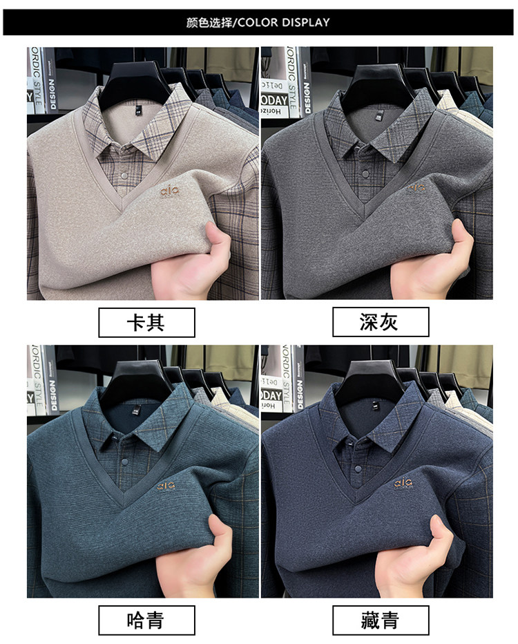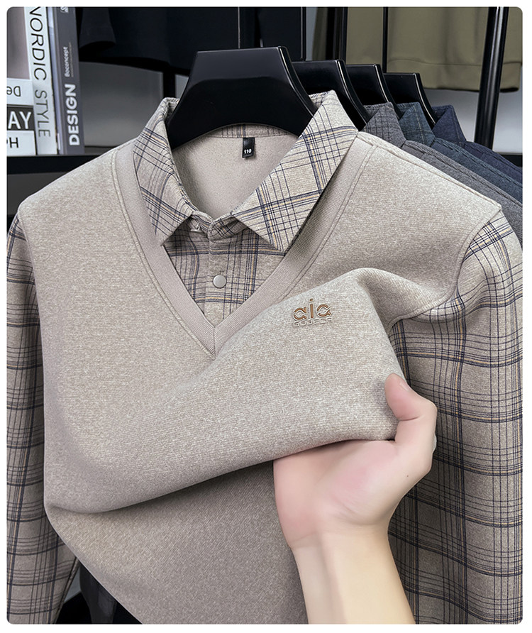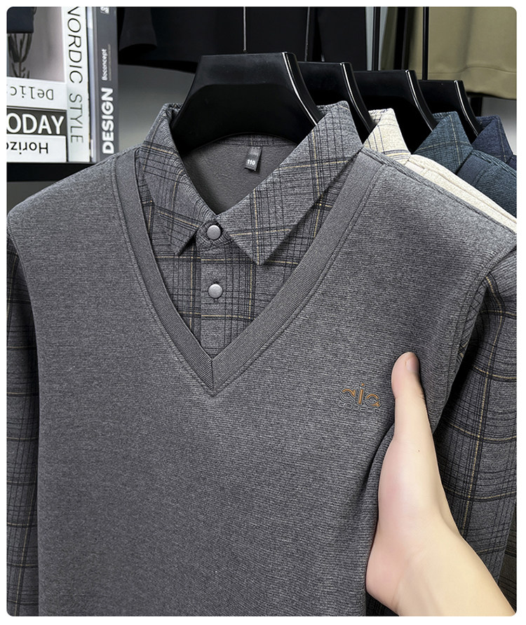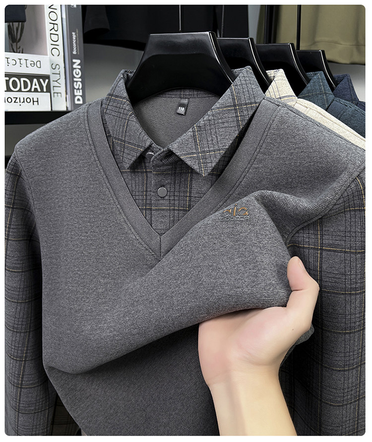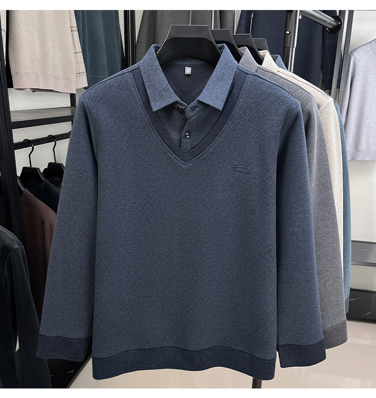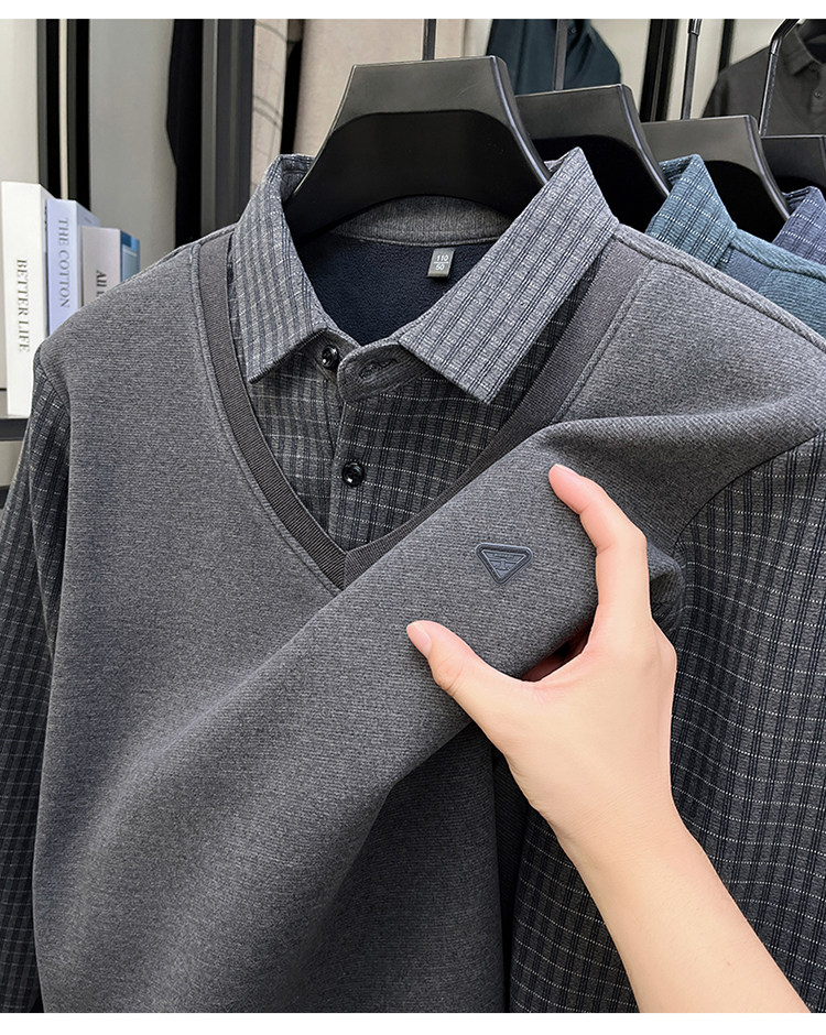 Hengyuanxiang New Autumn and Winter Men's Wool Sweater, Middle-Aged Dad's Casual Fleece-Lined Thickened Faux Two-Piece Warm Base Shirt