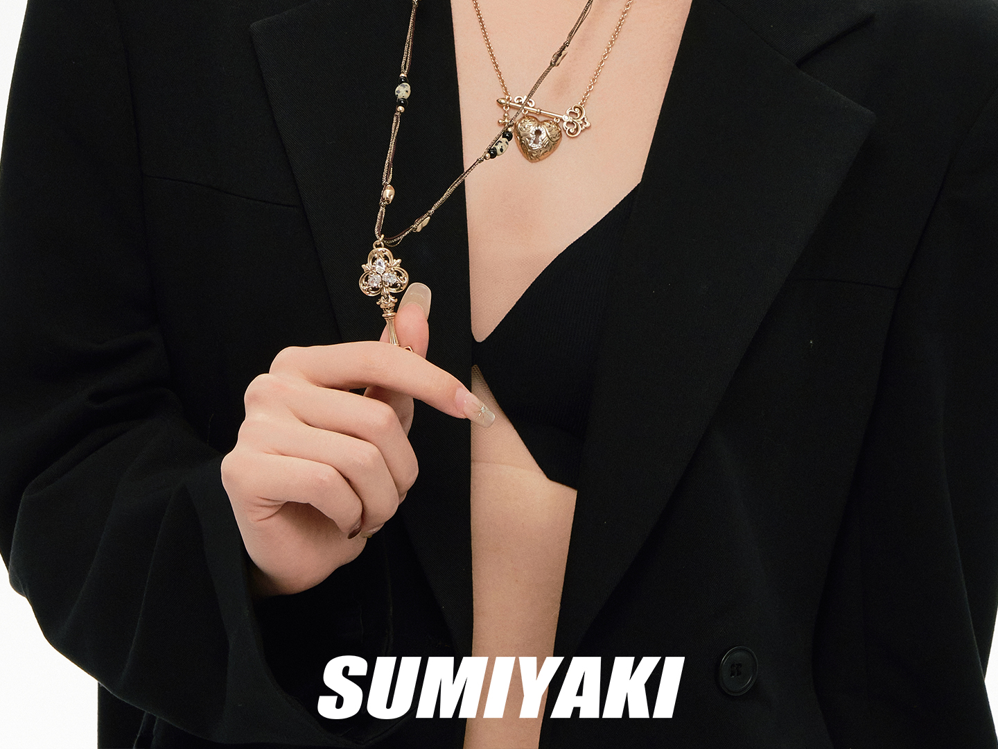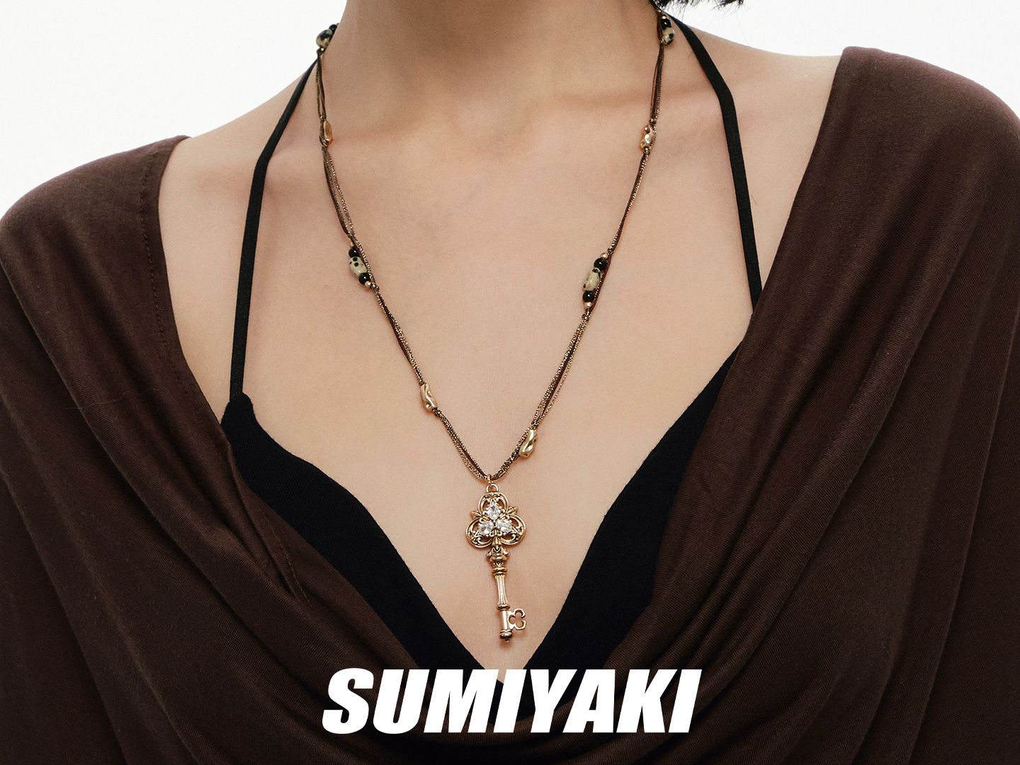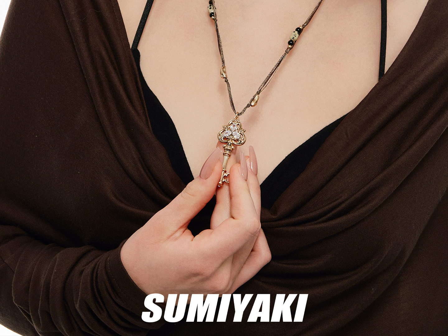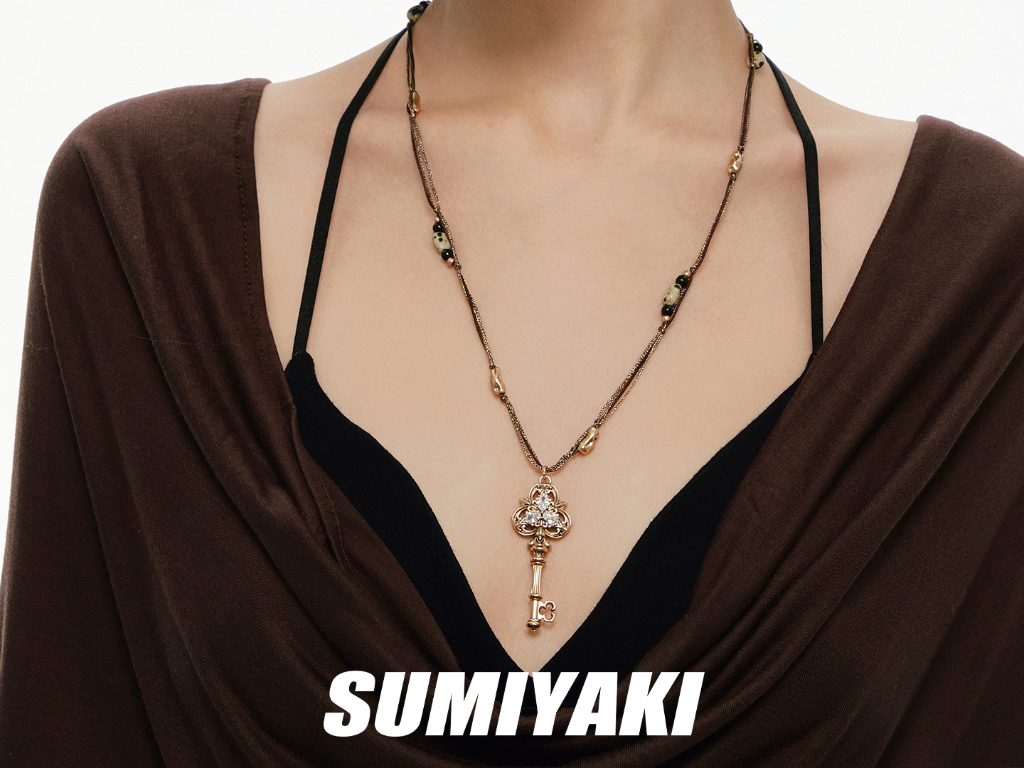 Sumiyaki Love Lock Series Embossed Key Beaded Necklace Vintage Sweater Chain for Women
