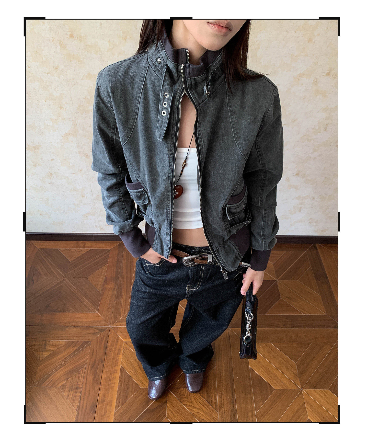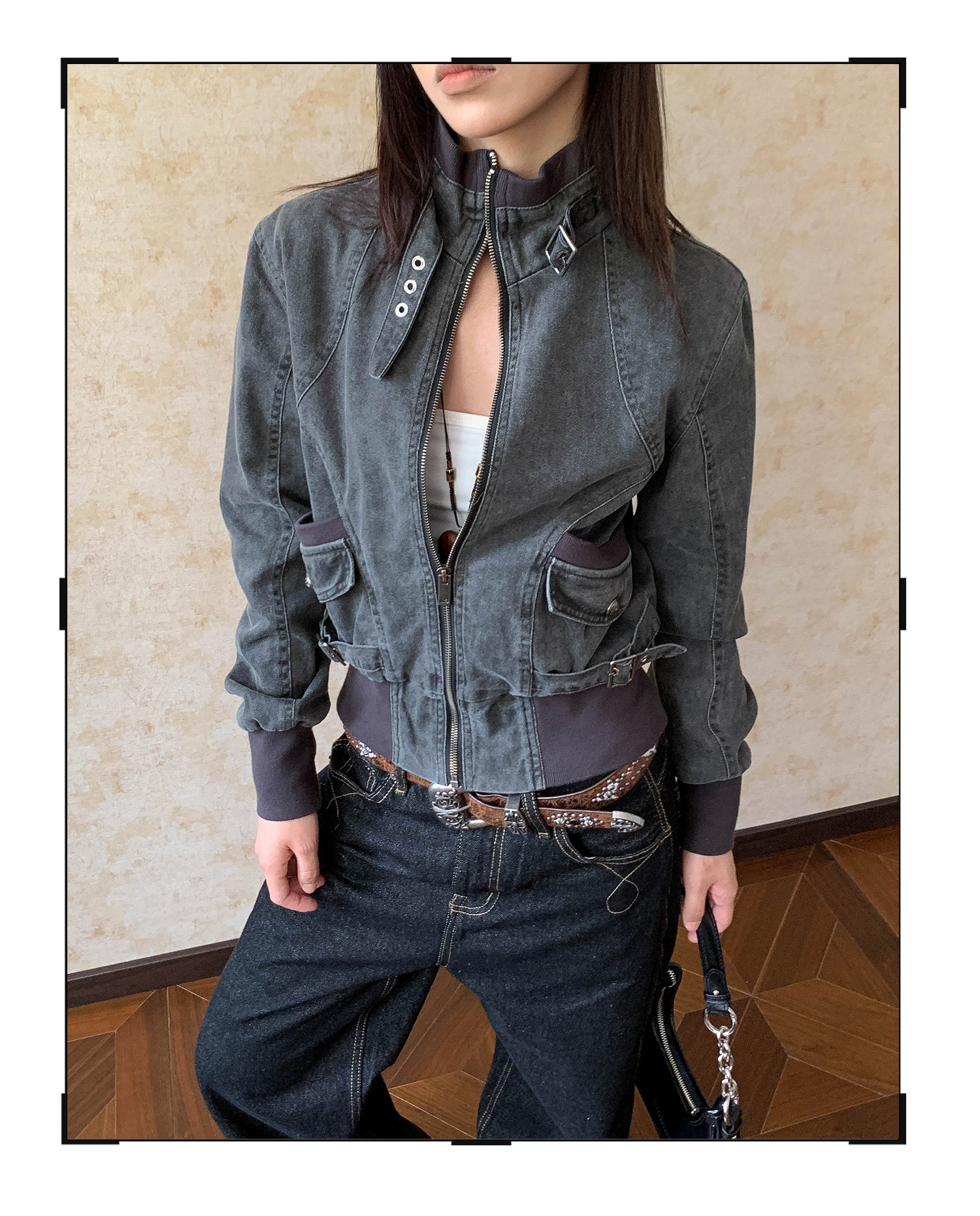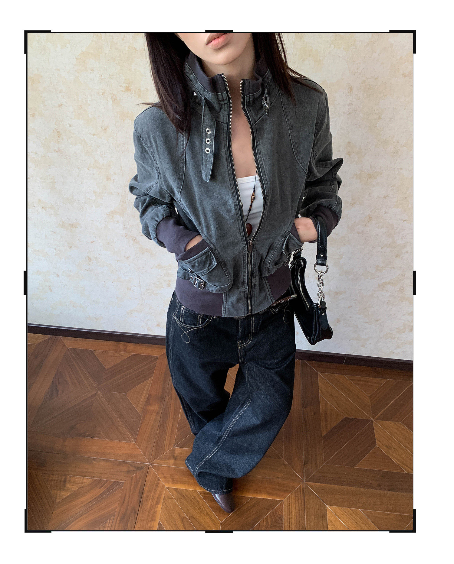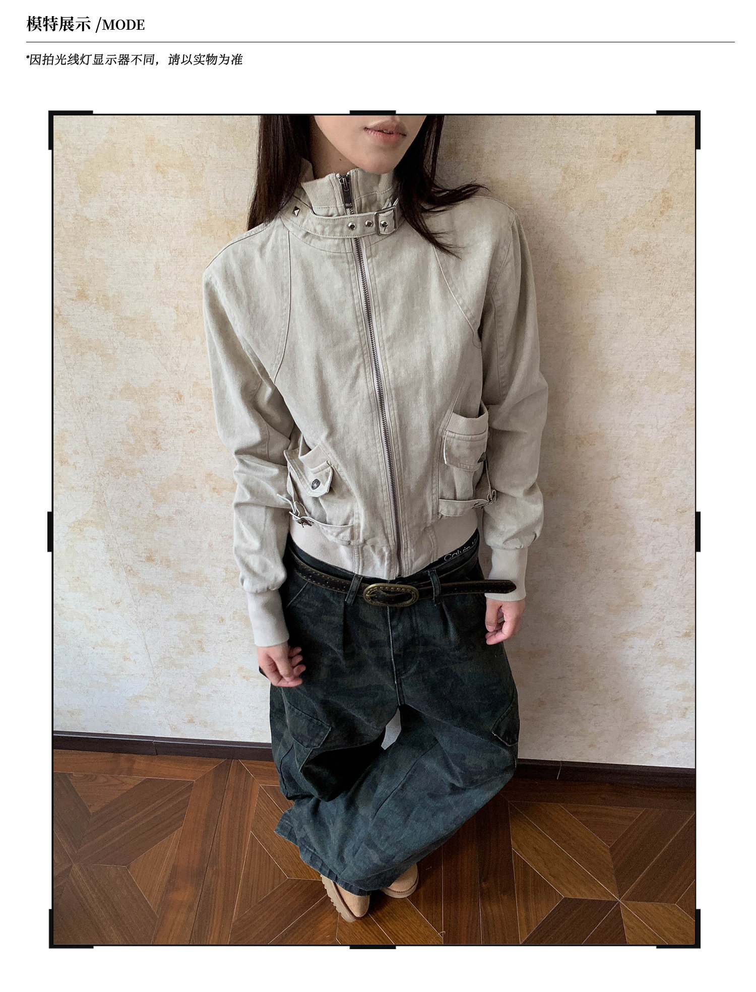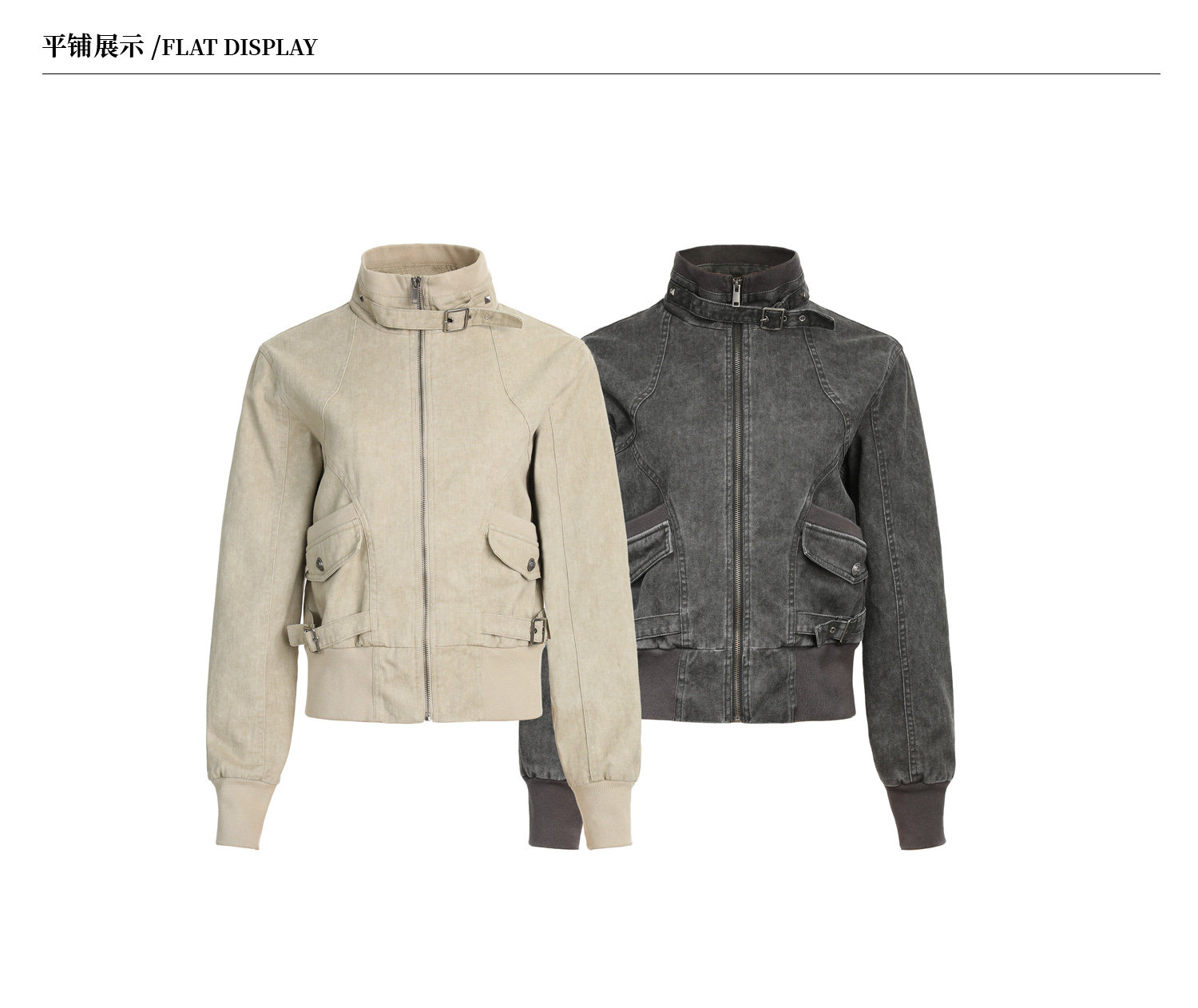 Apocket American-Style Washed Vintage Deconstructed Design Workwear Jacket with Stand Collar, Slim Fit, Short Coat for Women