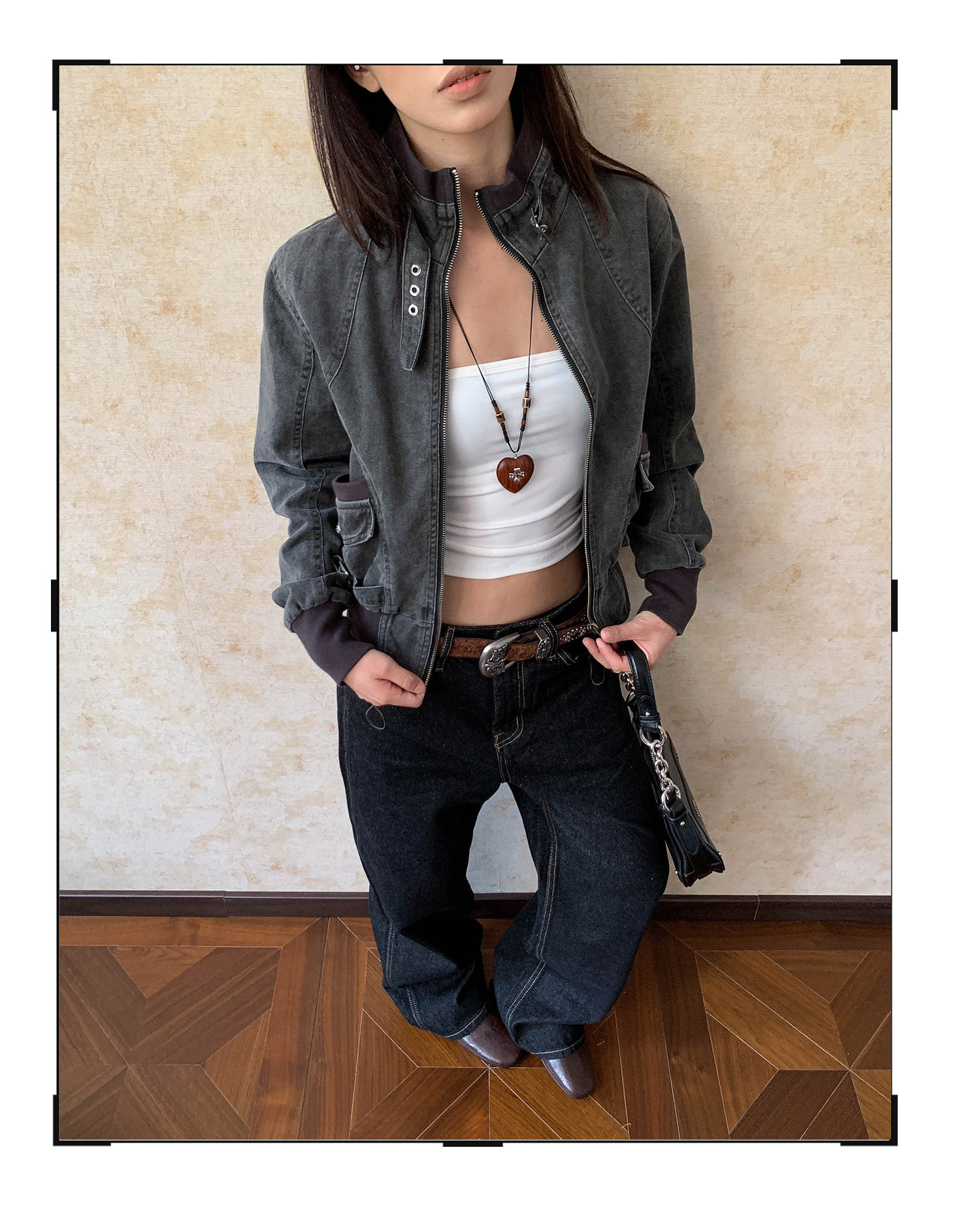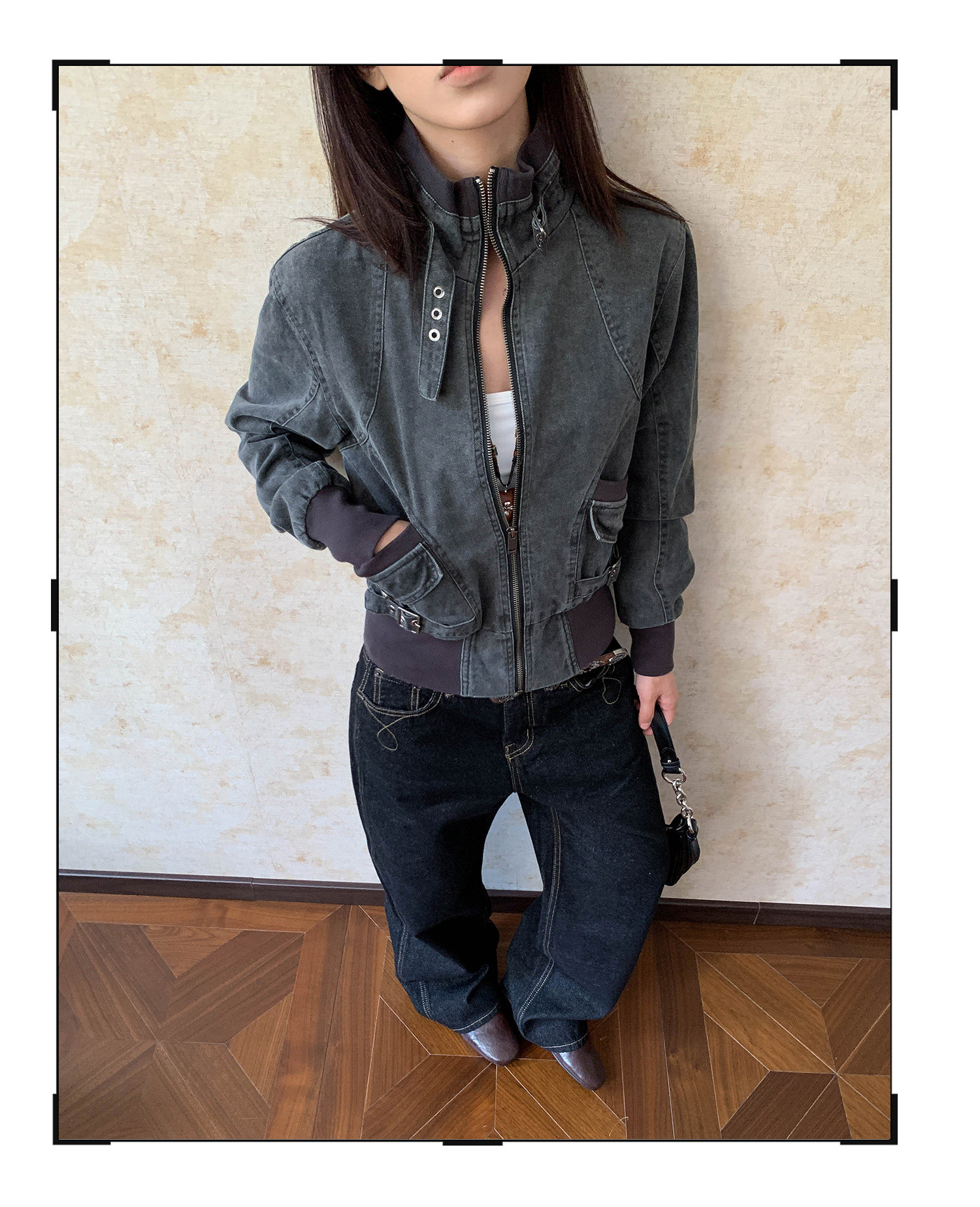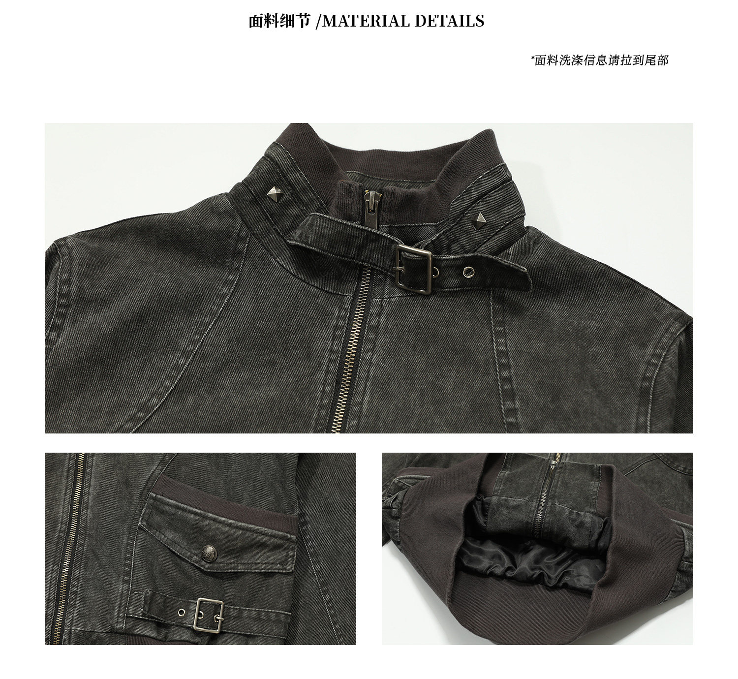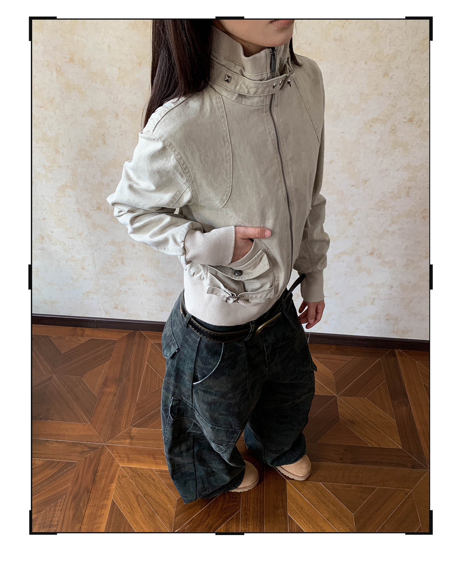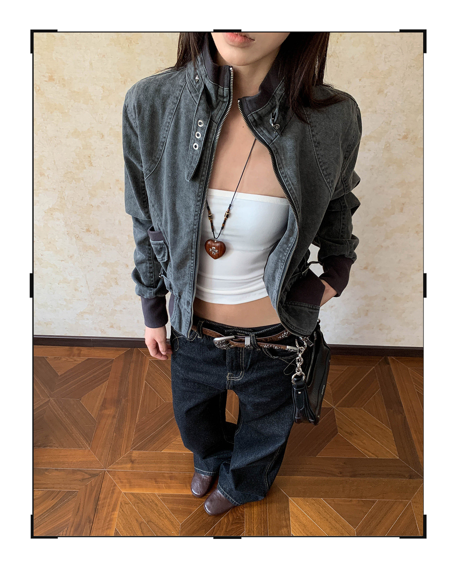 Apocket American-Style Washed Vintage Deconstructed Design Workwear Jacket with Stand Collar, Slim Fit, Short Coat for Women