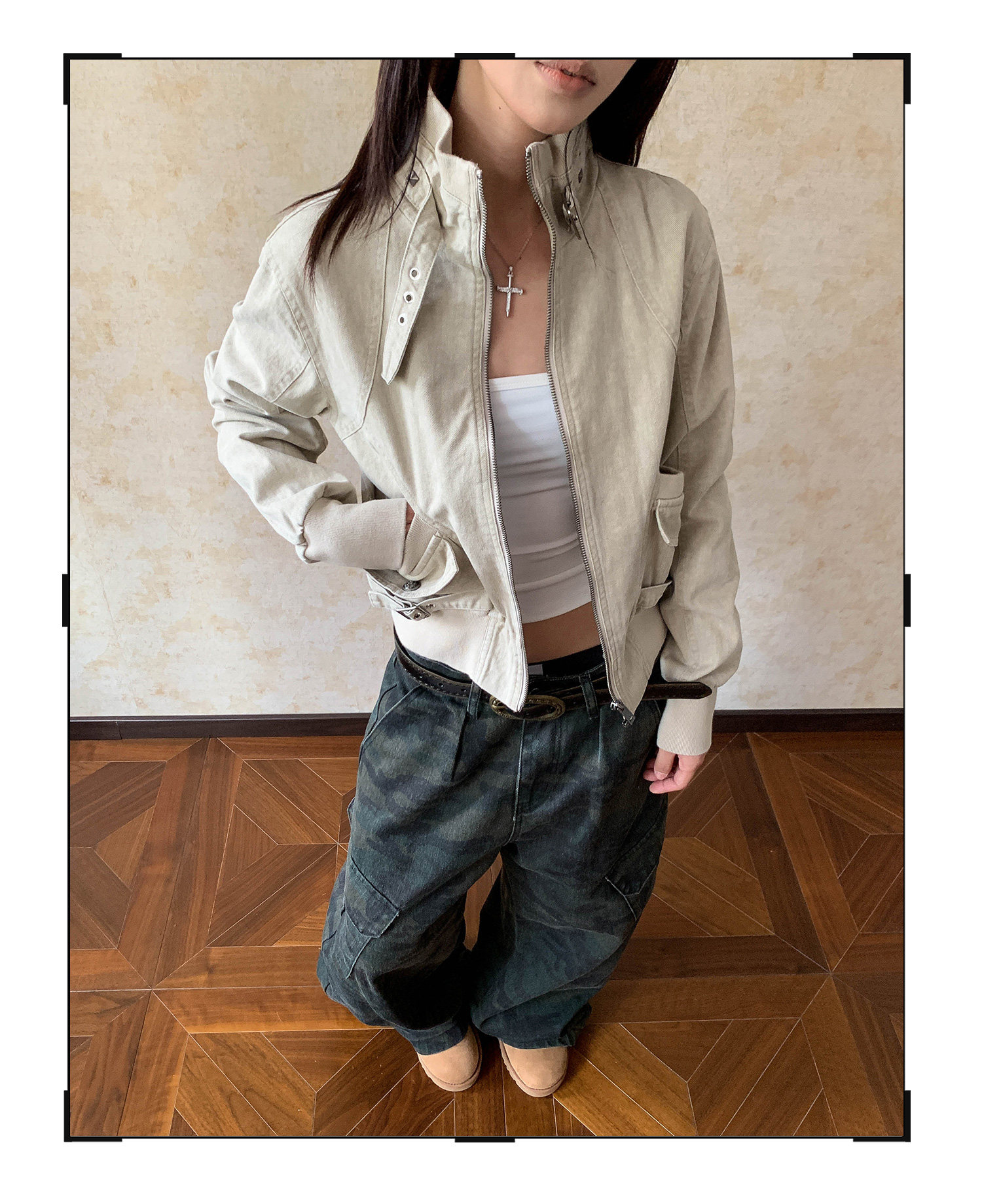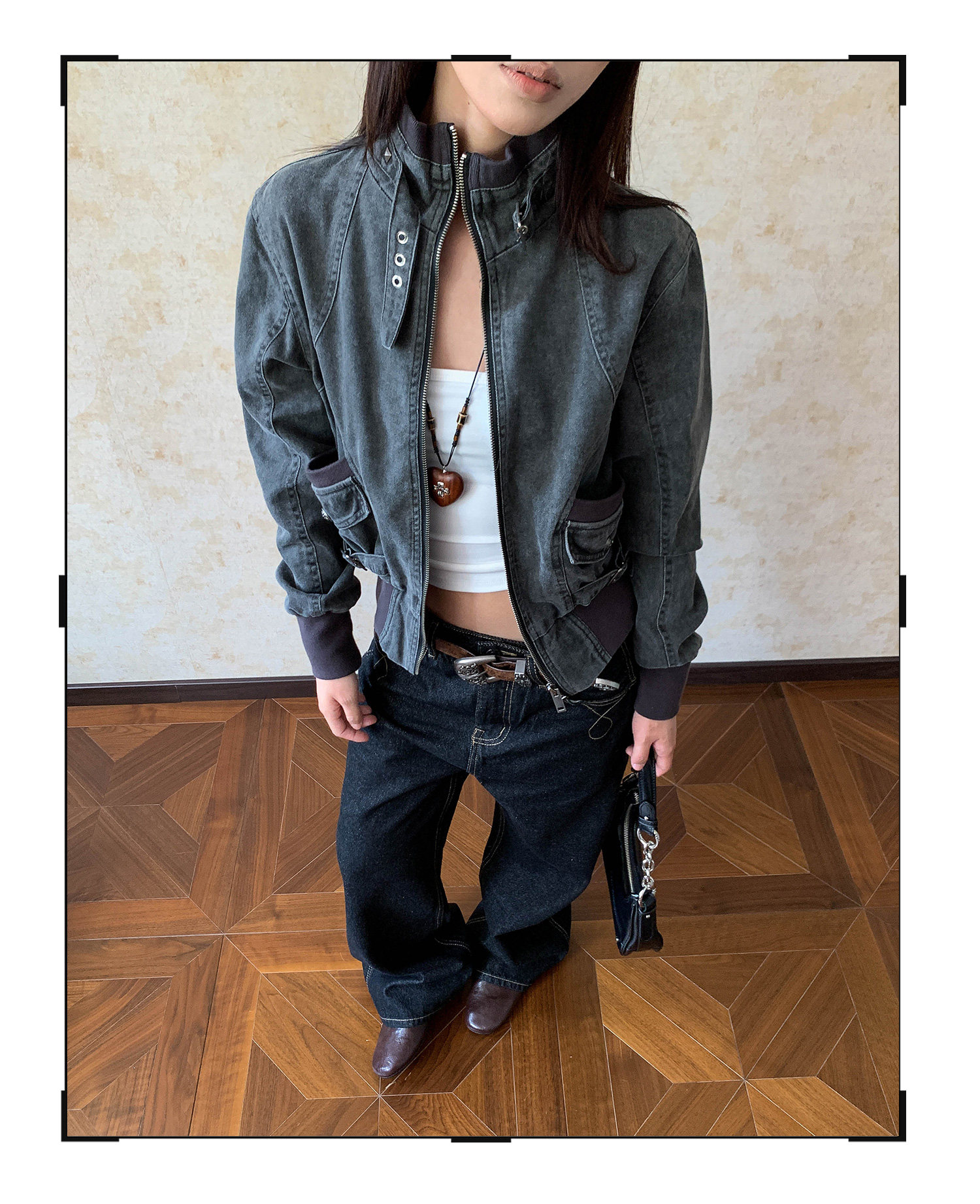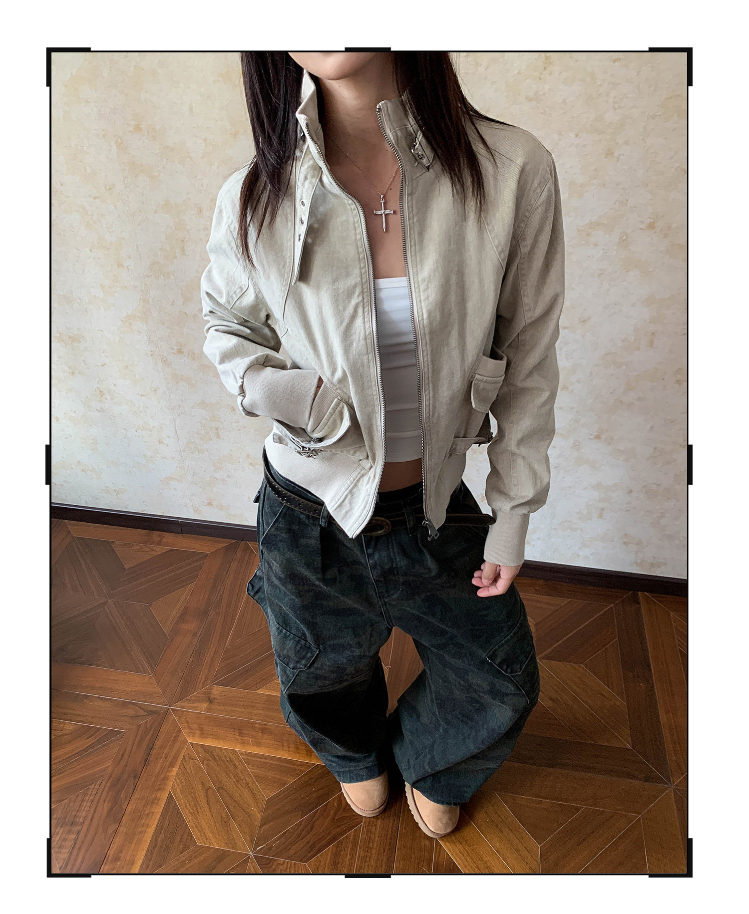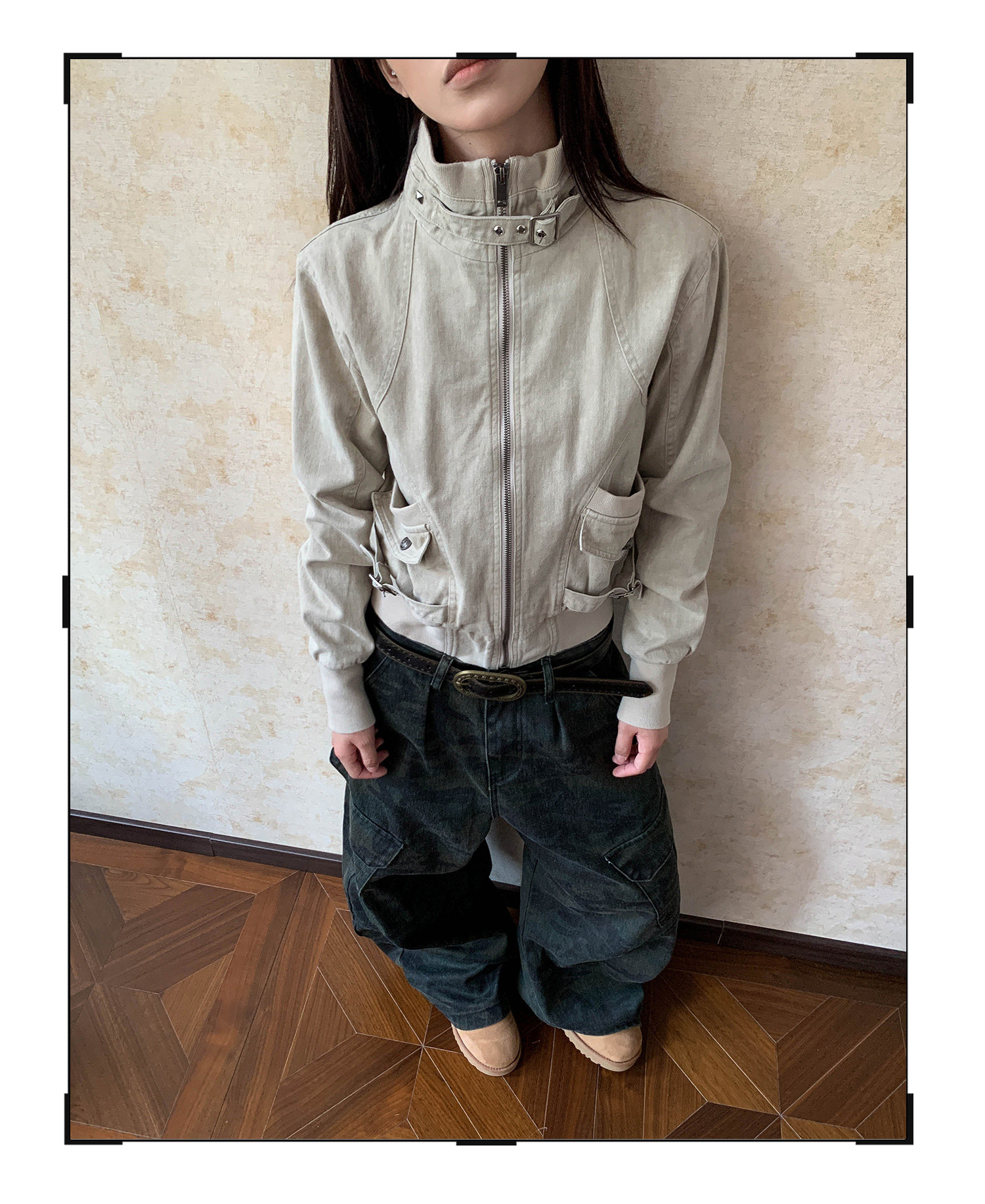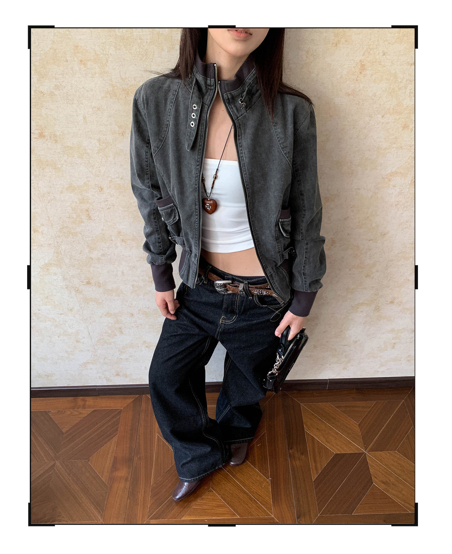 Apocket American-Style Washed Vintage Deconstructed Design Workwear Jacket with Stand Collar, Slim Fit, Short Coat for Women
