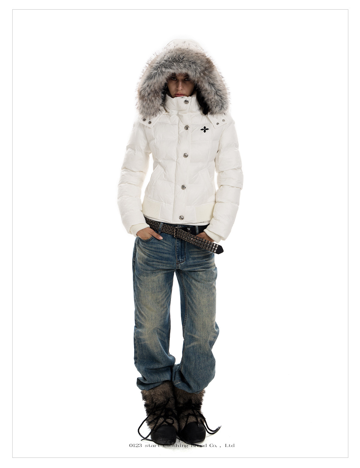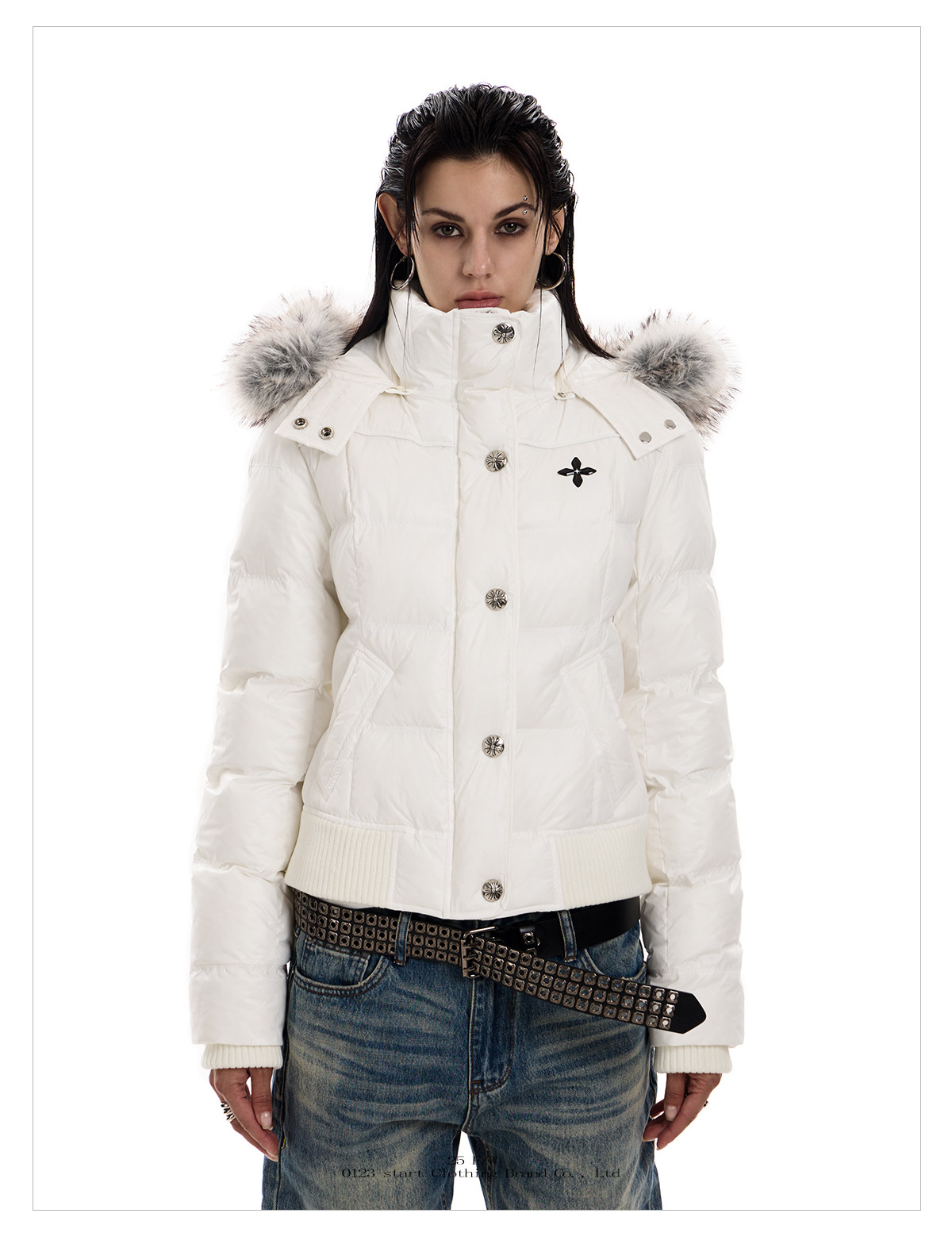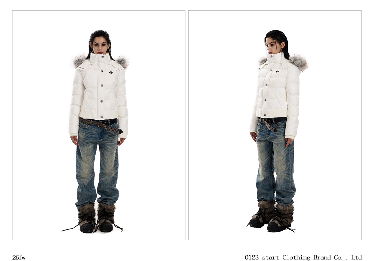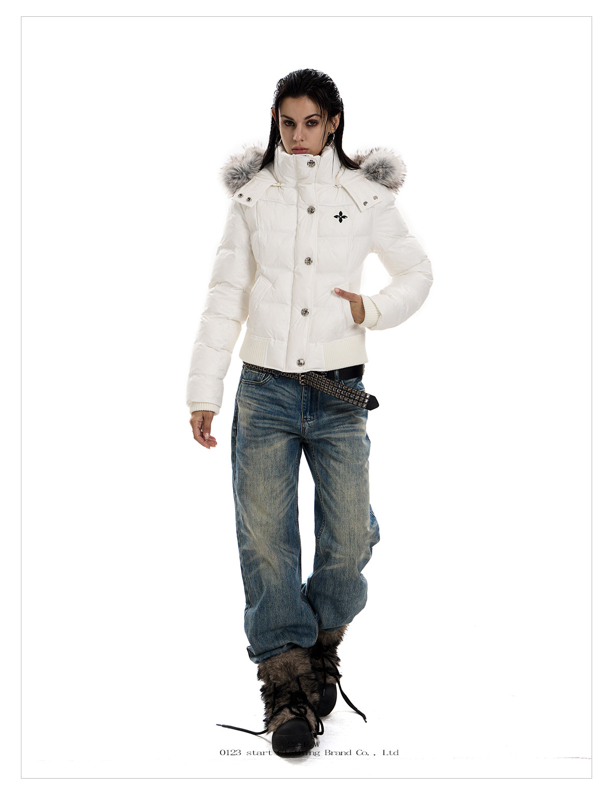 0123Start Fur Collar Slim Fit Hooded Cotton Jacket for Women Trendy Brand Winter New Warm Short White Cotton Coat