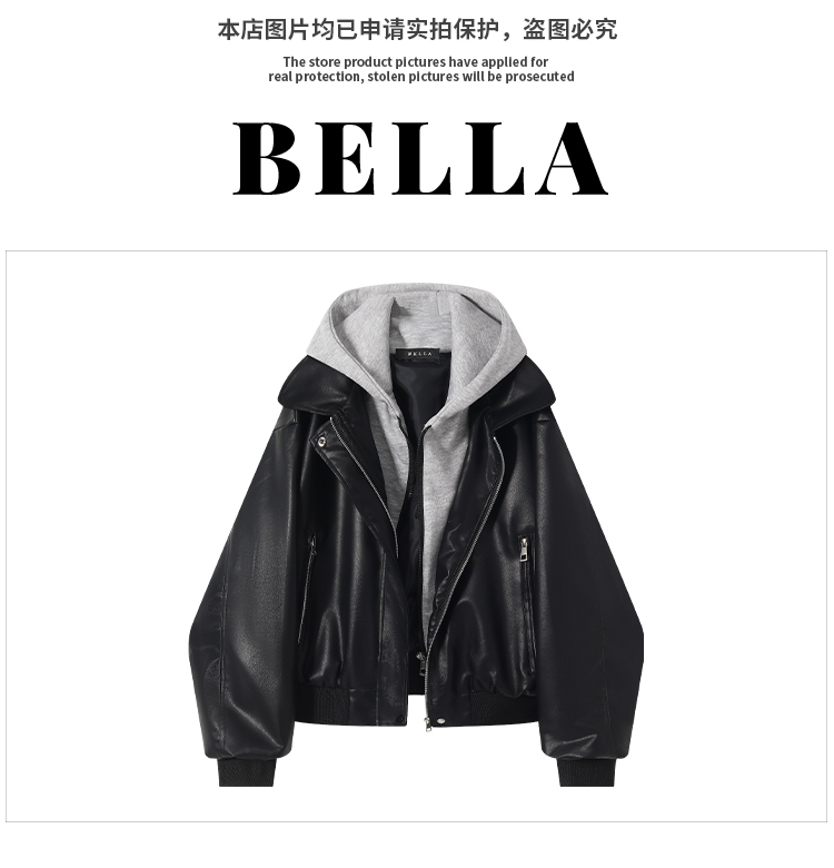 Bella Black Faux Two-Piece Hooded Leather Jacket for Women, Autumn and Winter Vintage High-End Loose Pu Leather Biker Jacket