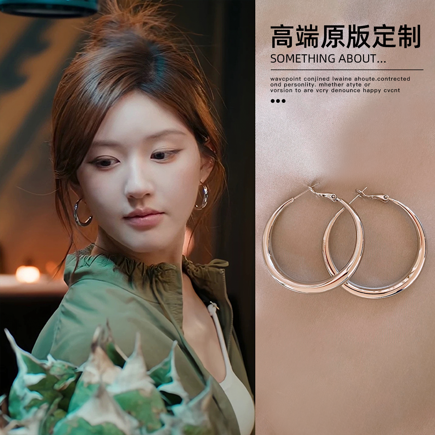 Xu Yan's Same Style Silver Large Hoop Earrings for Women 2025 New Popular Light Luxury High-End Earrings Plain Hoop Ear Accessories