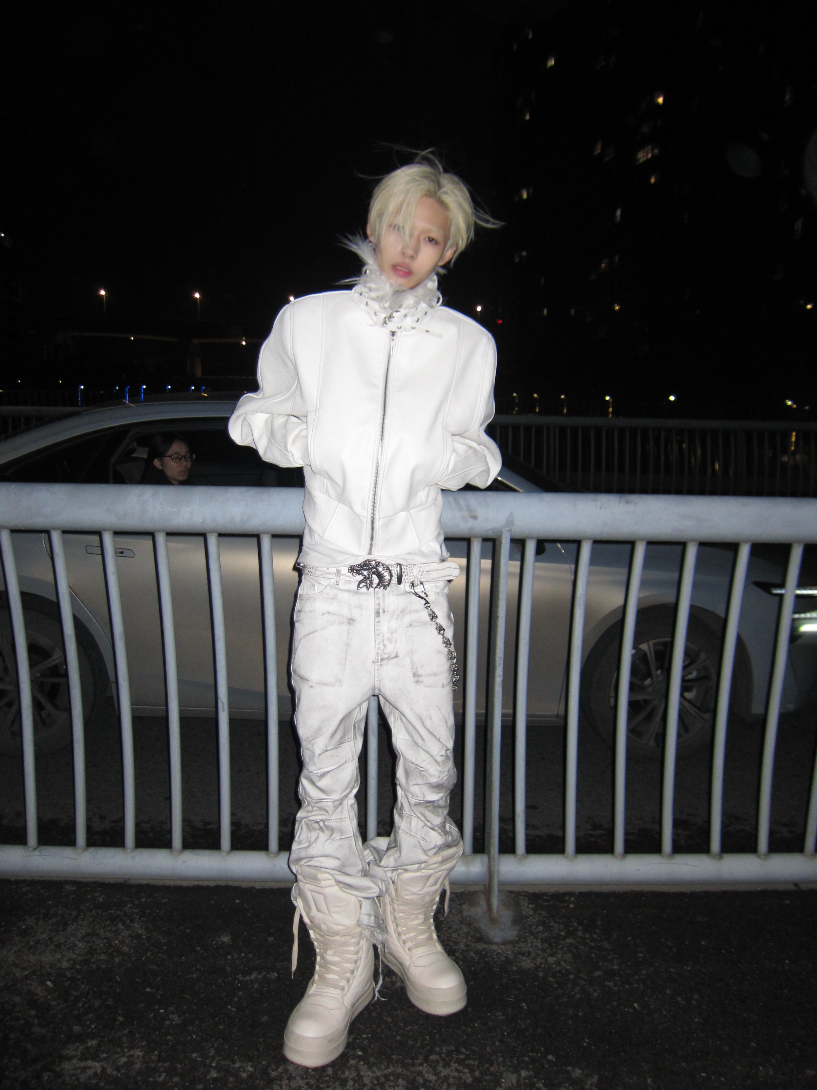 Rebel Wave【Same Style as Psy.P】White Devil Fur Collar Leather Jacket with Detachable Strap Design