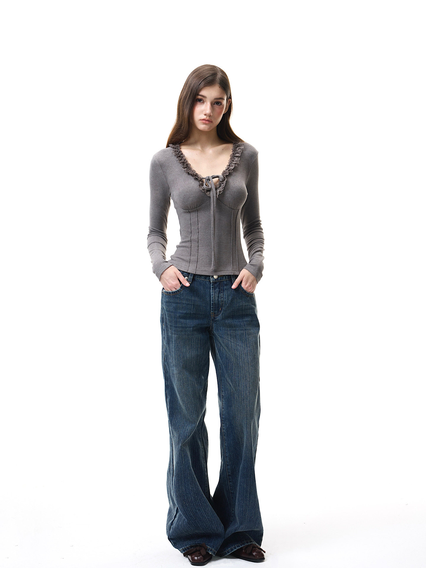Fri11 Brushed Lace Trim Versatile Tie Long-Sleeve Autumn and Winter Base Layer