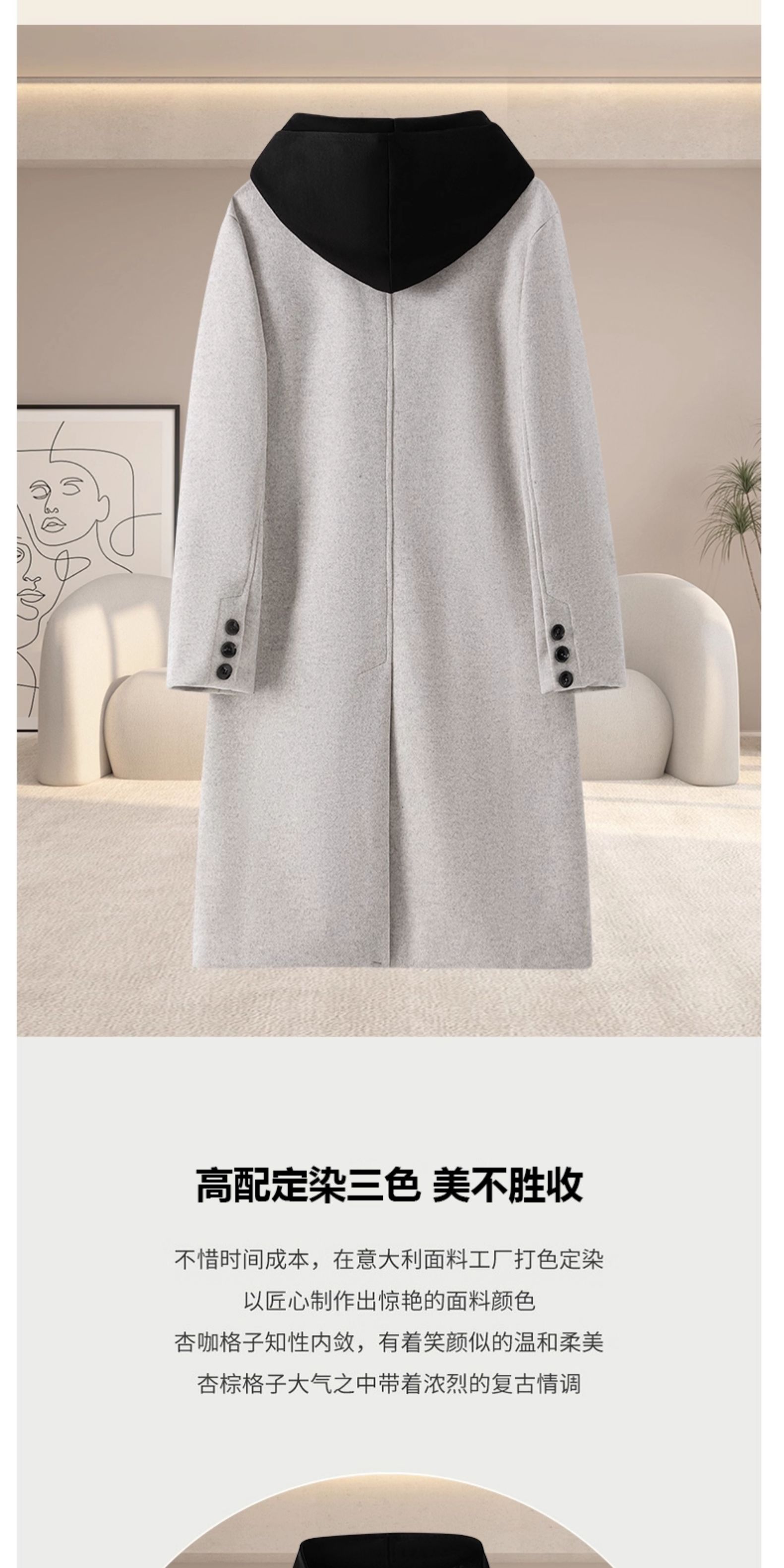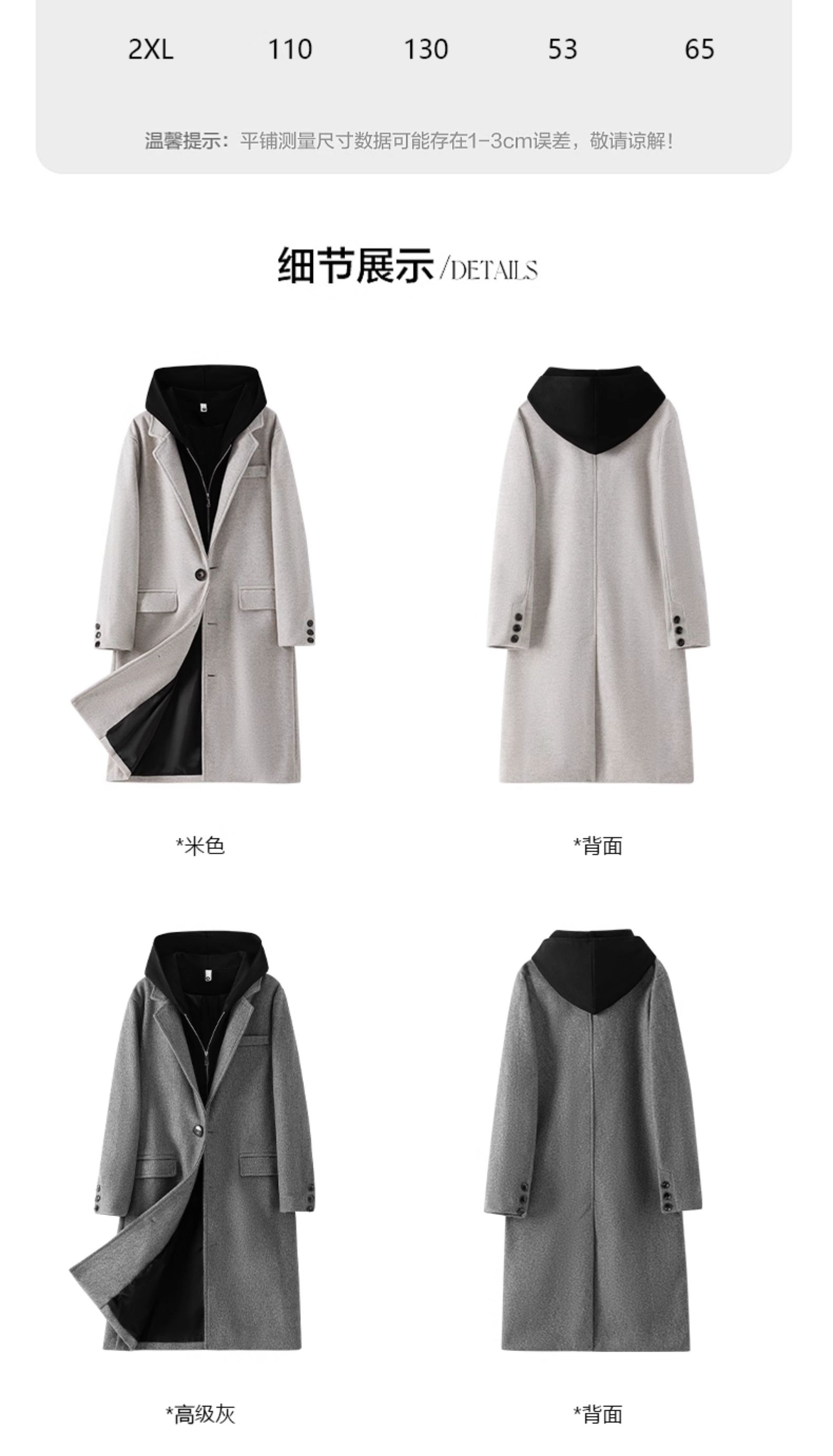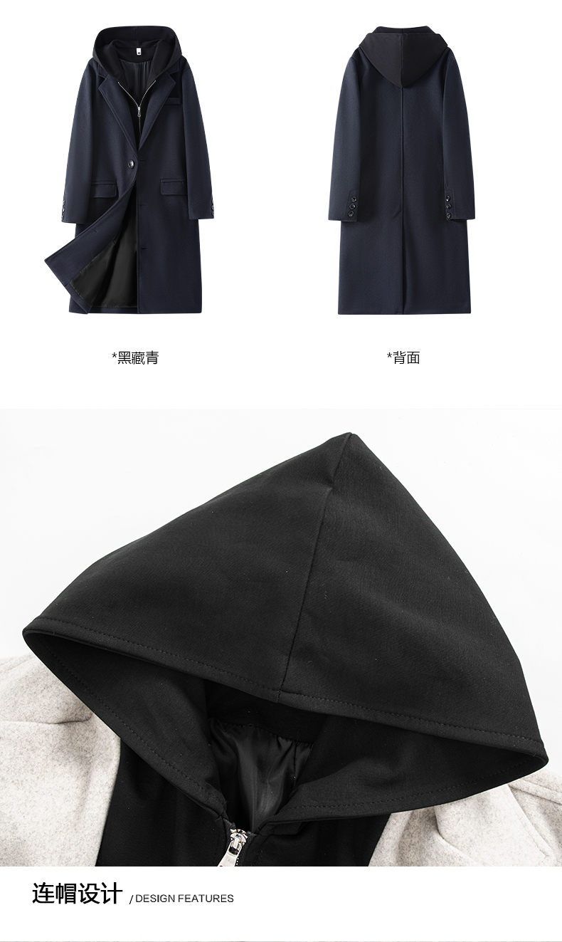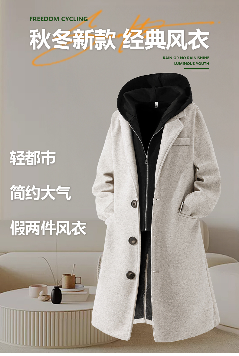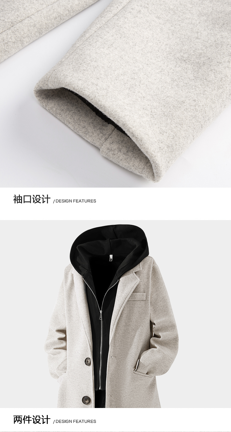 Wassup Issue American Style Mid-Length Hooded Woolen Coat for Men, Autumn and Winter Fake Two-Piece Trench Coat for Men