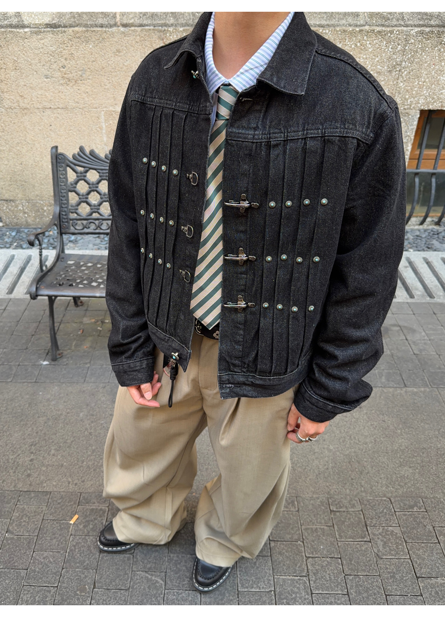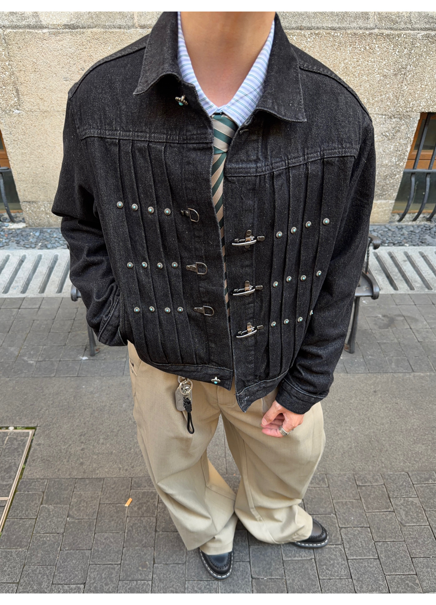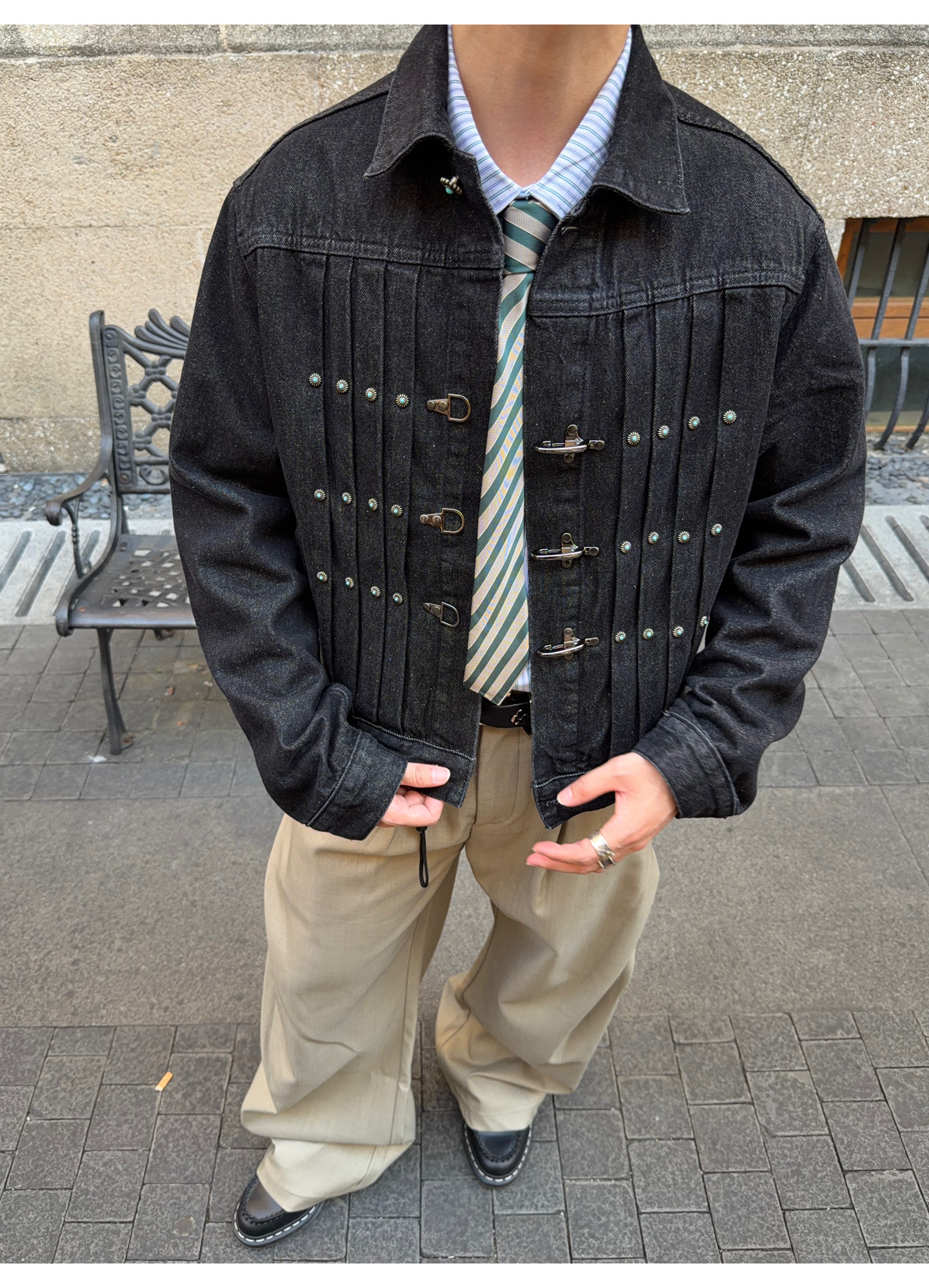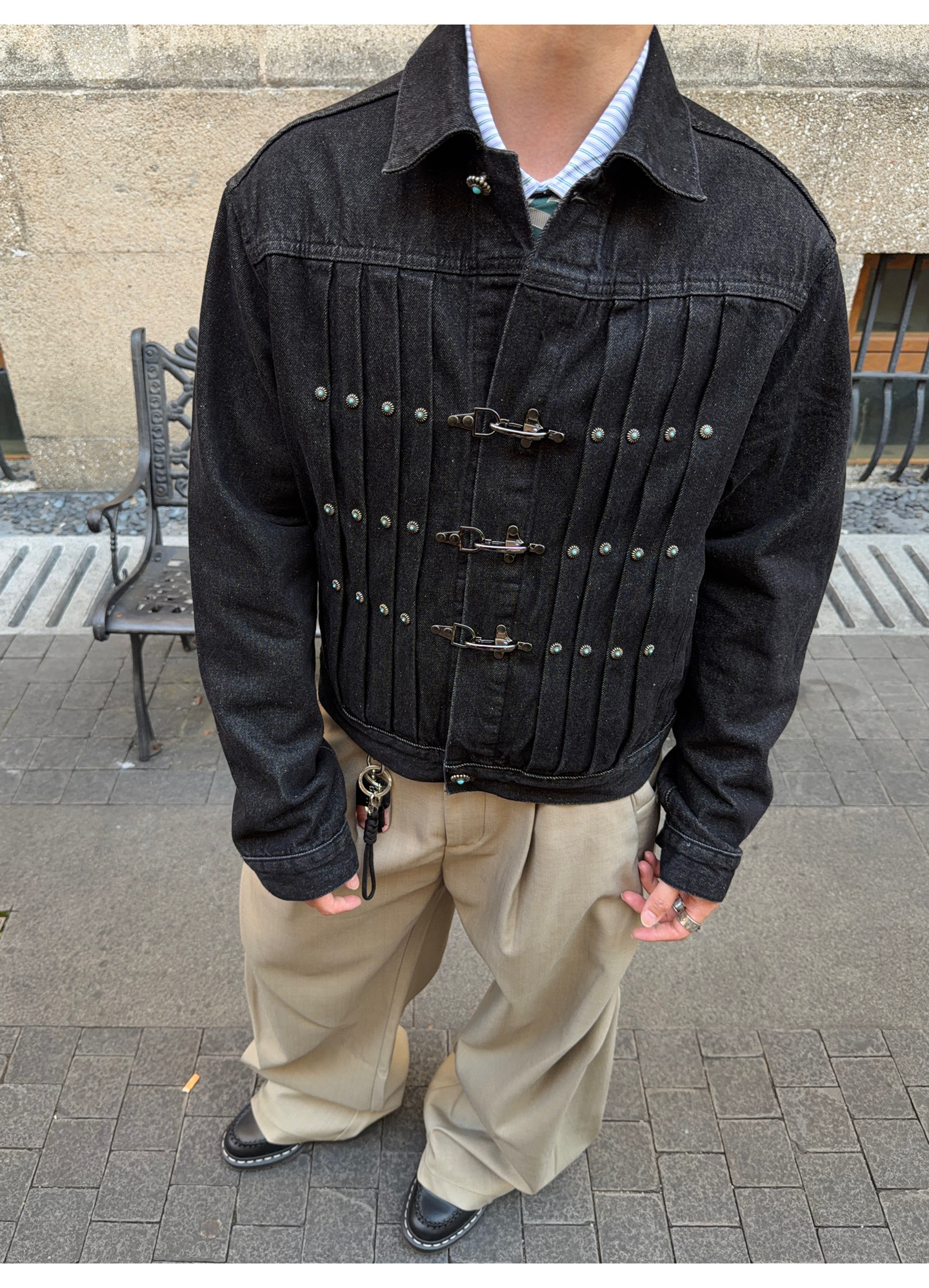 Fateegg American Retro Short Original Denim Jacket Boxy Casual Pleated Design with Airplane Buckle Coat