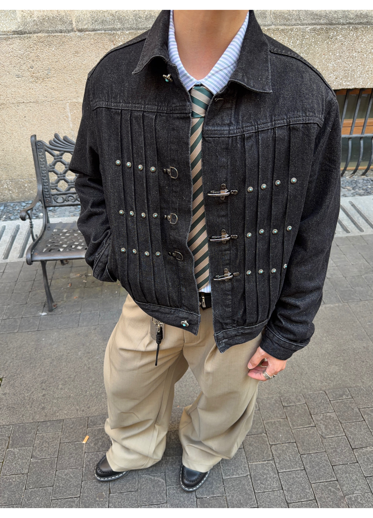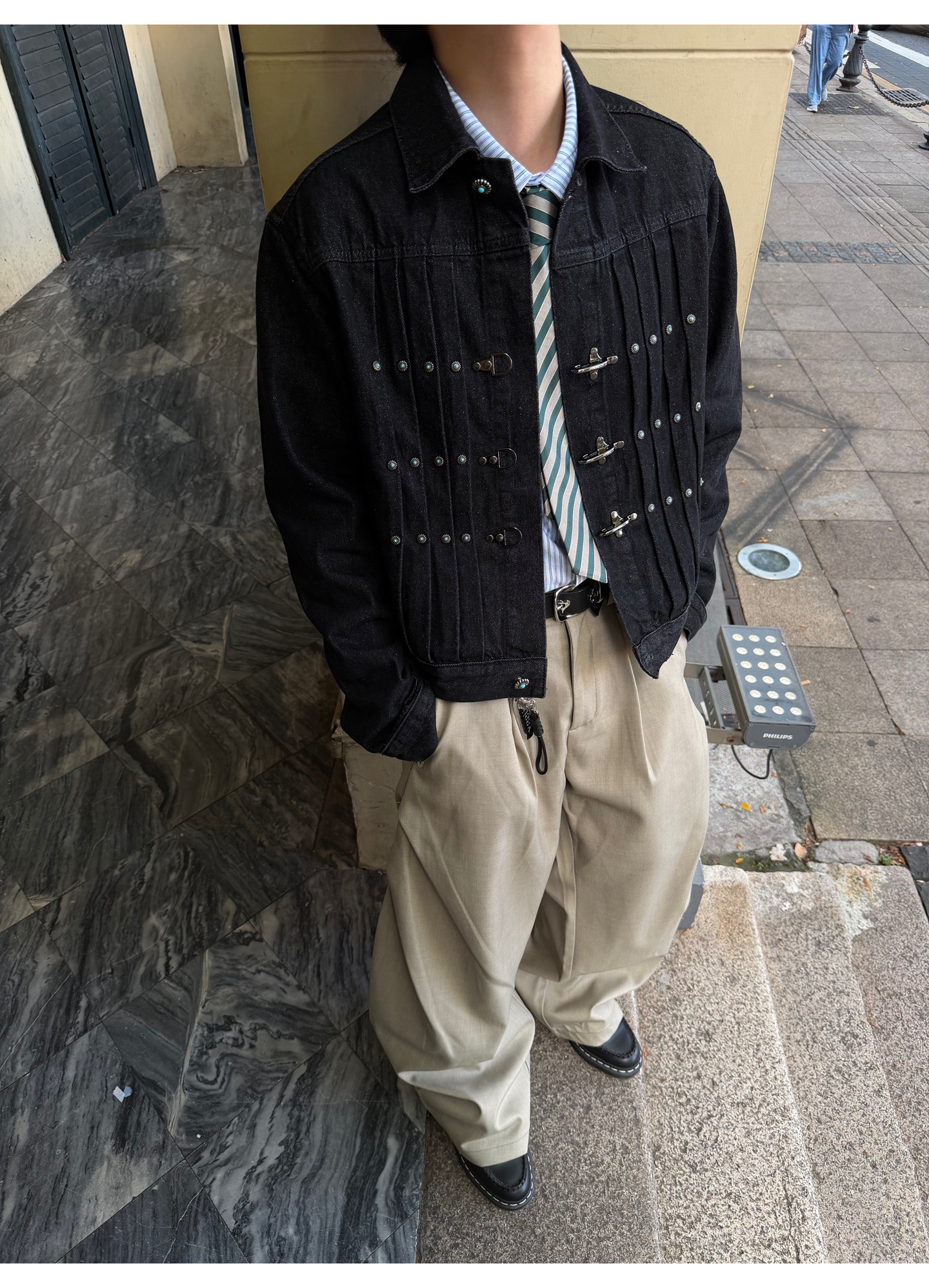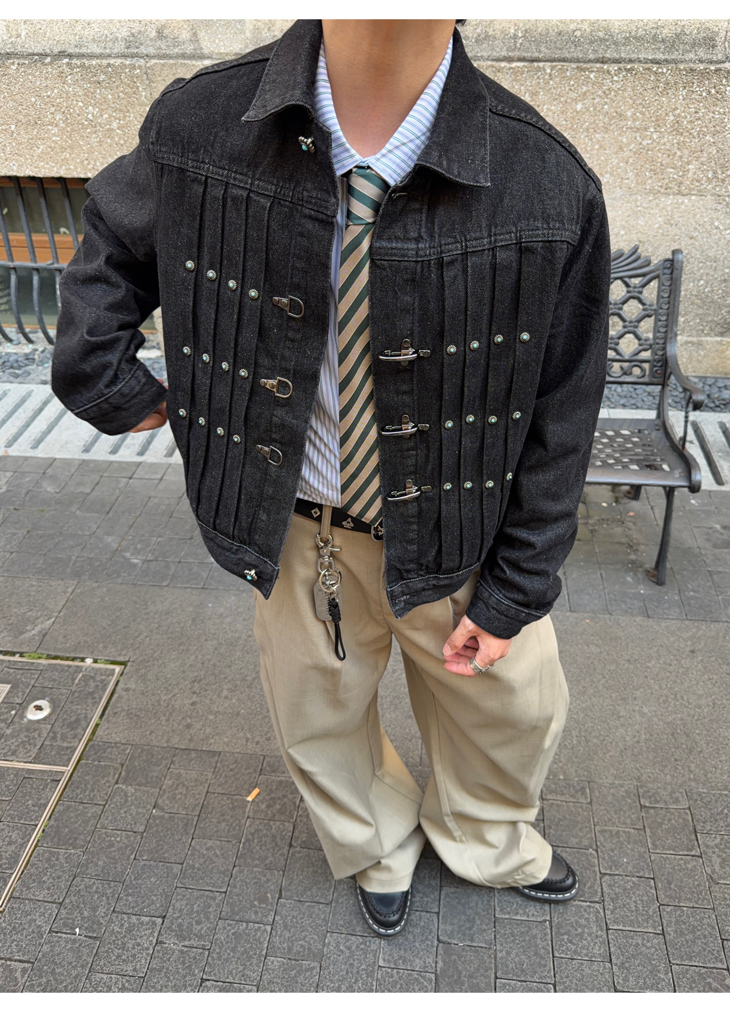 Fateegg American Retro Short Original Denim Jacket Boxy Casual Pleated Design with Airplane Buckle Coat