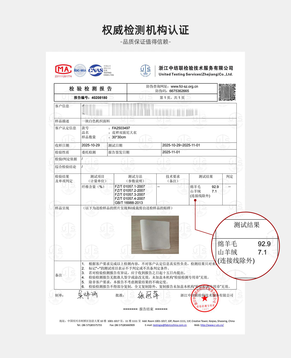 面料含羊绒 摸上去手感软糯细腻