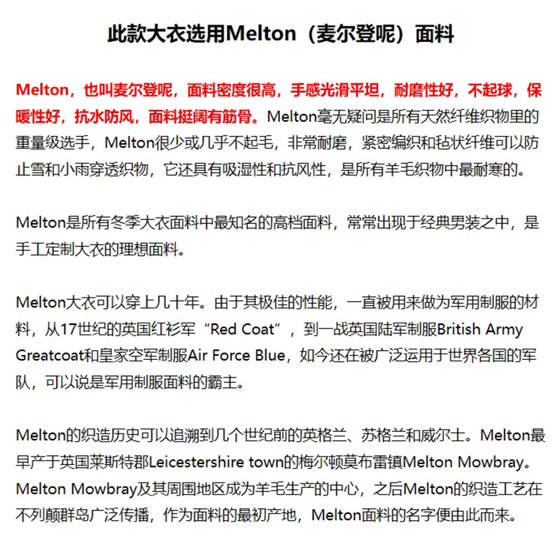 此款掌柜选用90%羊毛900g麦尔登呢面料