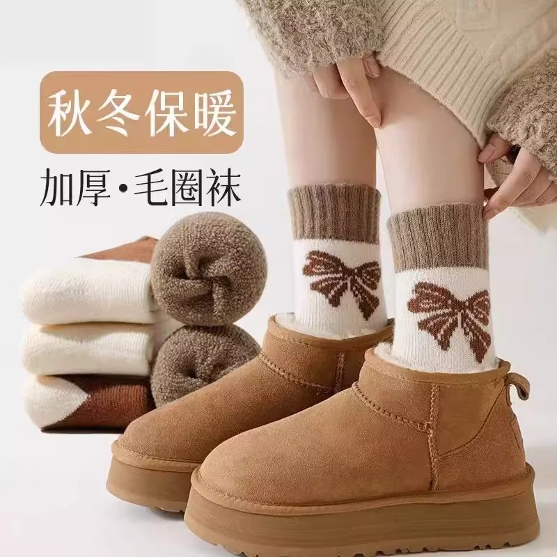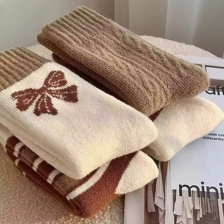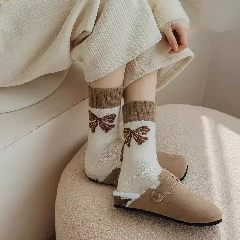 Winter Warm Terry Socks, Thickened Mid-Calf Socks, Long Socks, ins Trendy Autumn and Winter Japanese Style Sweet Bow Socks for Women