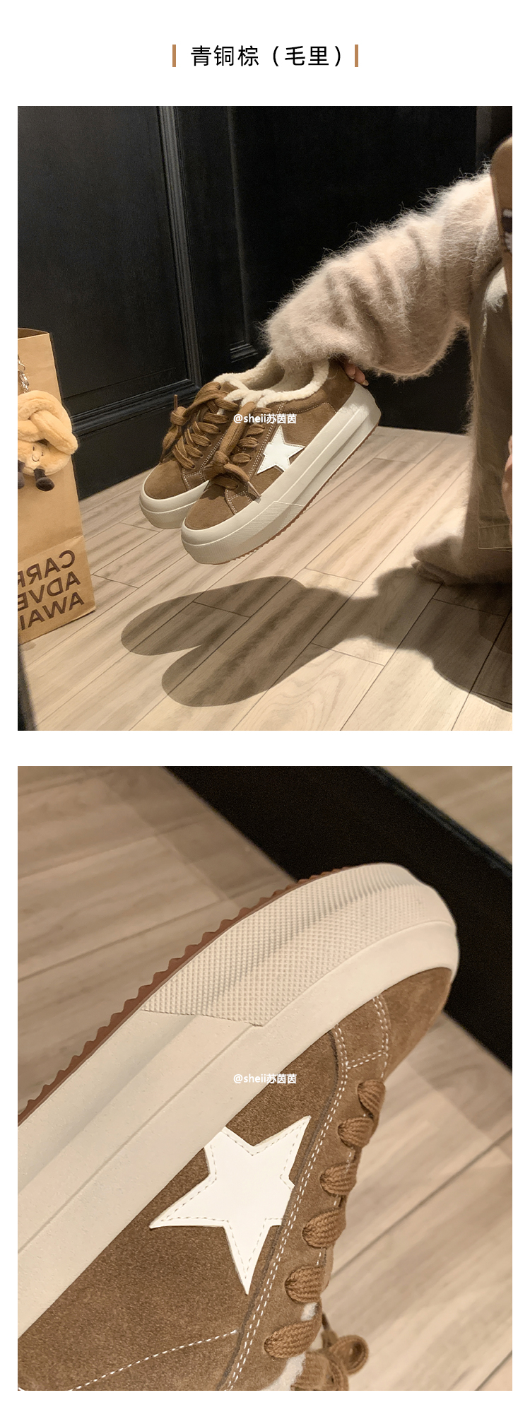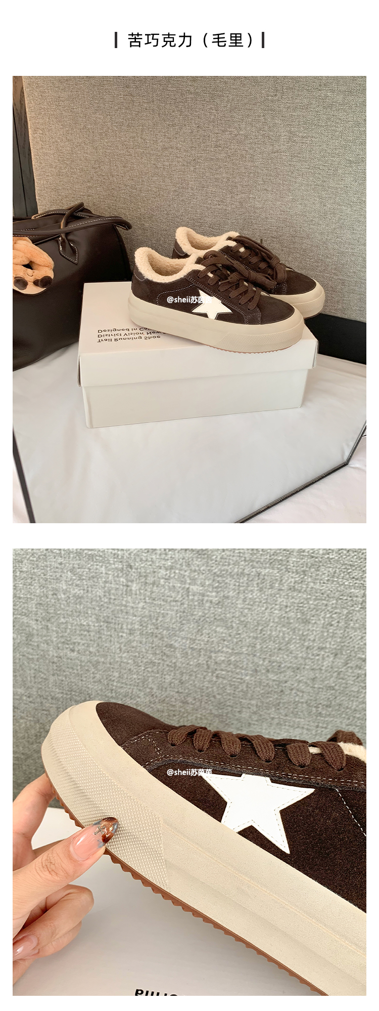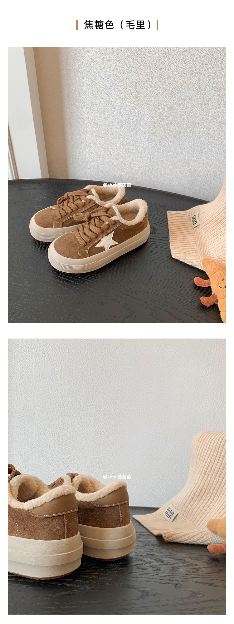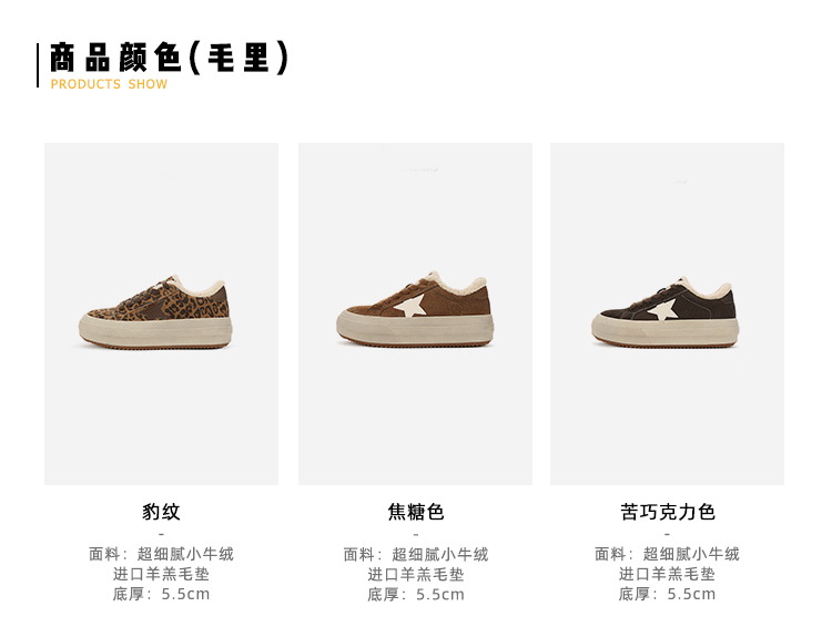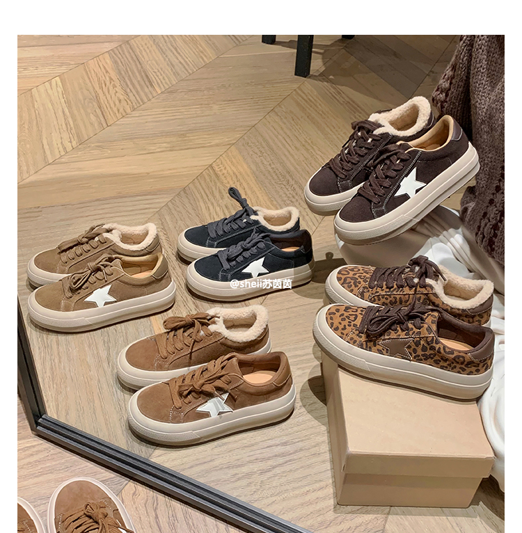 【Su Yinyin】Mocha Small Wool~ Fleece-Lined 5.5cm Thick-Soled Star-Patterned Casual Shoes, Distressed Sneakers for Women