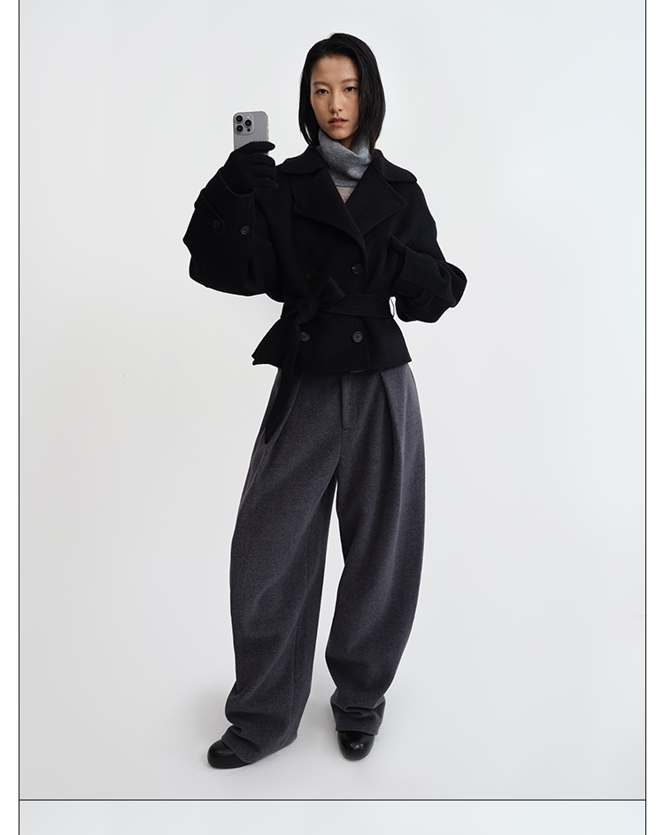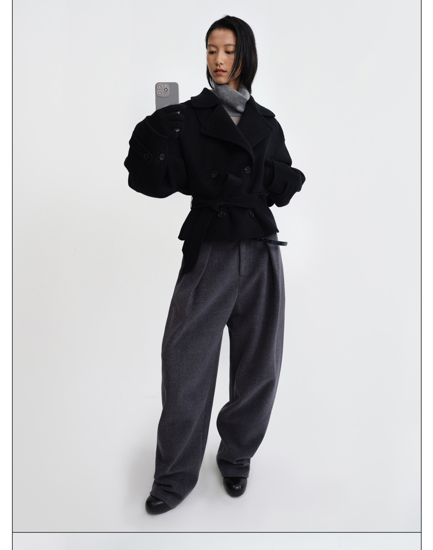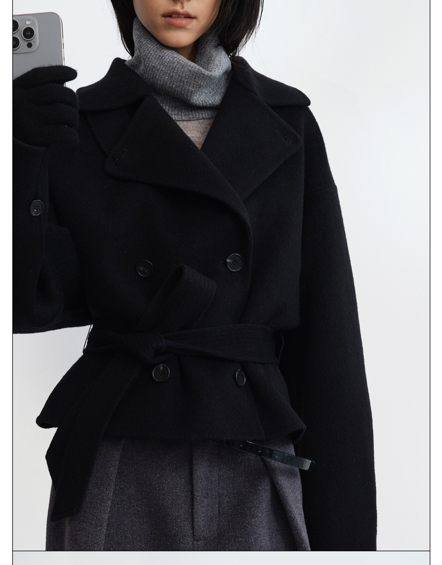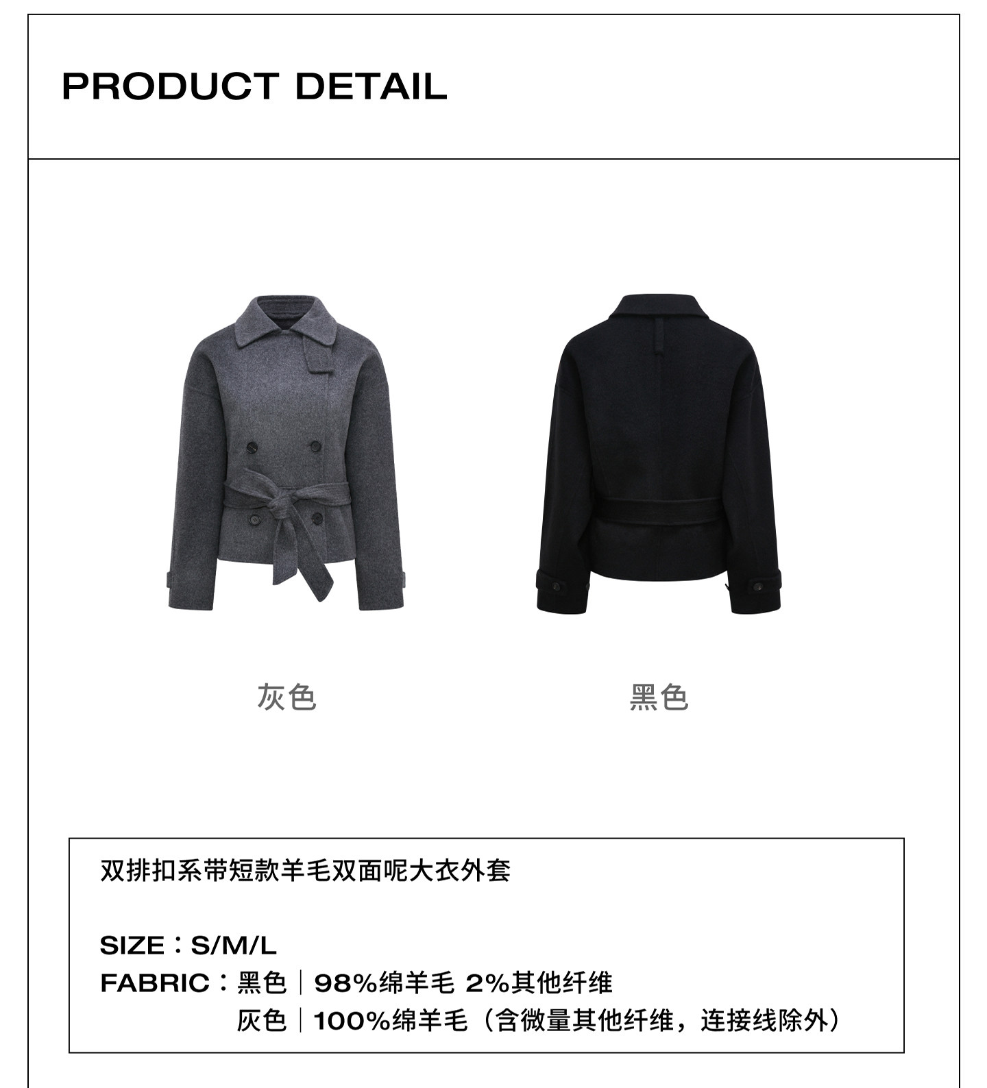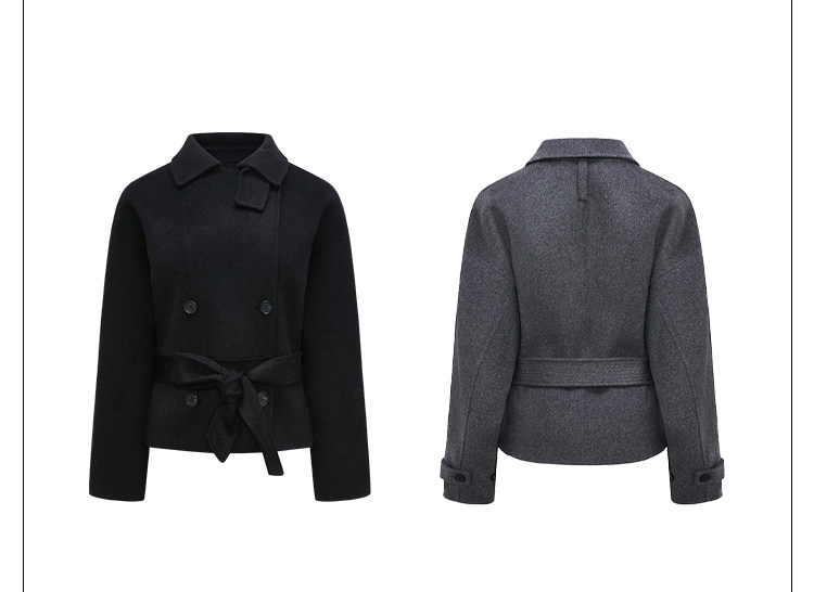 Rarely Alike Double-Breasted Lace-Up Short Wool Double-Sided Coat Black/Grey