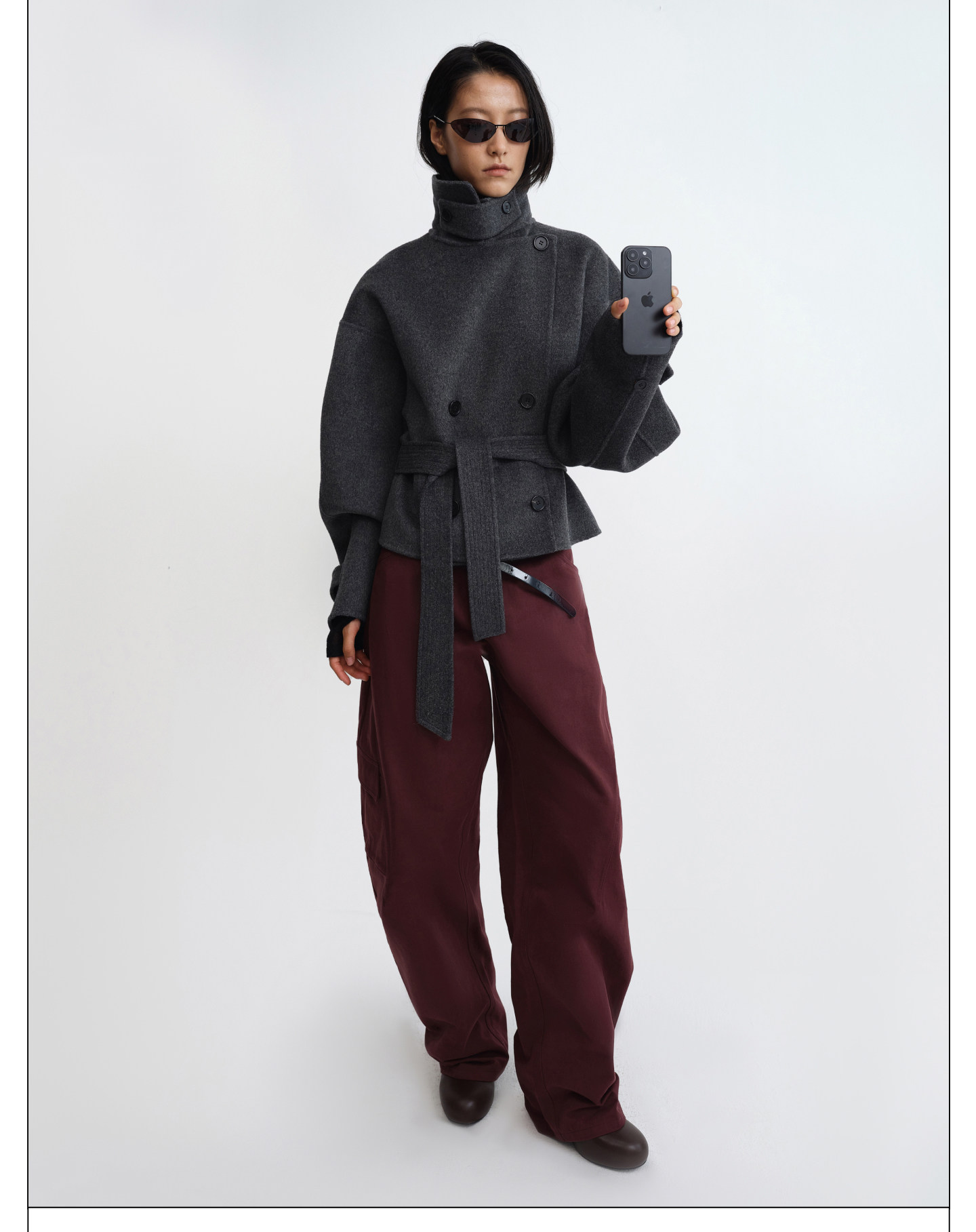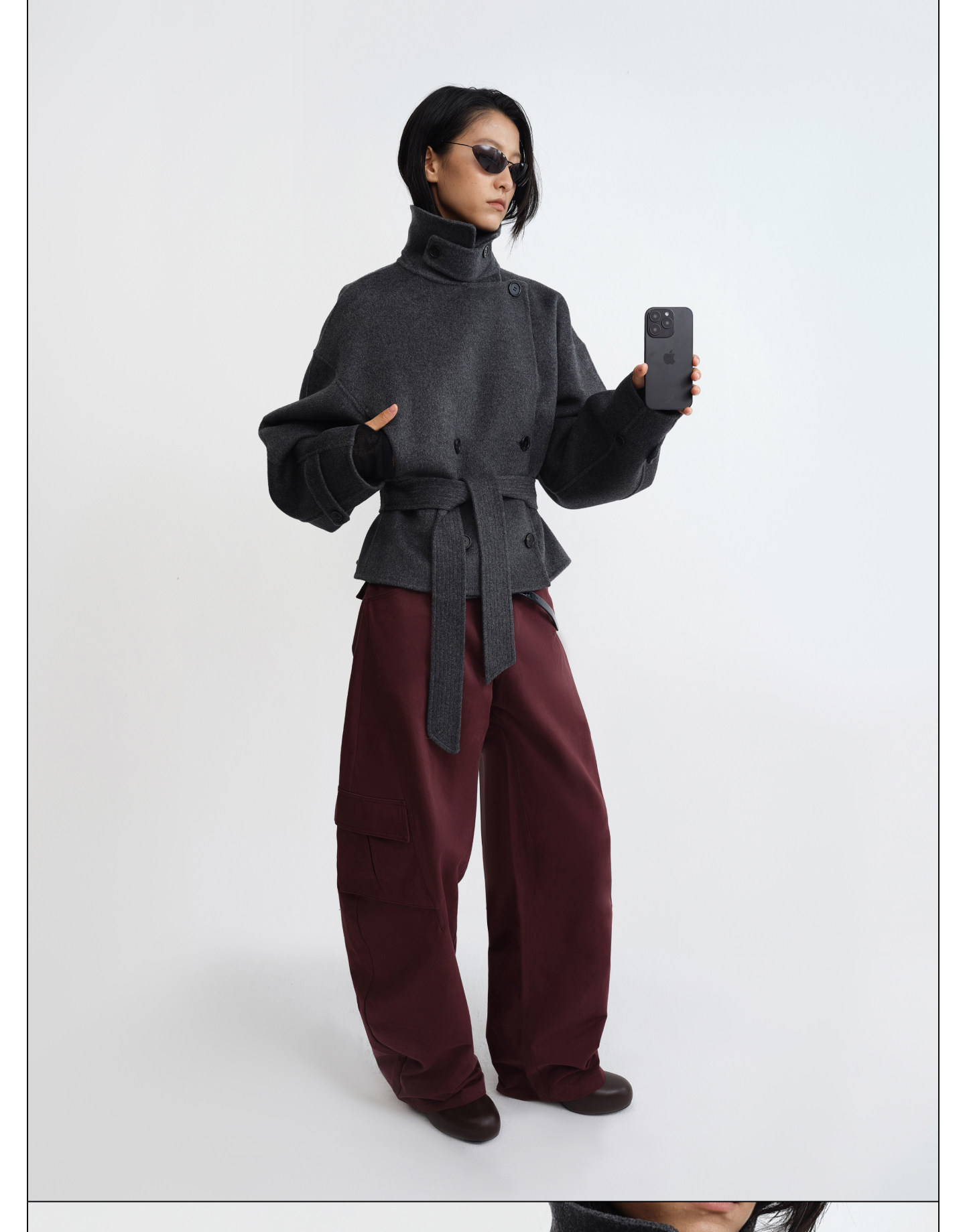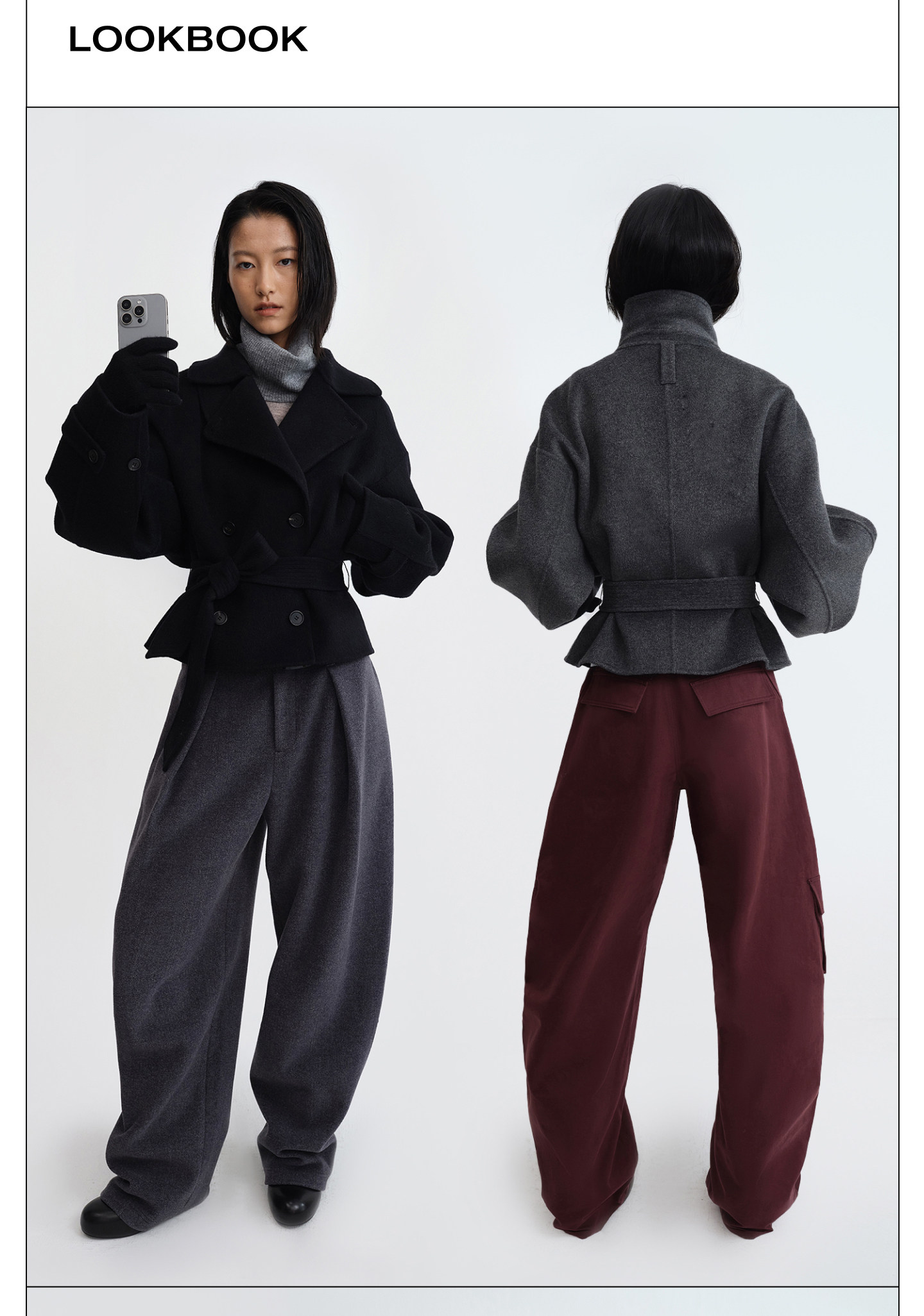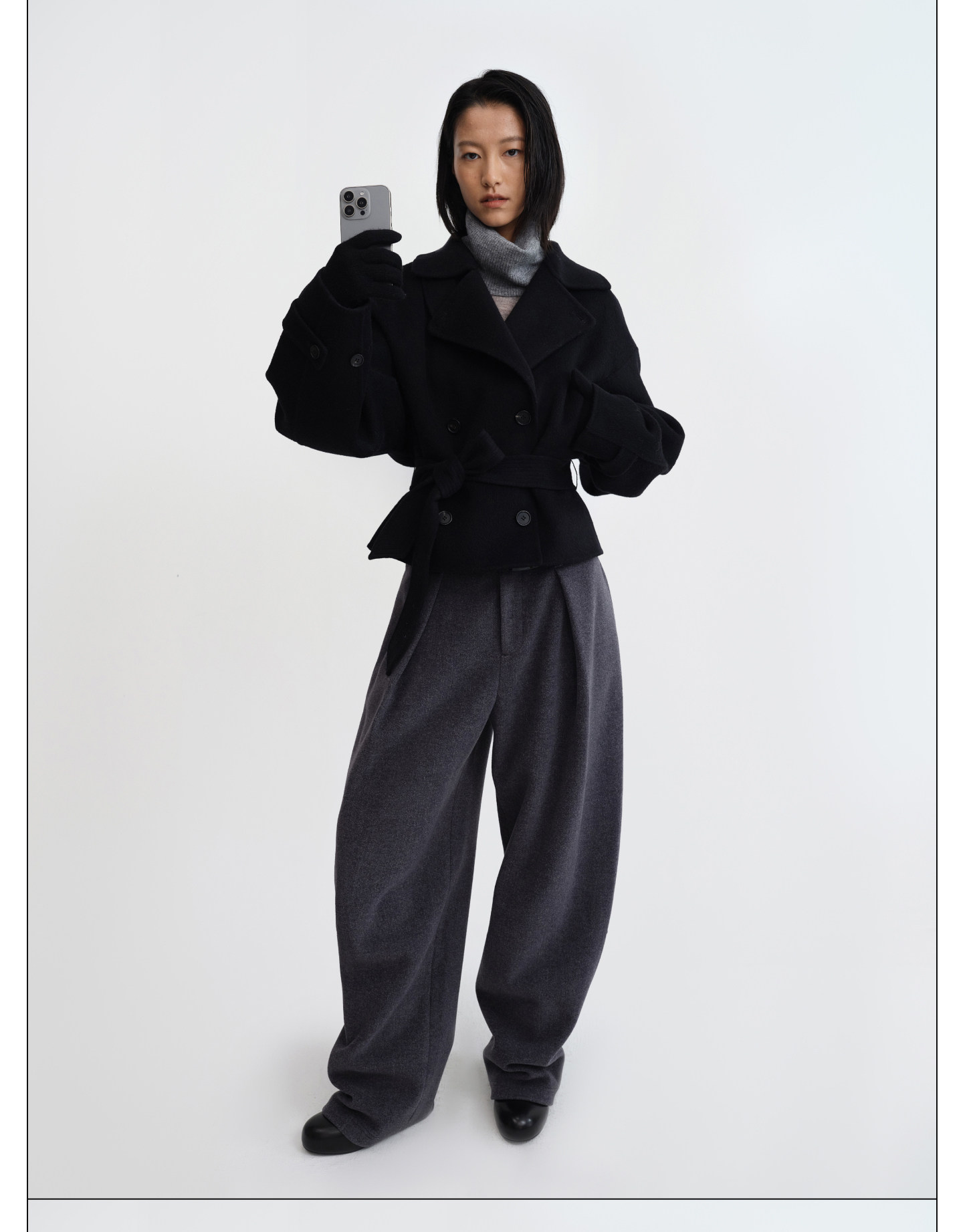 Rarely Alike Double-Breasted Lace-Up Short Wool Double-Sided Coat Black/Grey