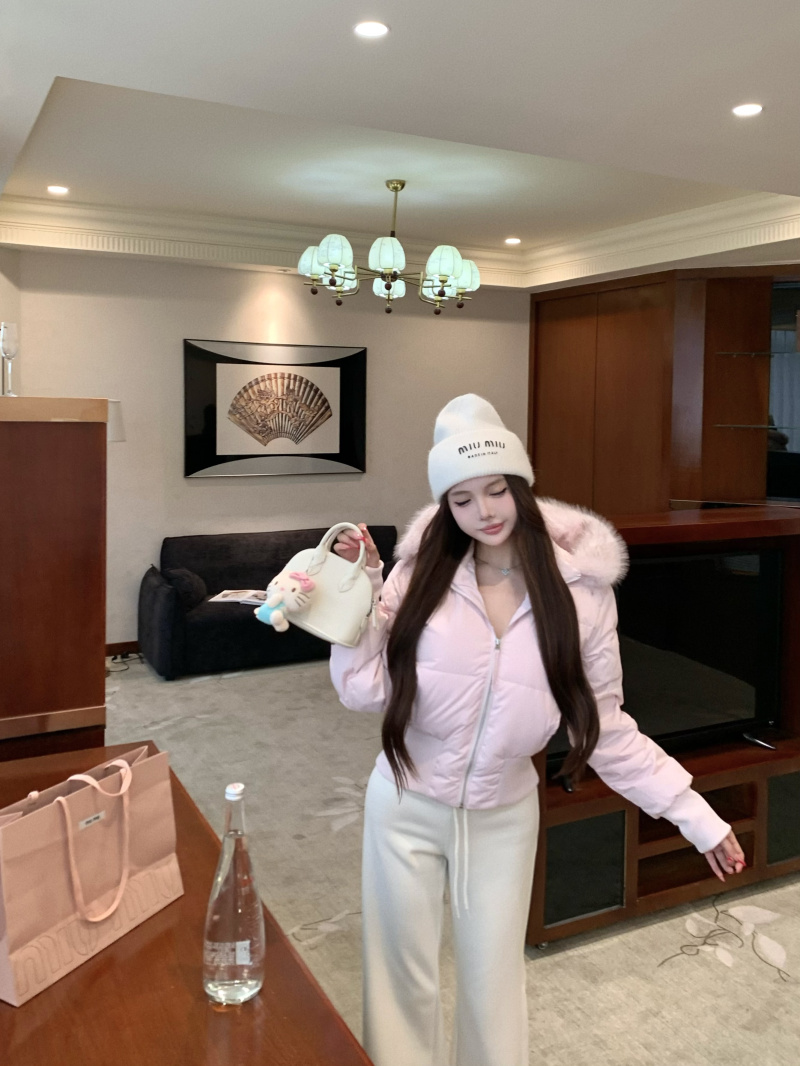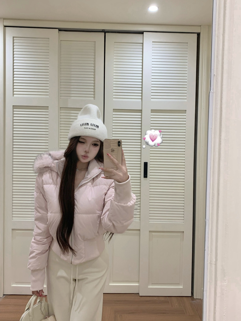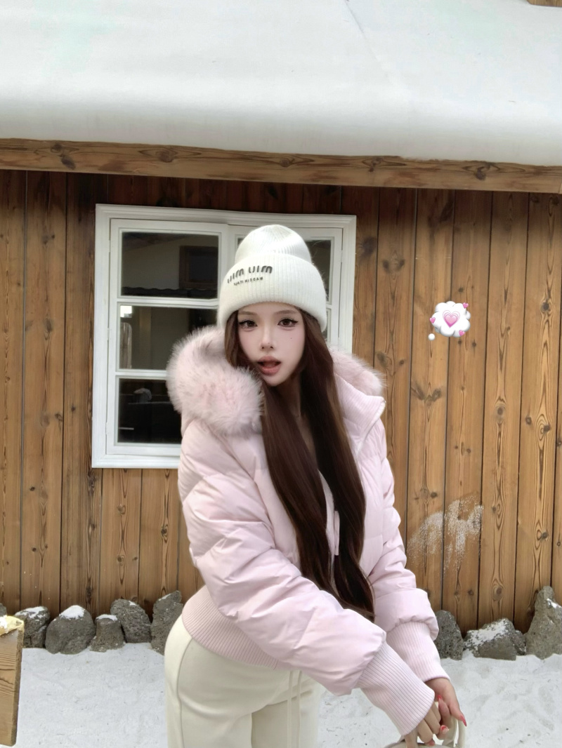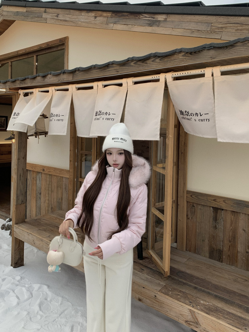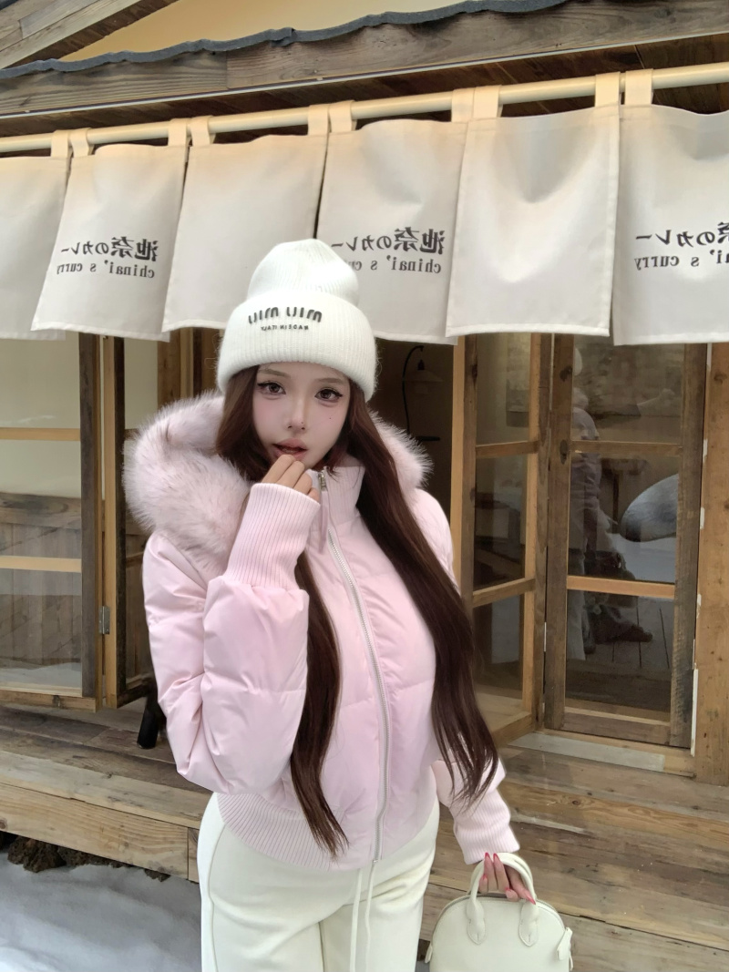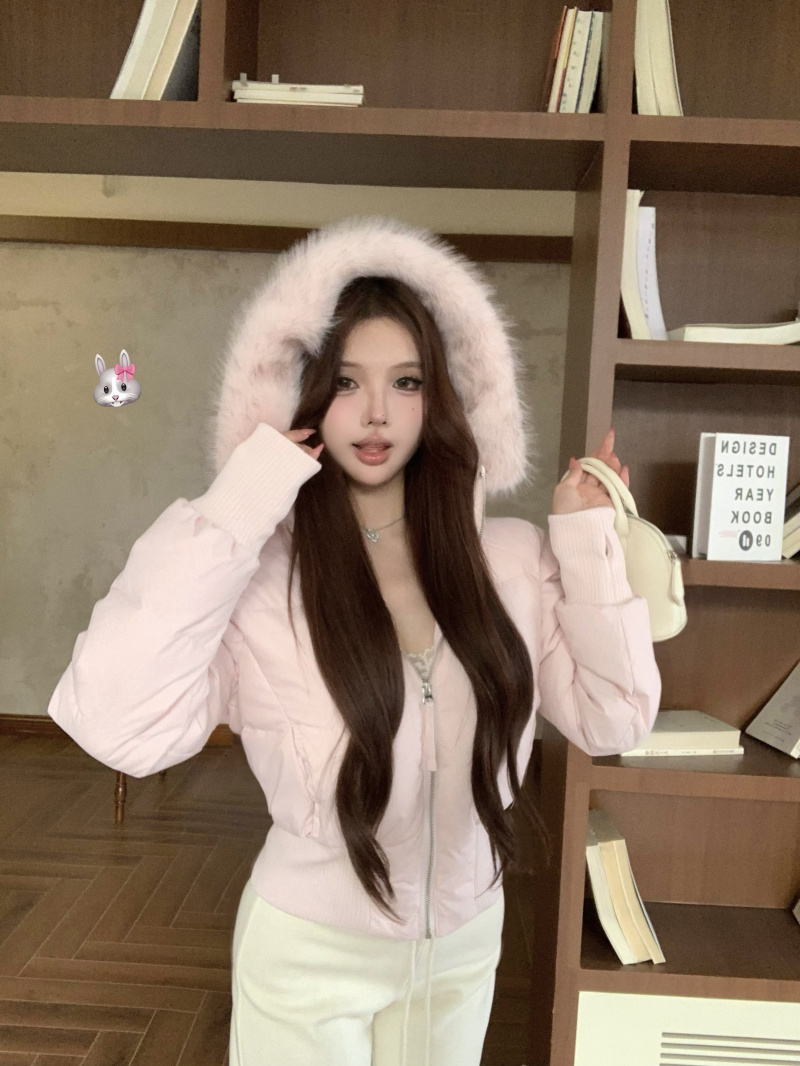 Pink Fur Collar Hooded down Jacket for Women, Winter 2025 New Style, Fleece-Lined, Thickened, Warm Cotton Coat, Slim Fit Outerwear