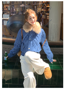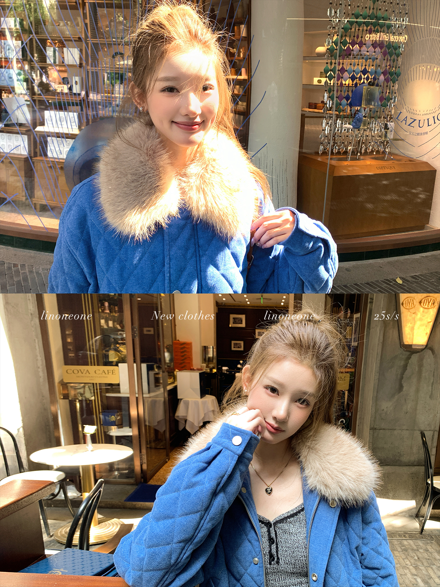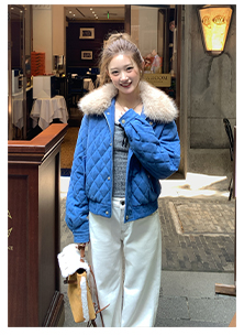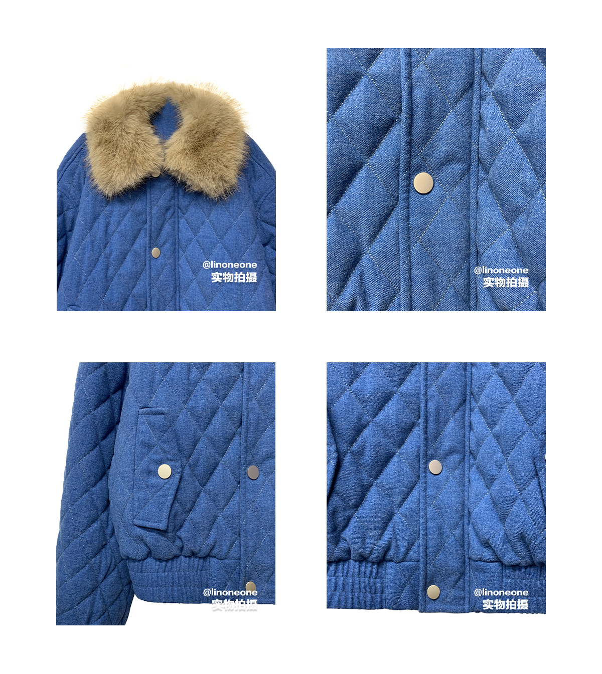 Linoneone Hokkaido Stroll Versatile Blue Diamond Pattern Quilted Eco-Friendly Fur Collar Short Cotton Jacket