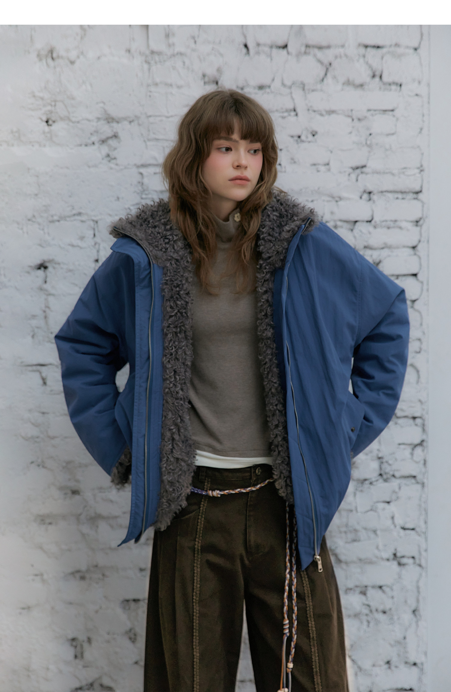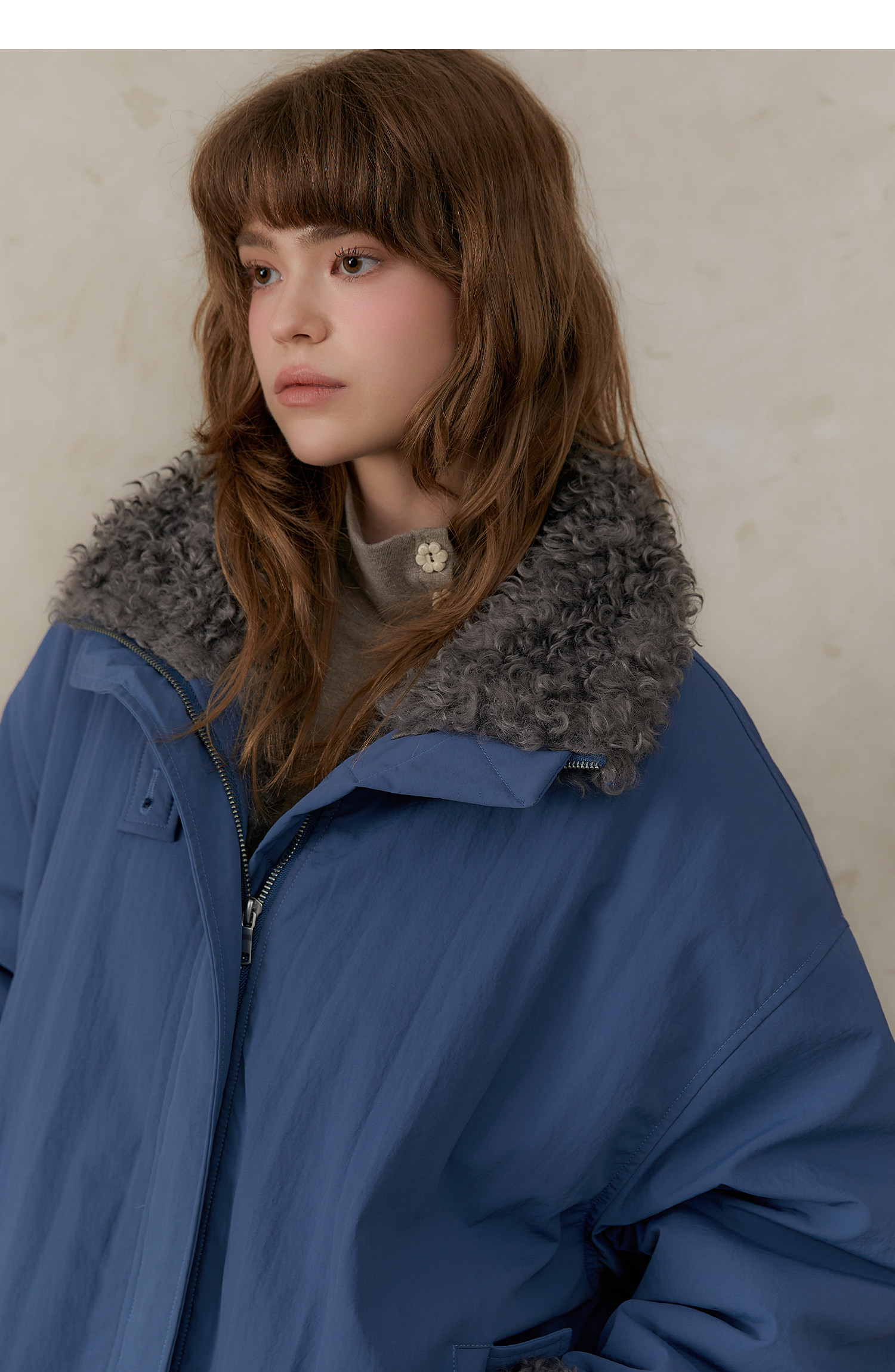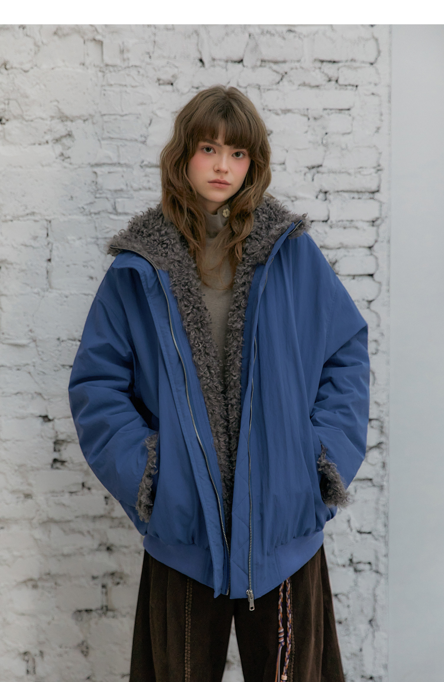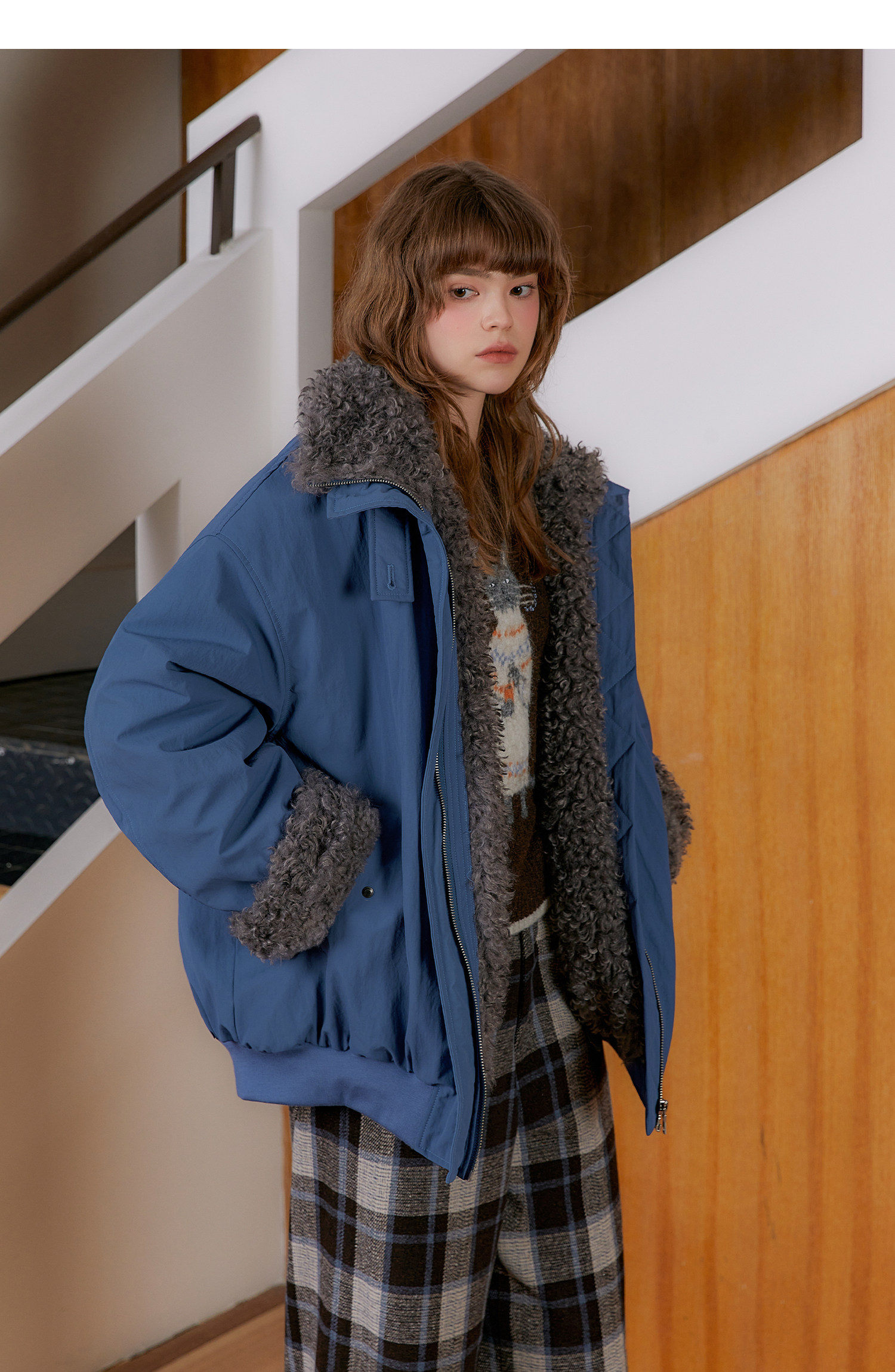 Amweird 25Aw “Deep Sea” Blue Patchwork Plush Lining Fur Collar Jacket Cotton Coat