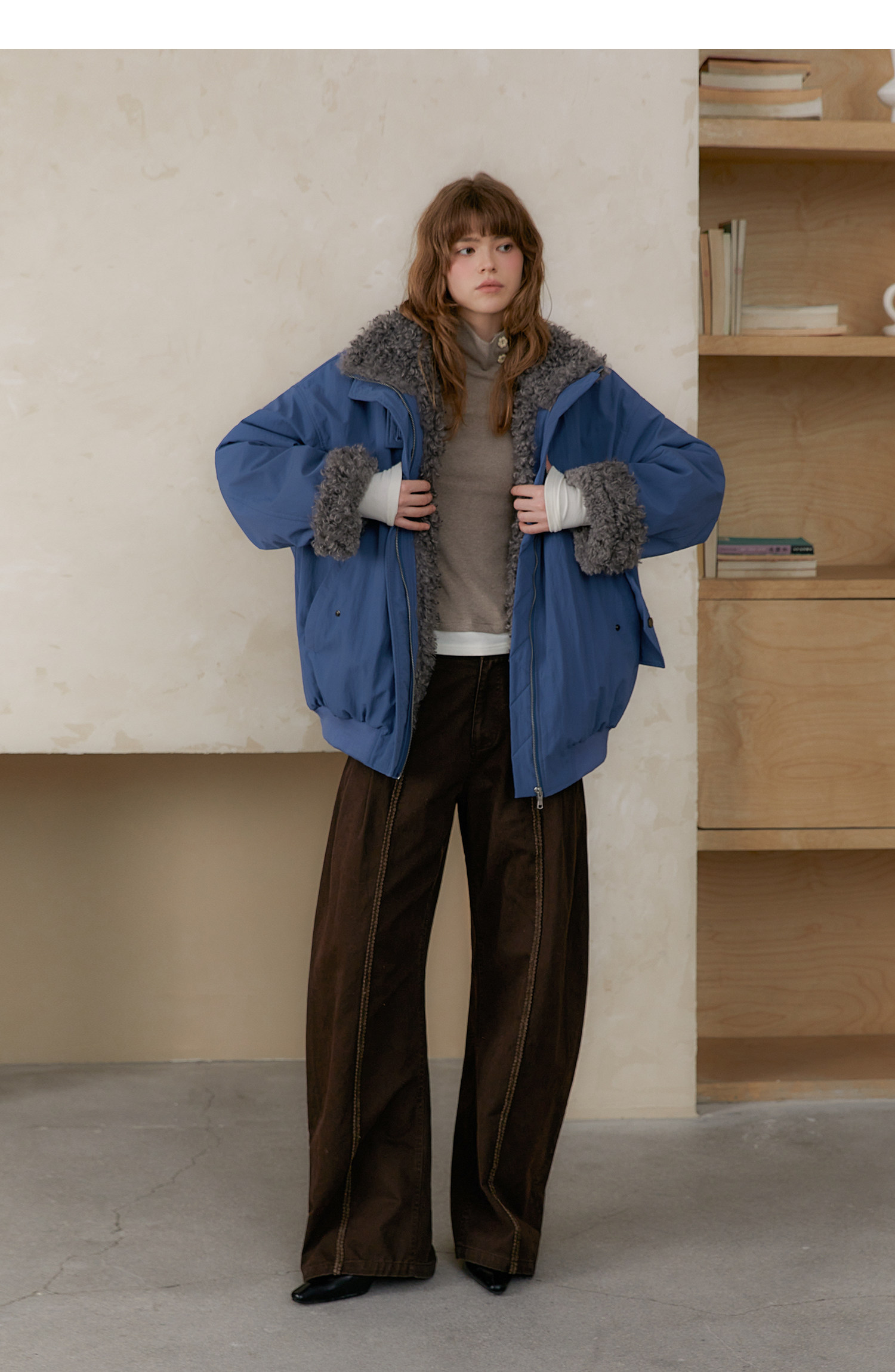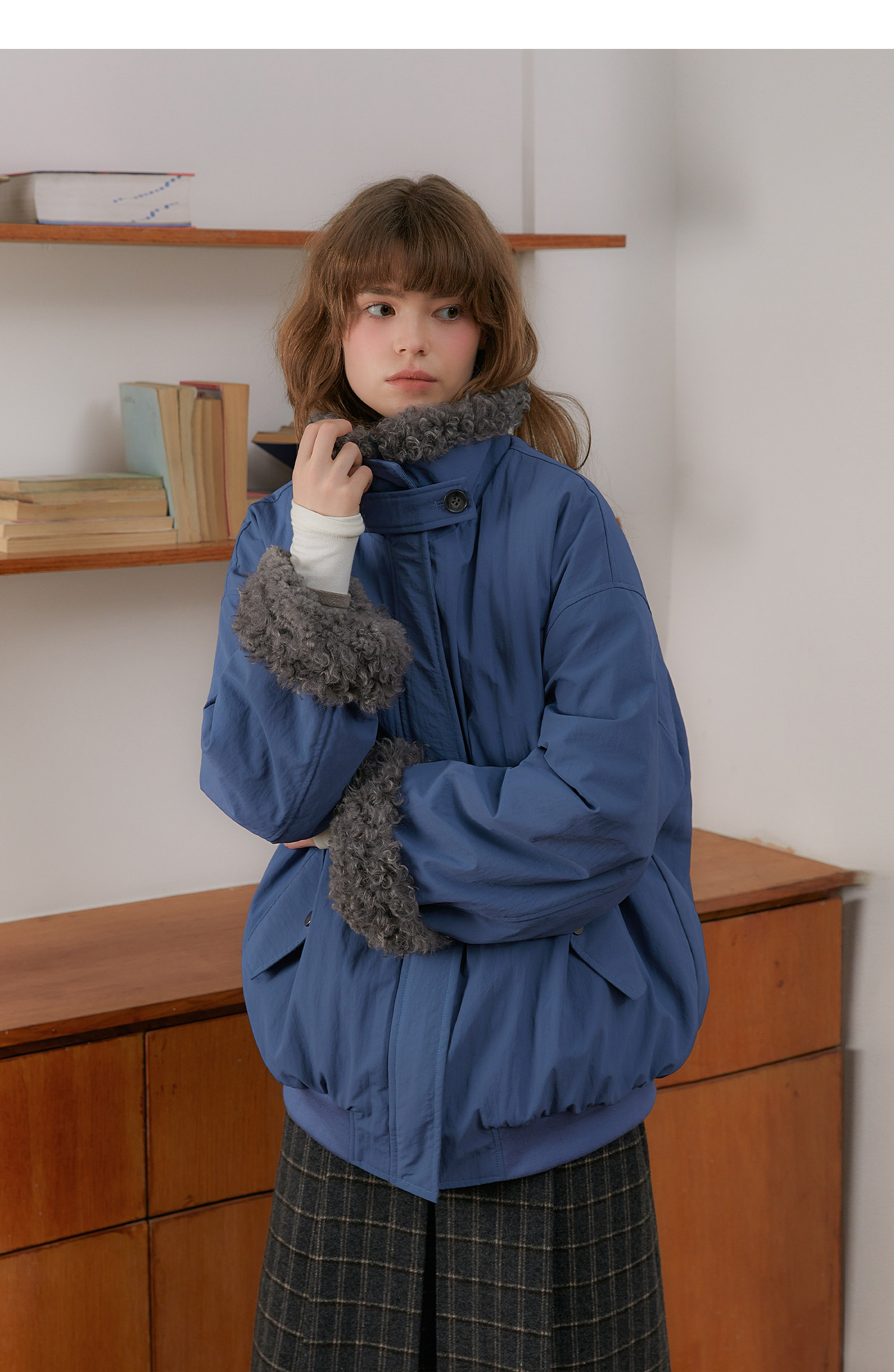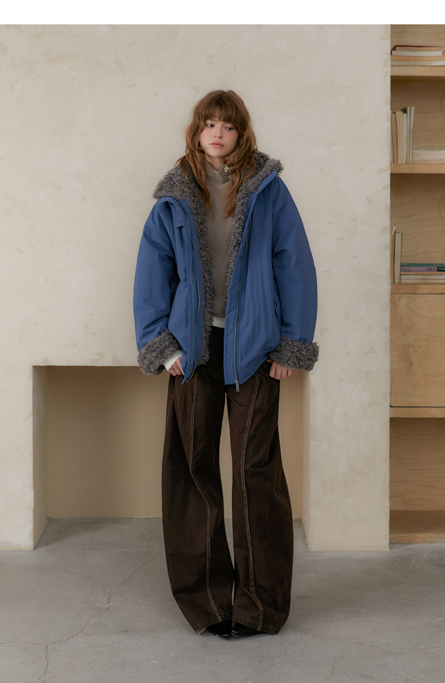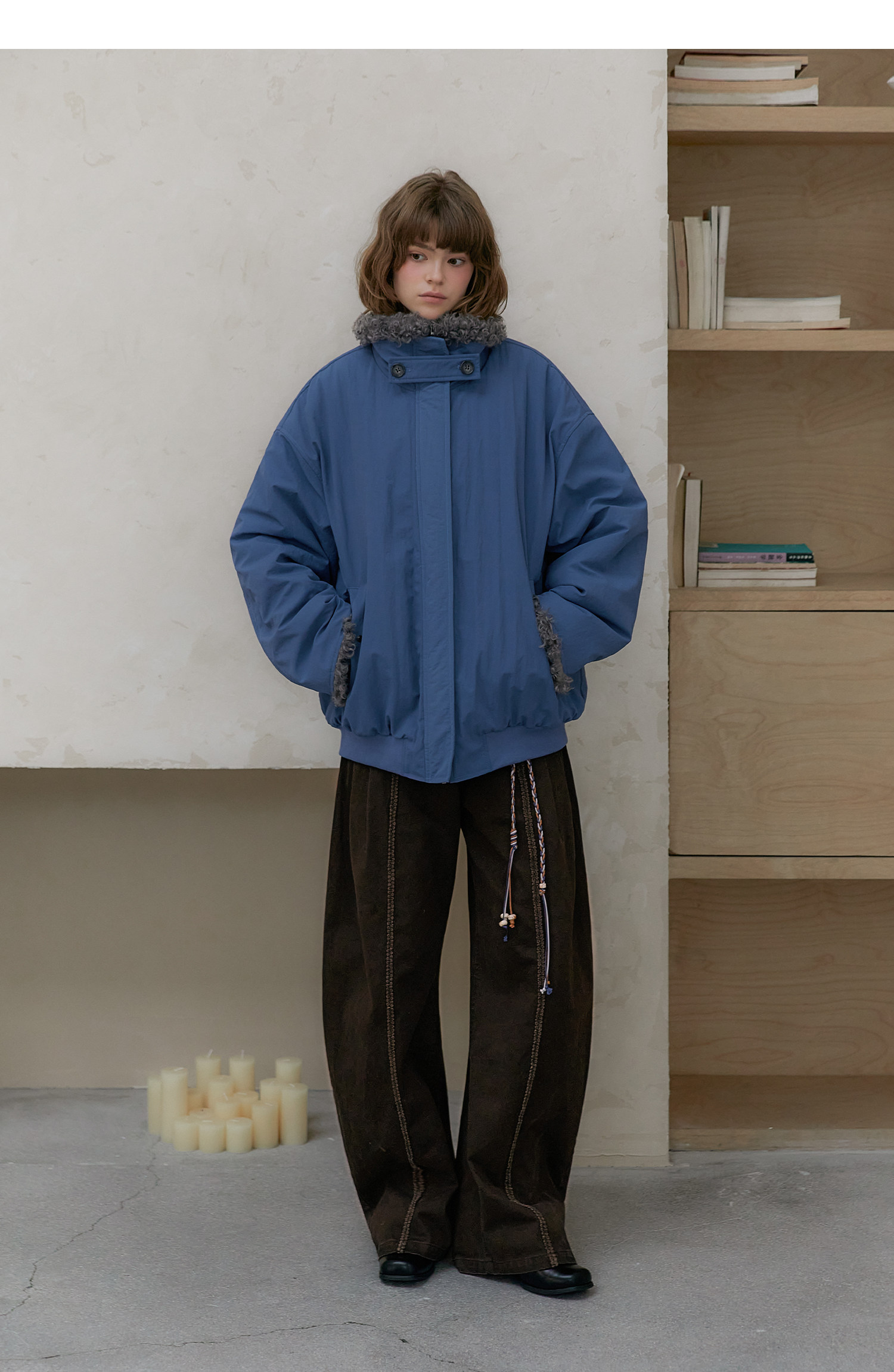 Amweird 25Aw “Deep Sea” Blue Patchwork Plush Lining Fur Collar Jacket Cotton Coat