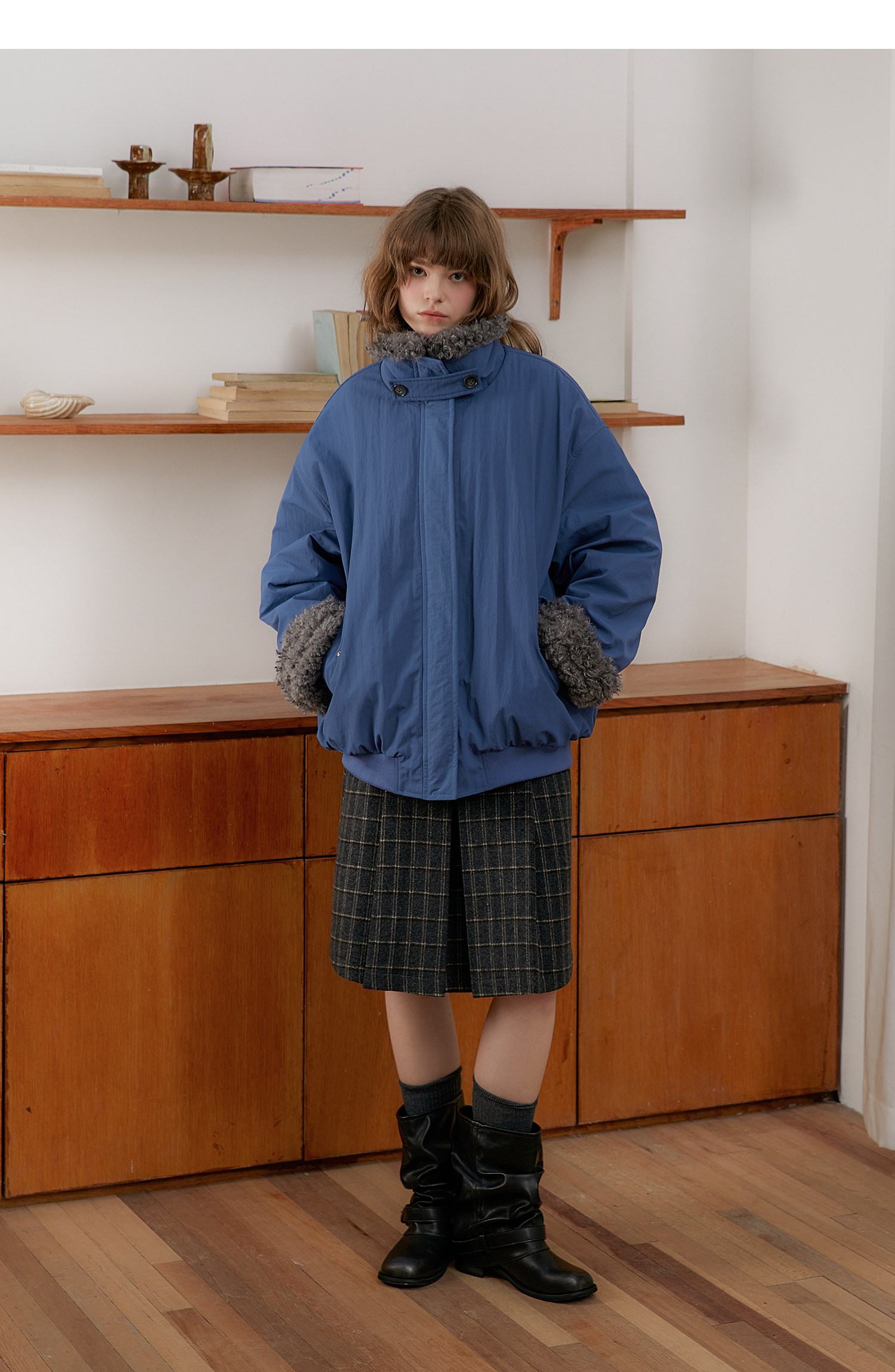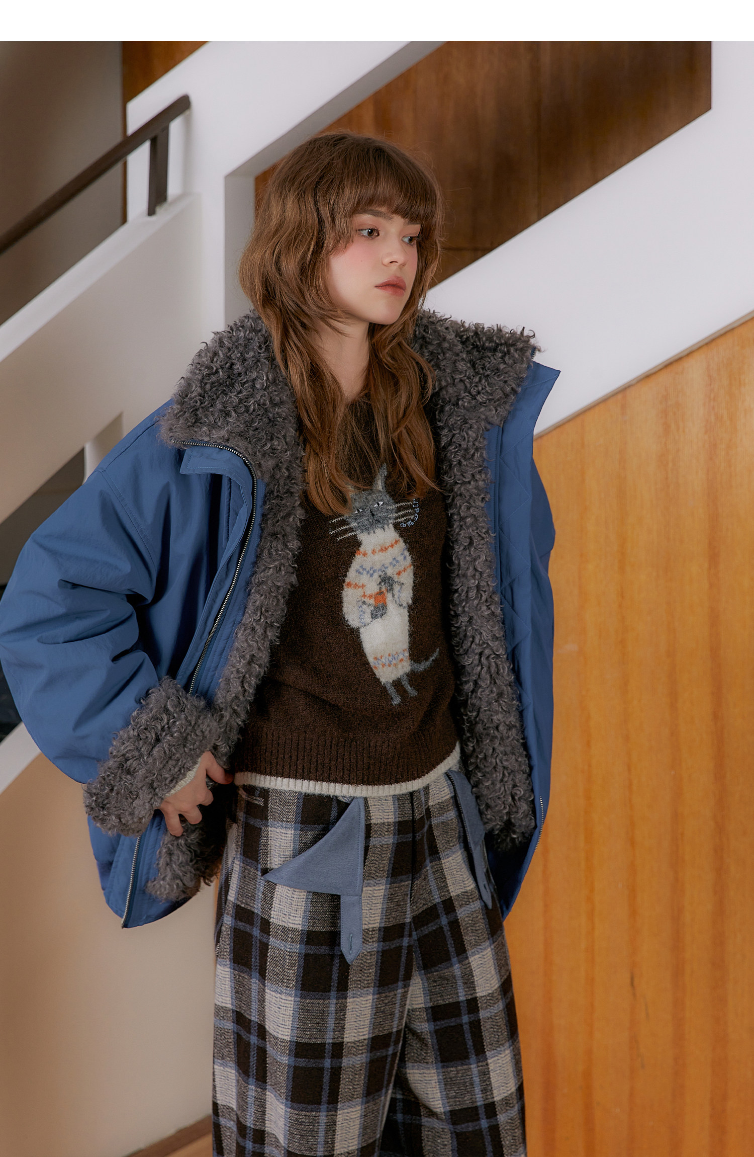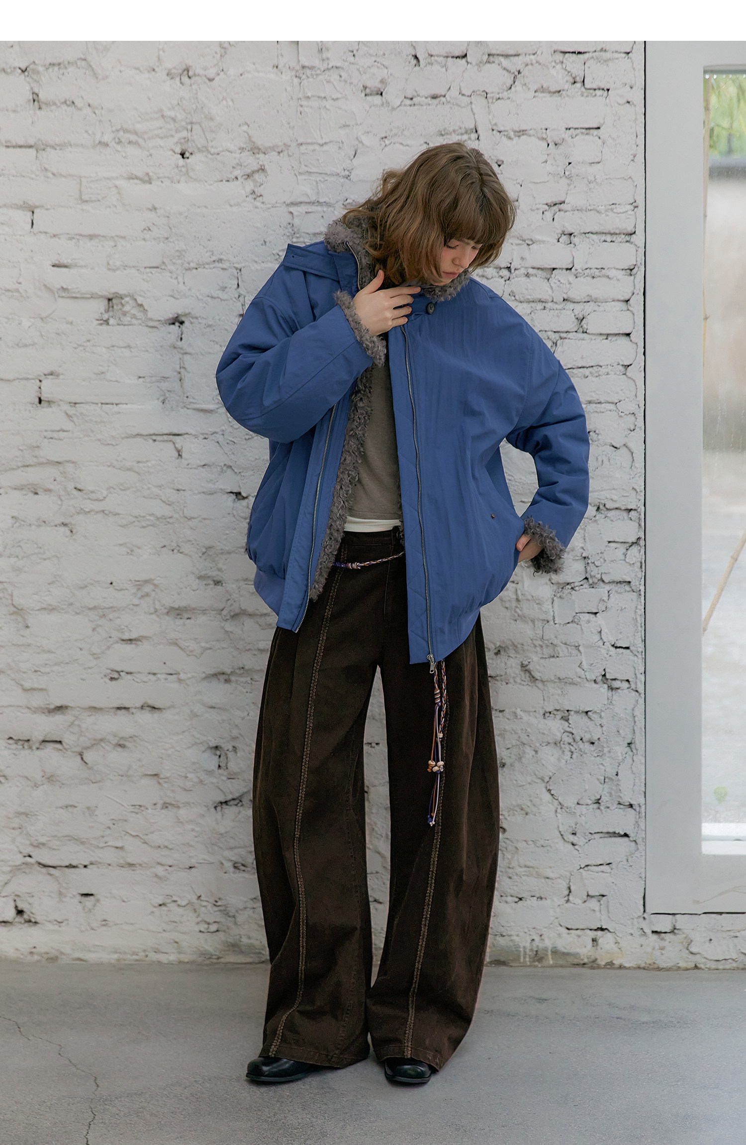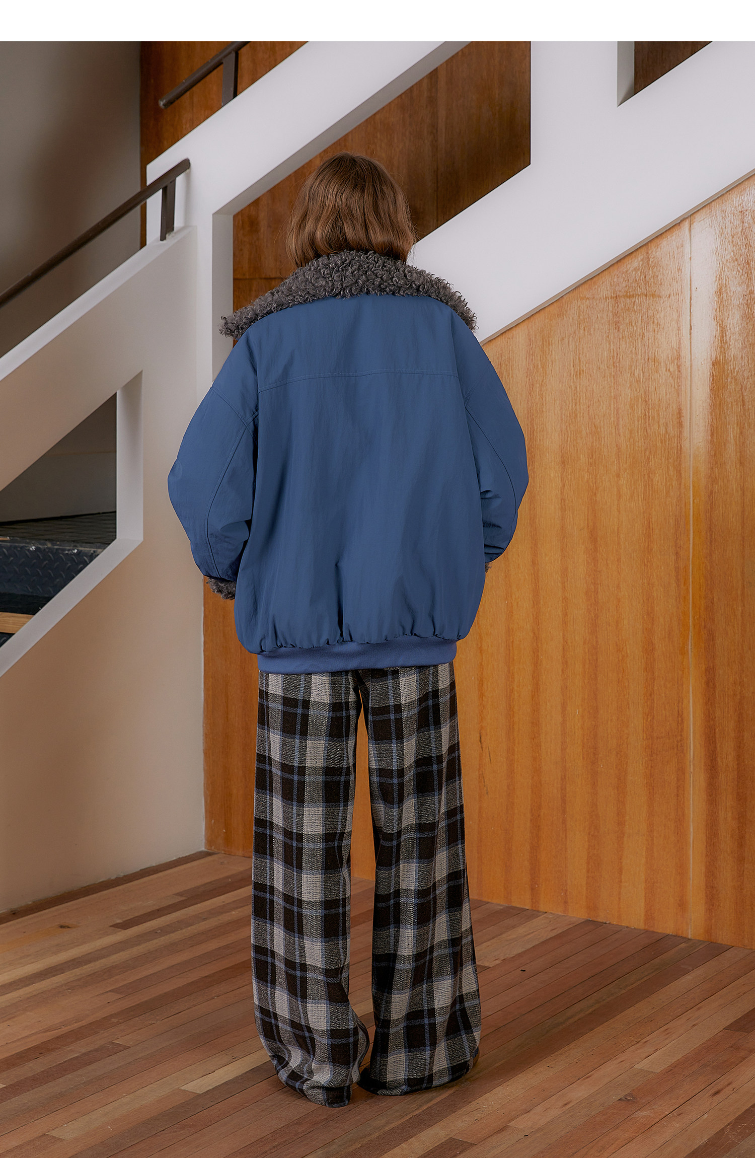 Amweird 25Aw “Deep Sea” Blue Patchwork Plush Lining Fur Collar Jacket Cotton Coat