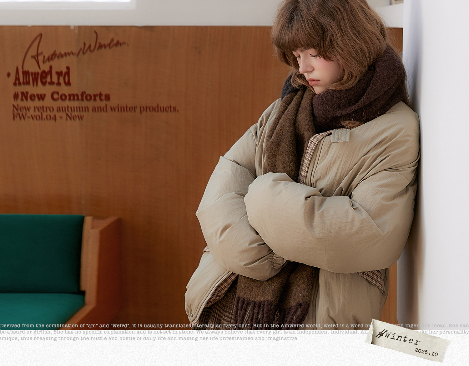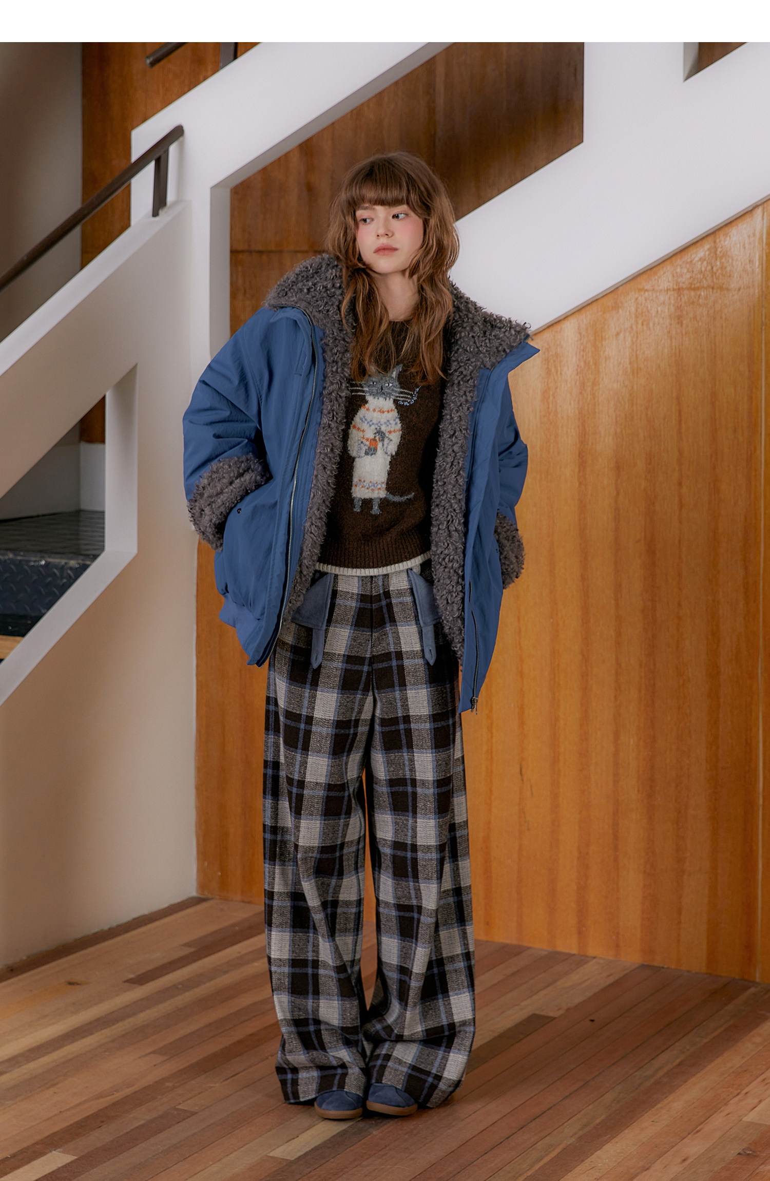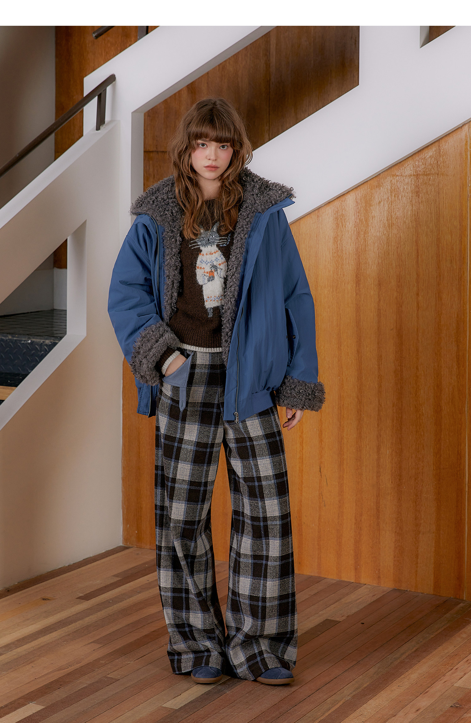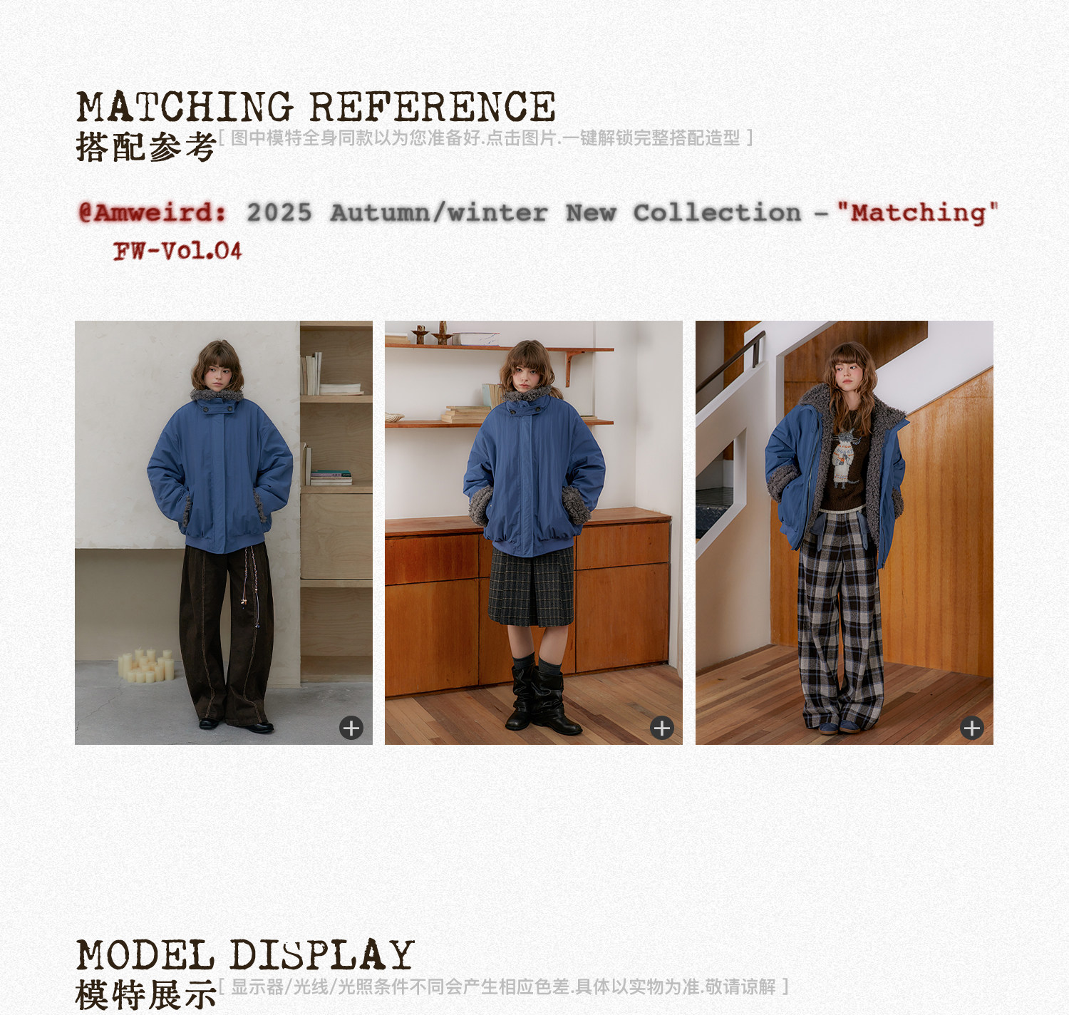 Amweird 25Aw “Deep Sea” Blue Patchwork Plush Lining Fur Collar Jacket Cotton Coat