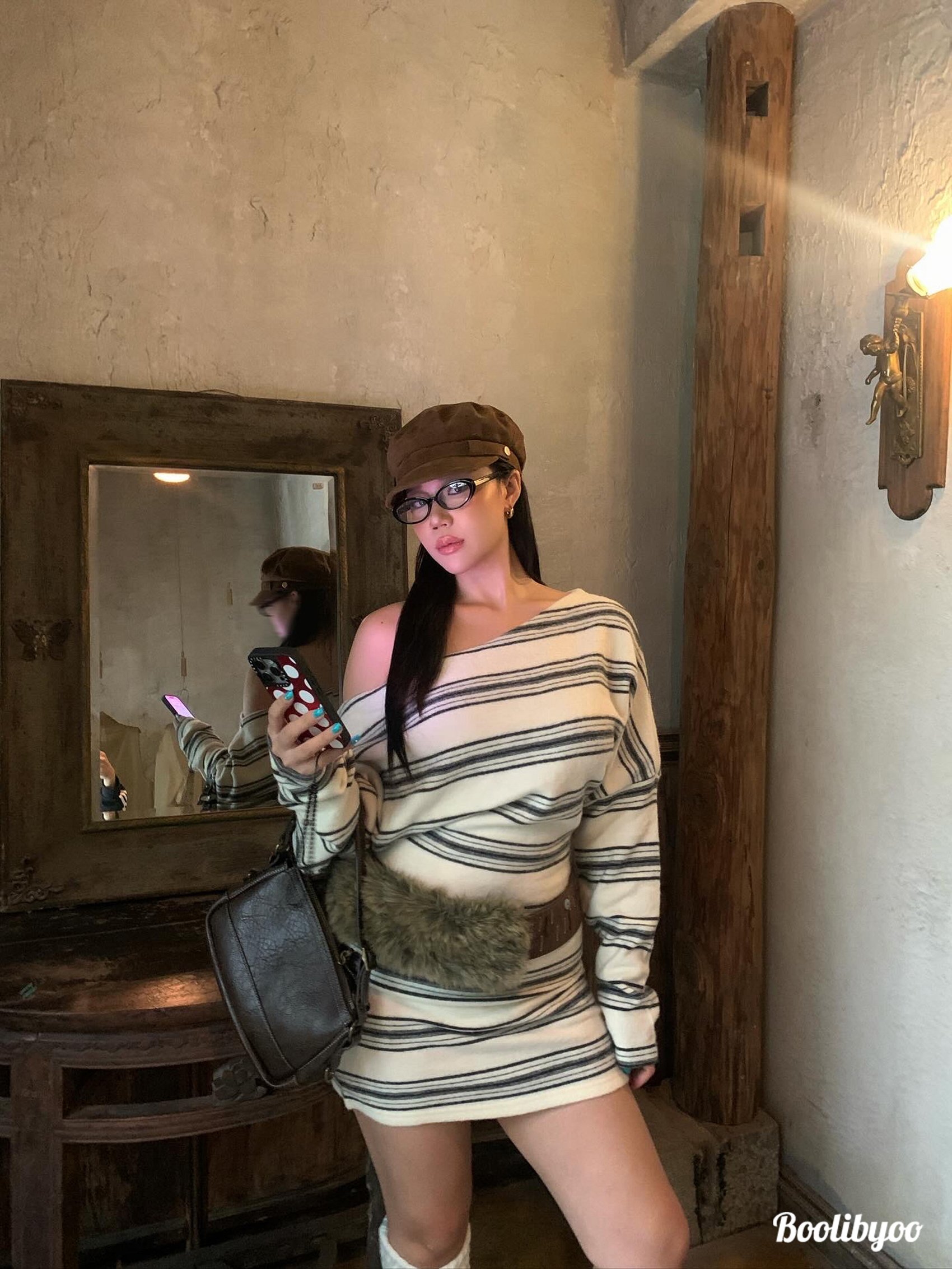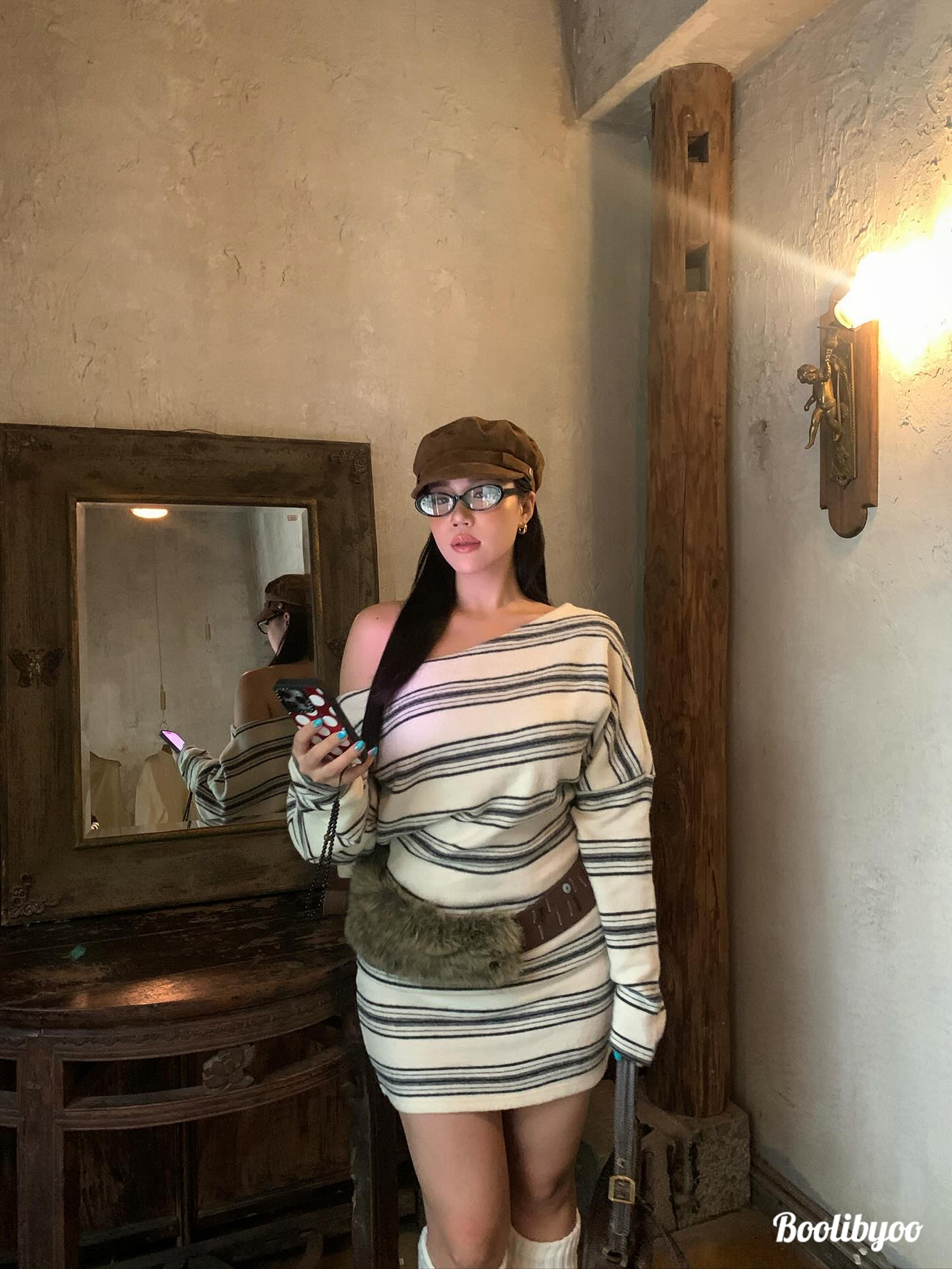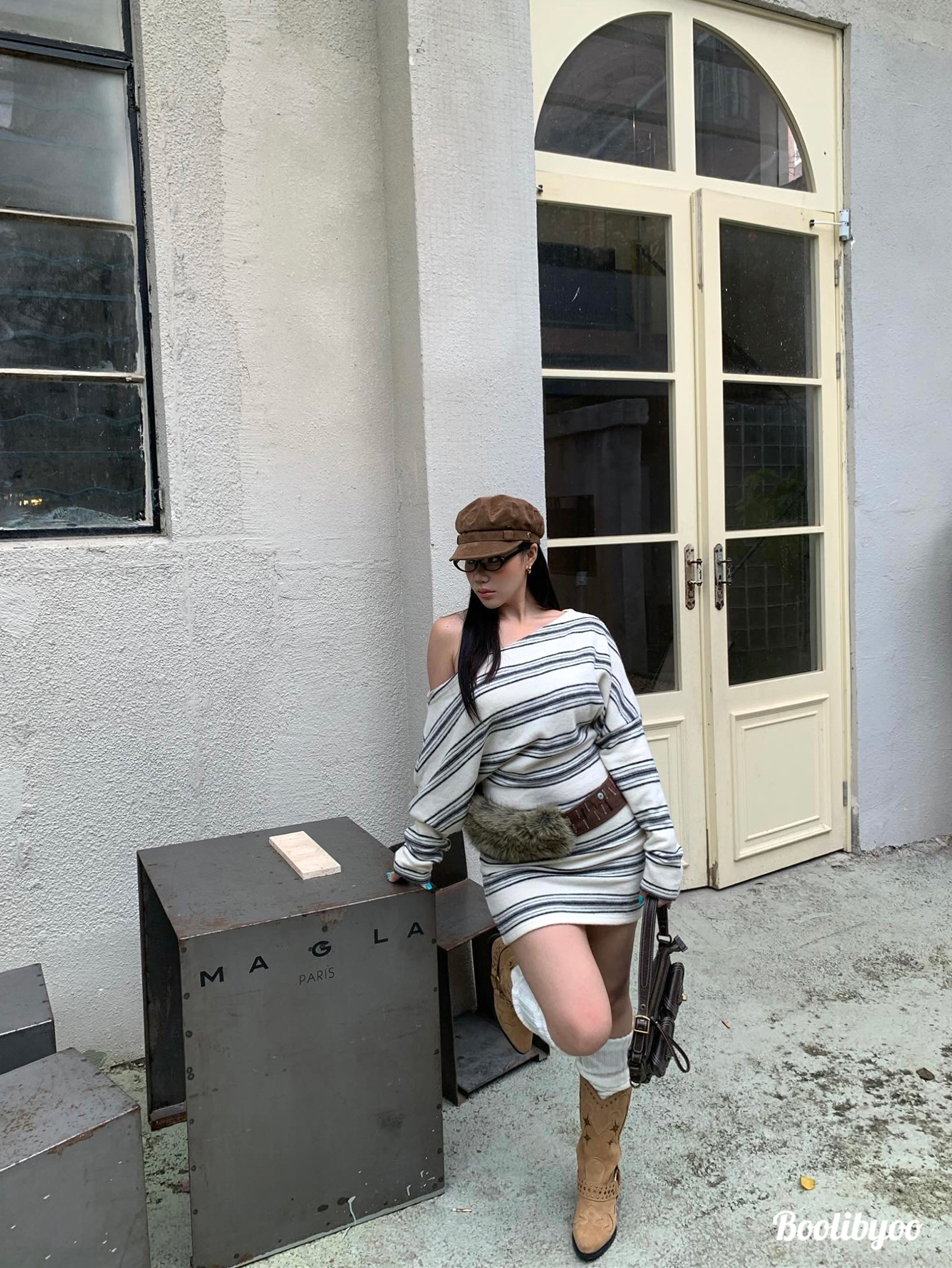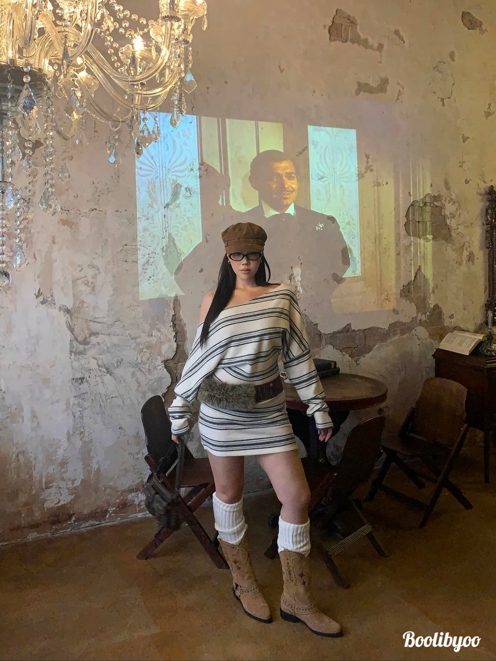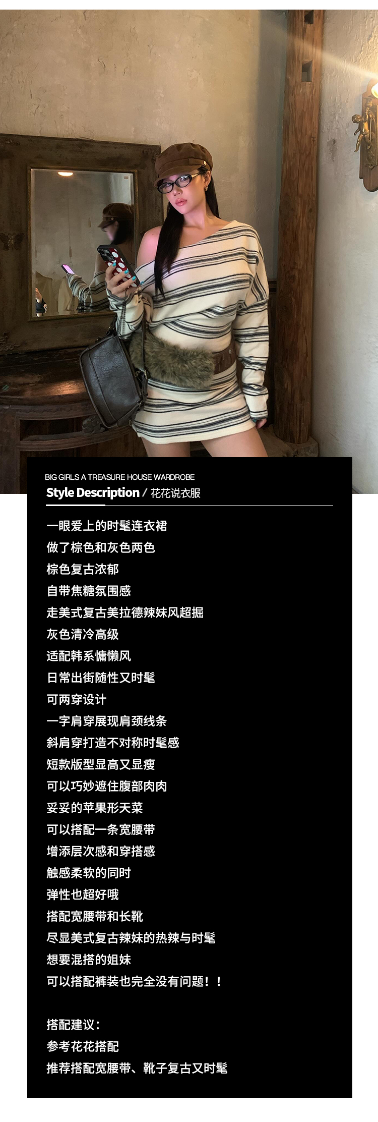 Boolibyoo Vintage Toffee Color Oversized Casual Spicy Girl Off-Shoulder Asymmetrical Striped Short Dress