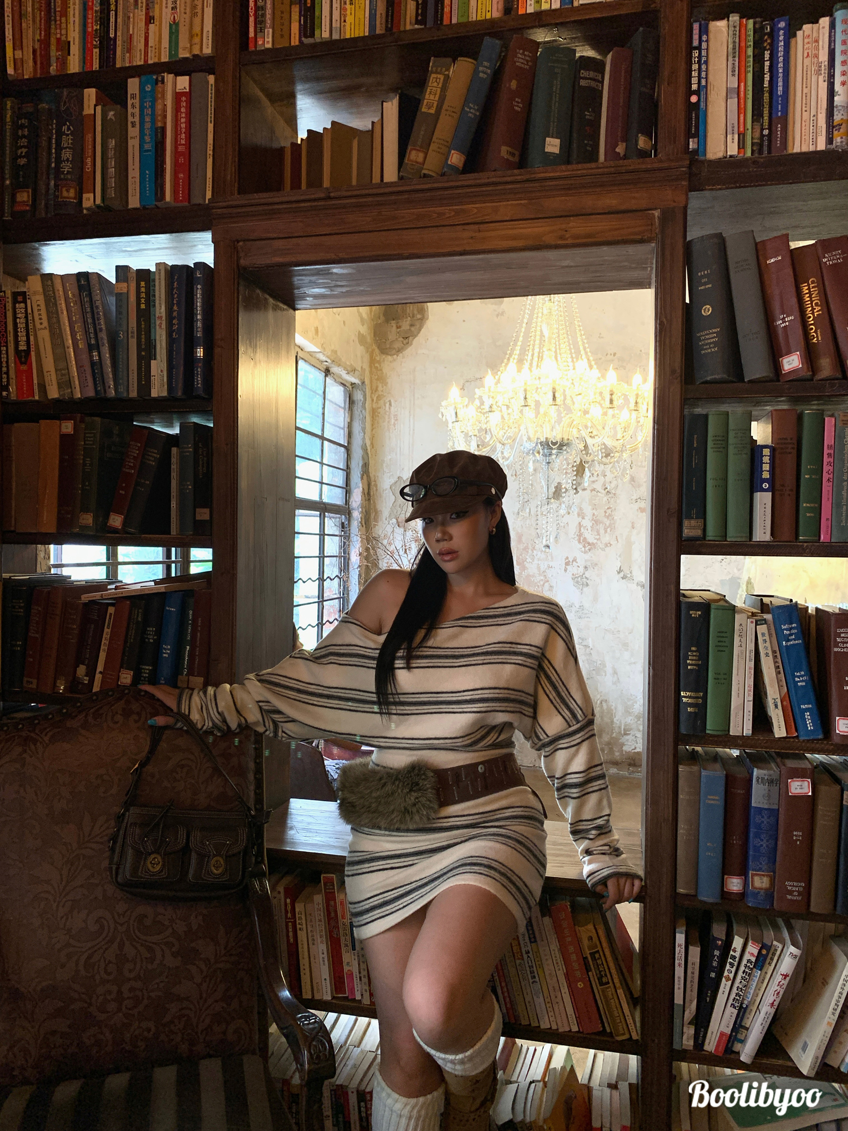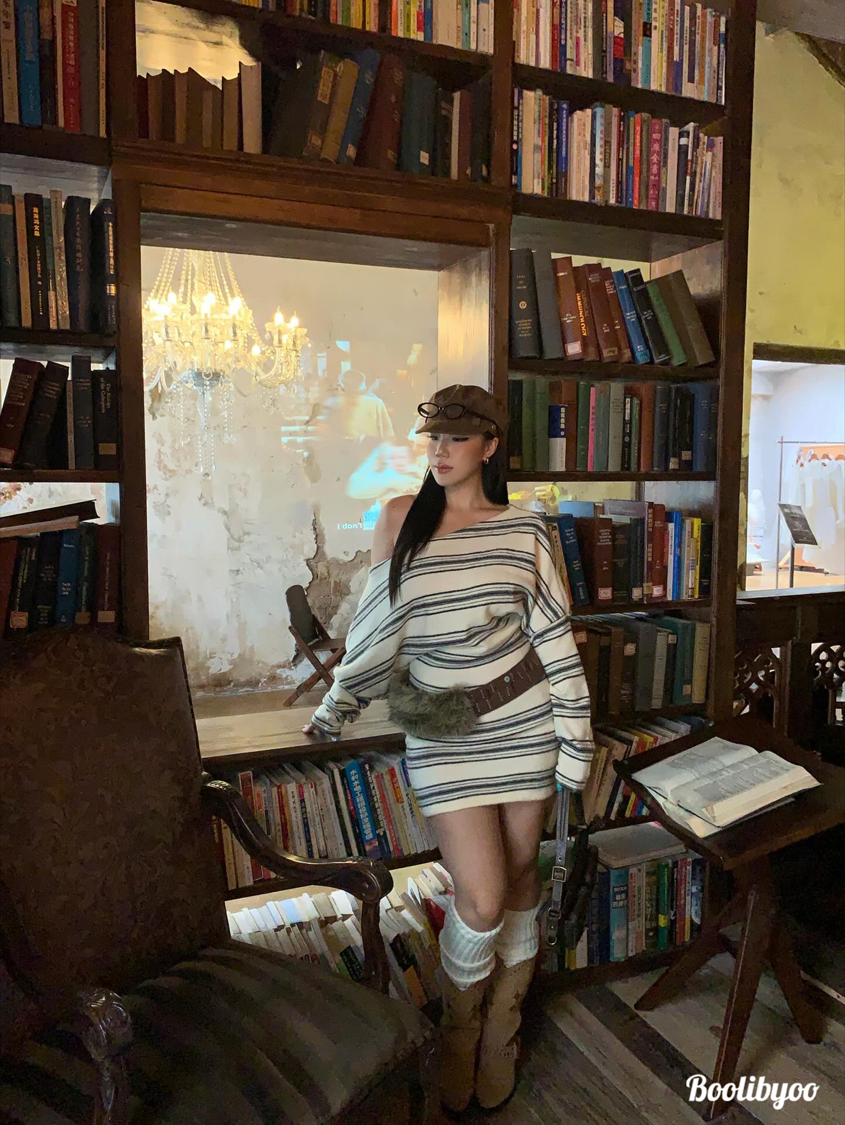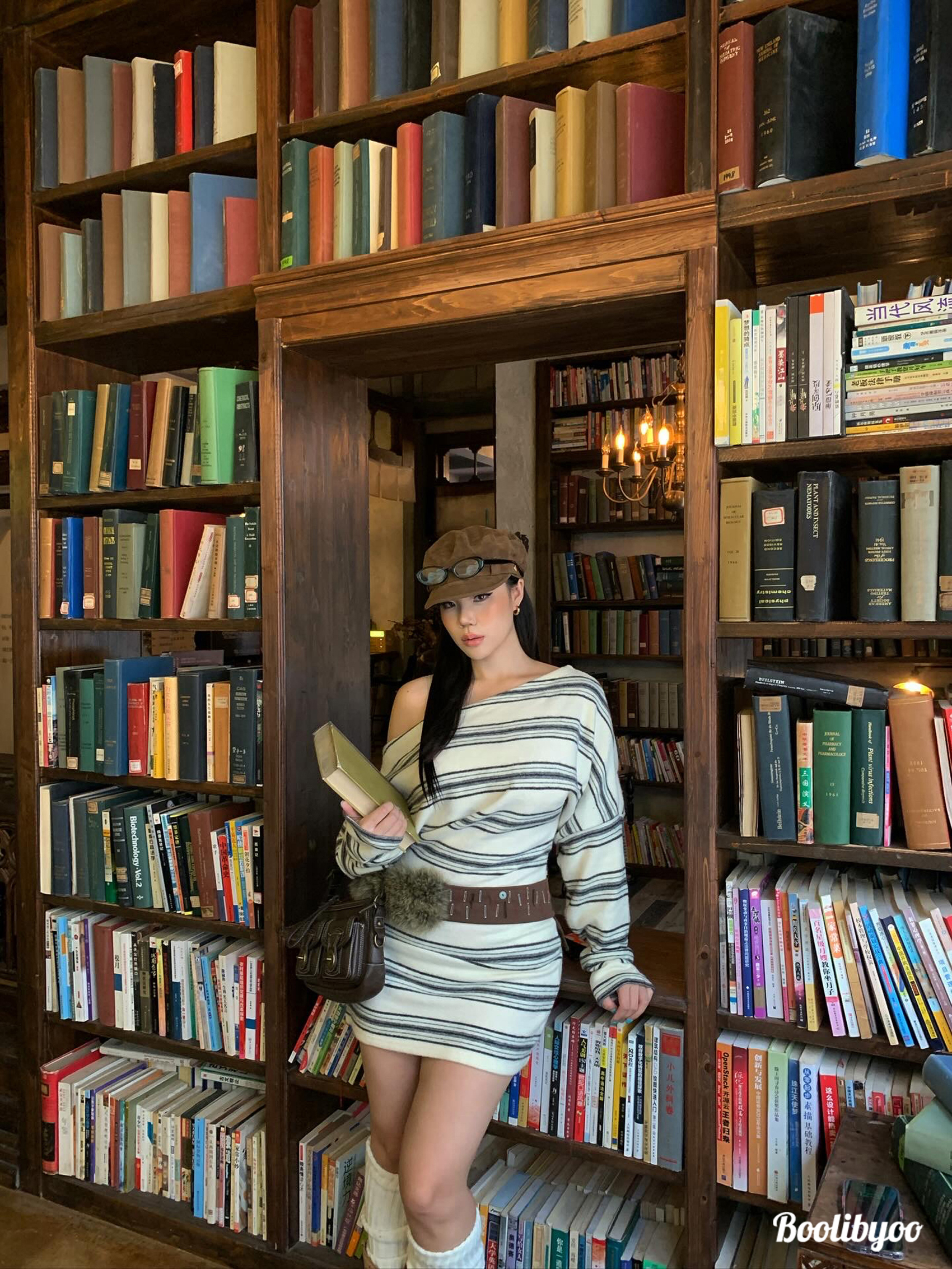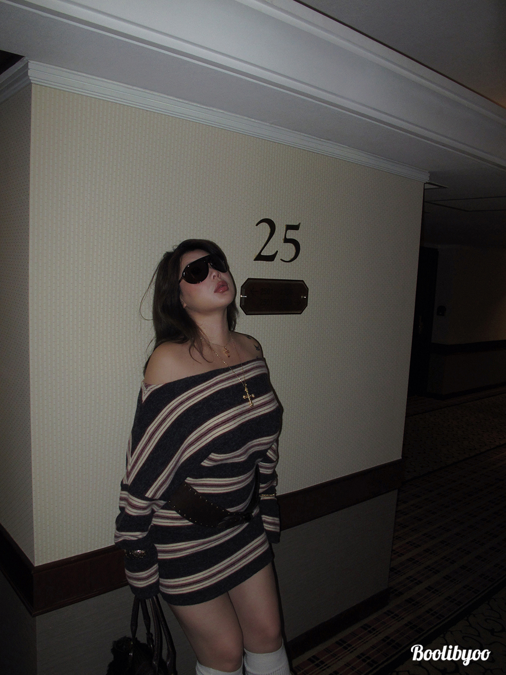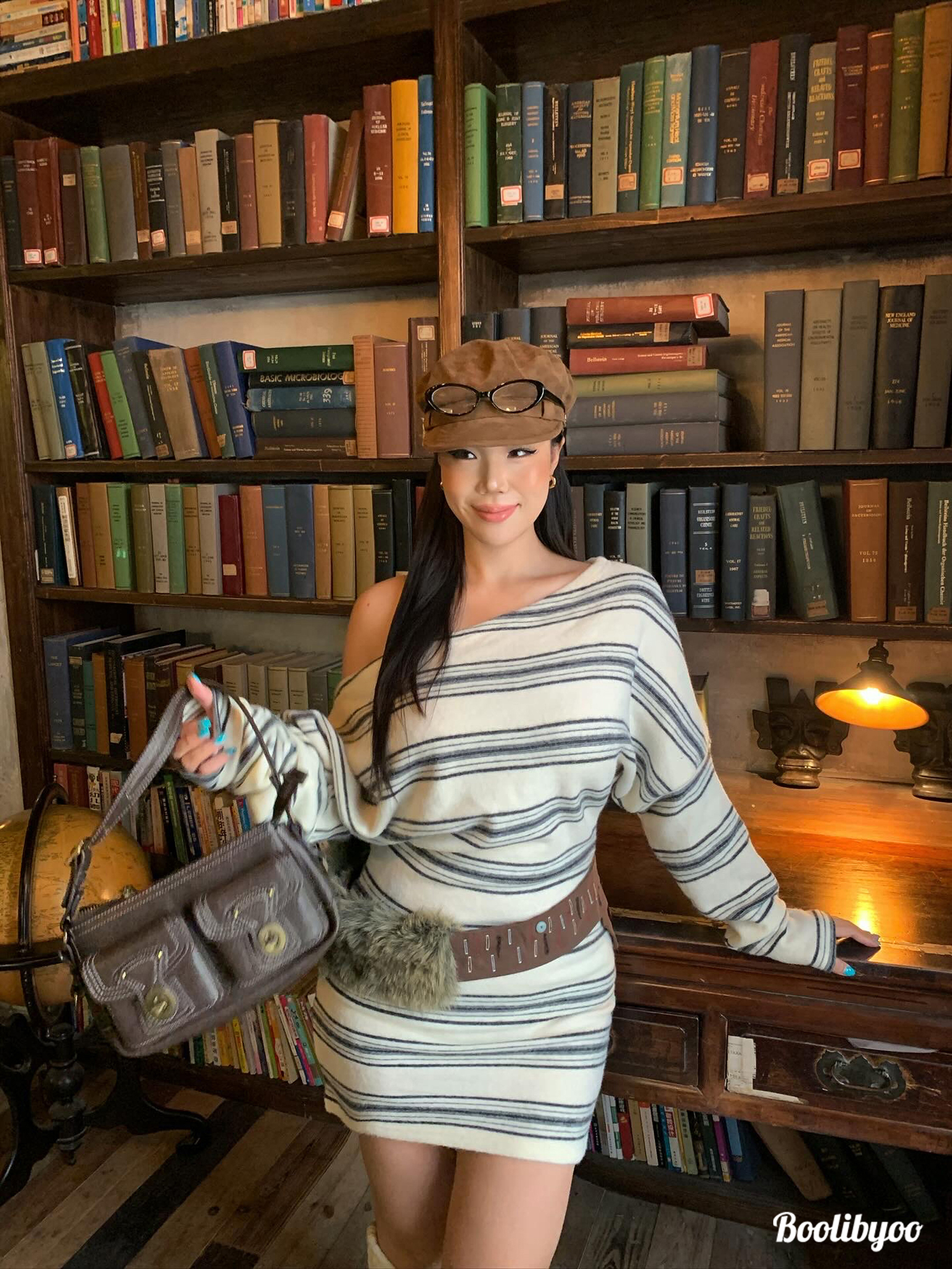 Boolibyoo Vintage Toffee Color Oversized Casual Spicy Girl Off-Shoulder Asymmetrical Striped Short Dress