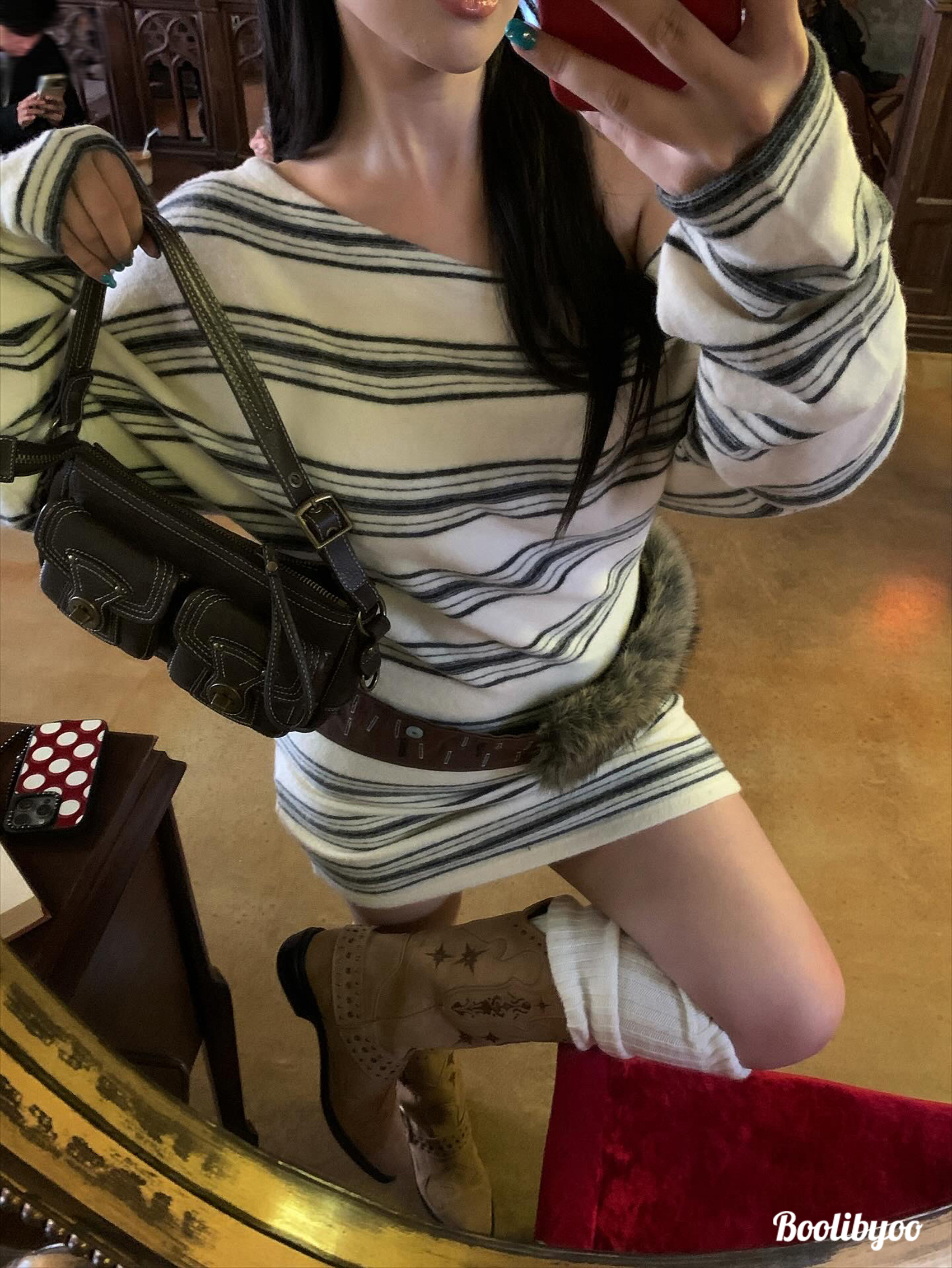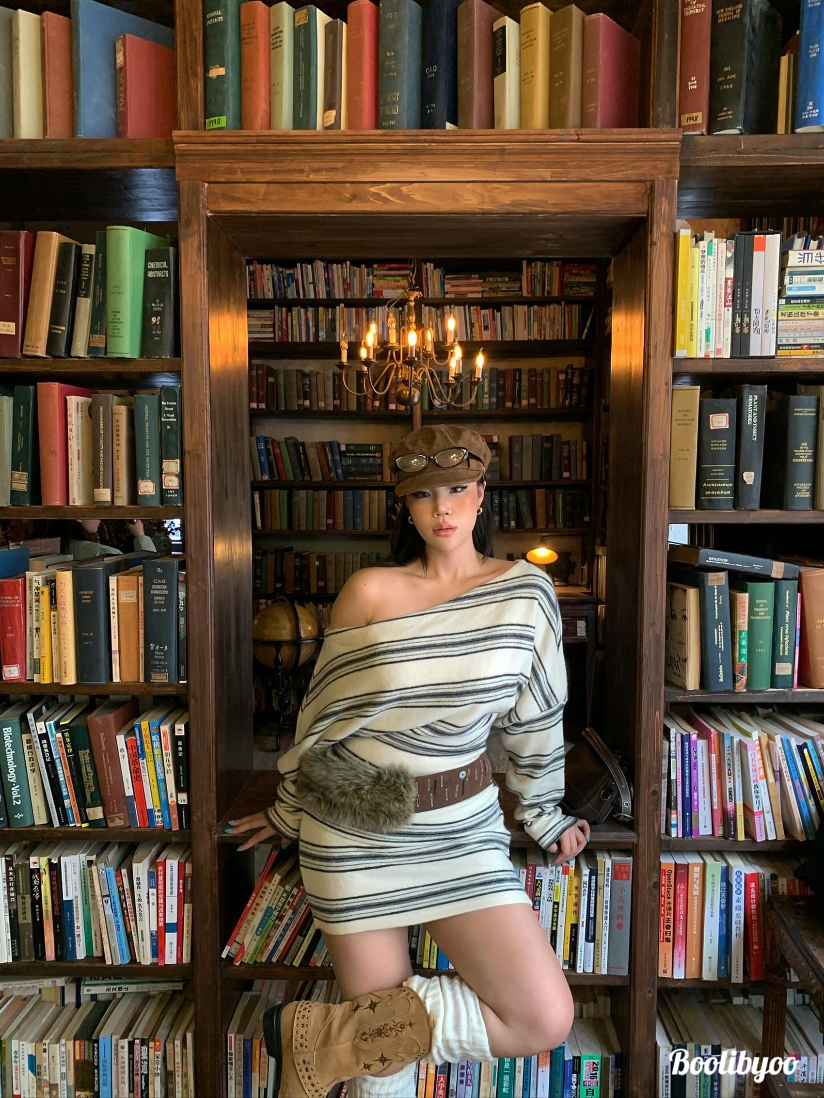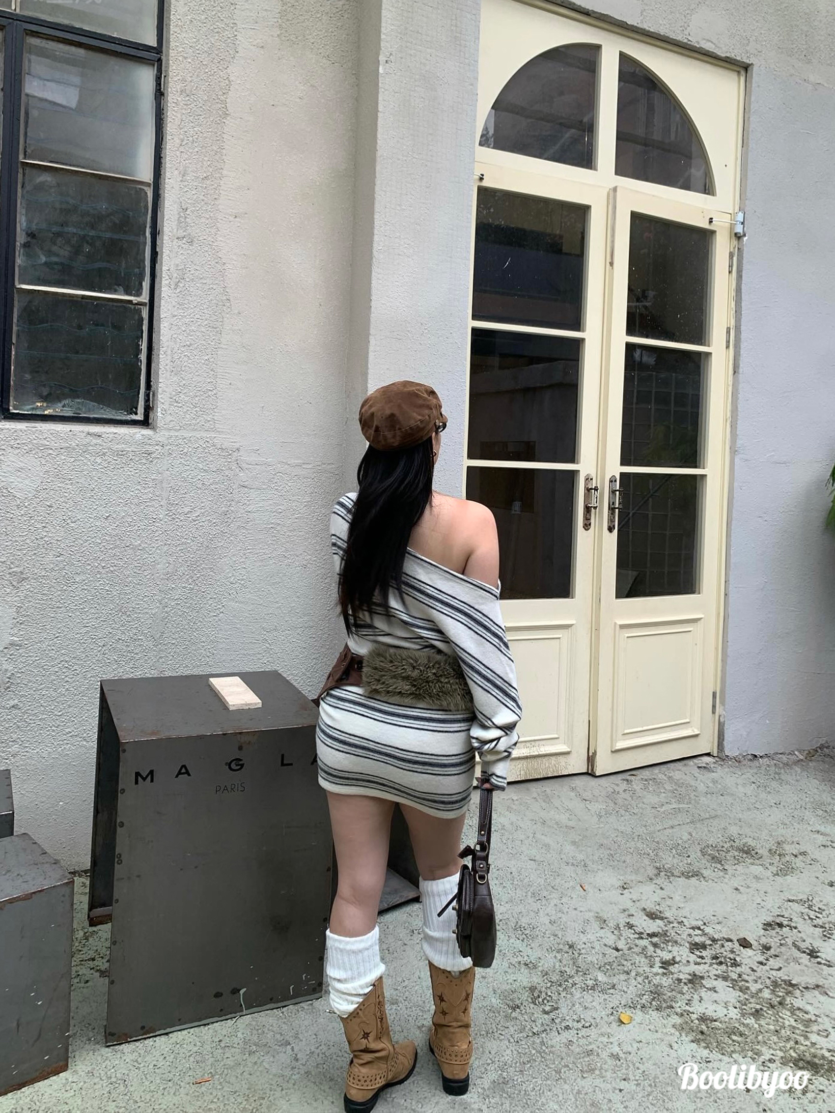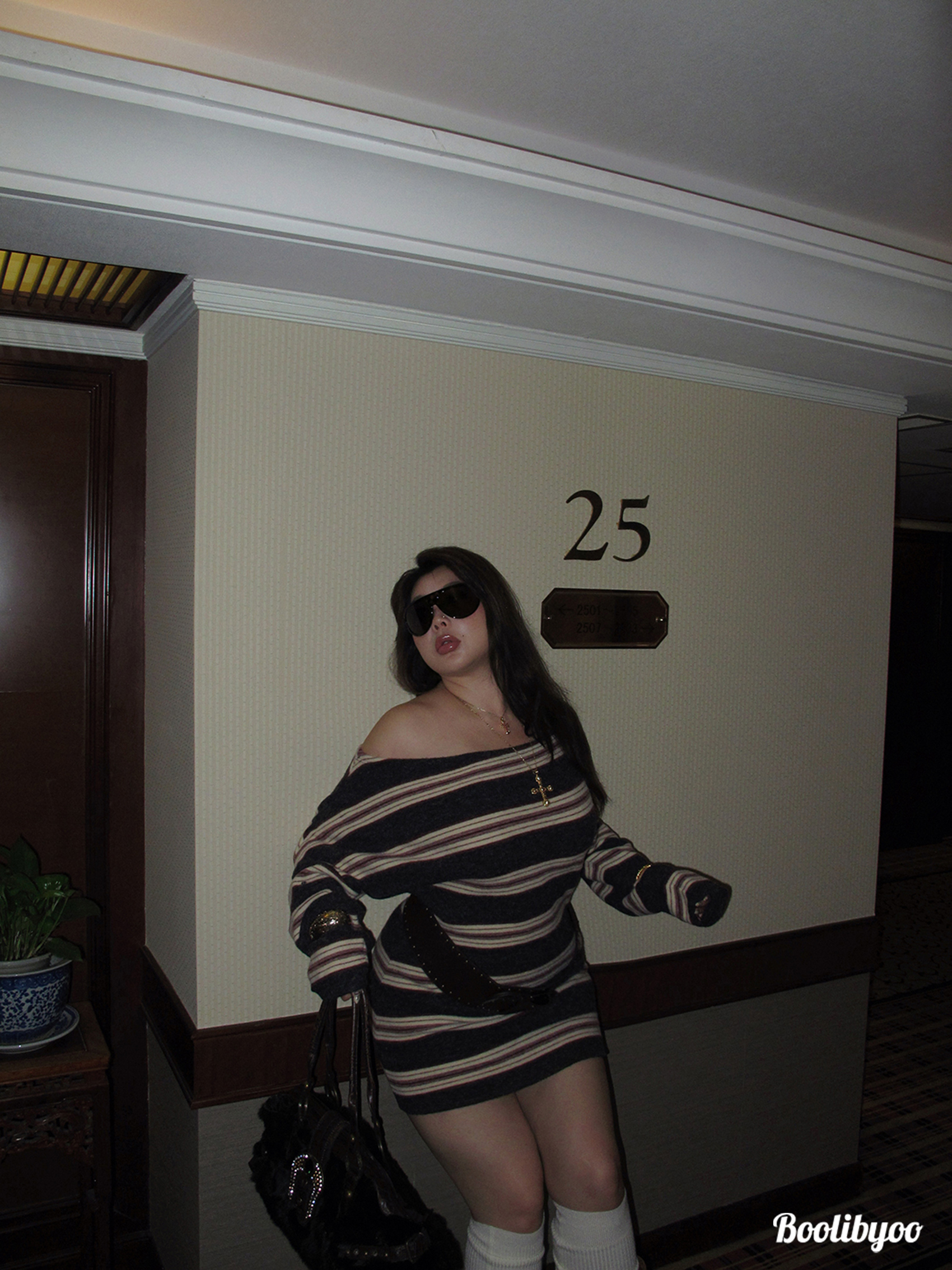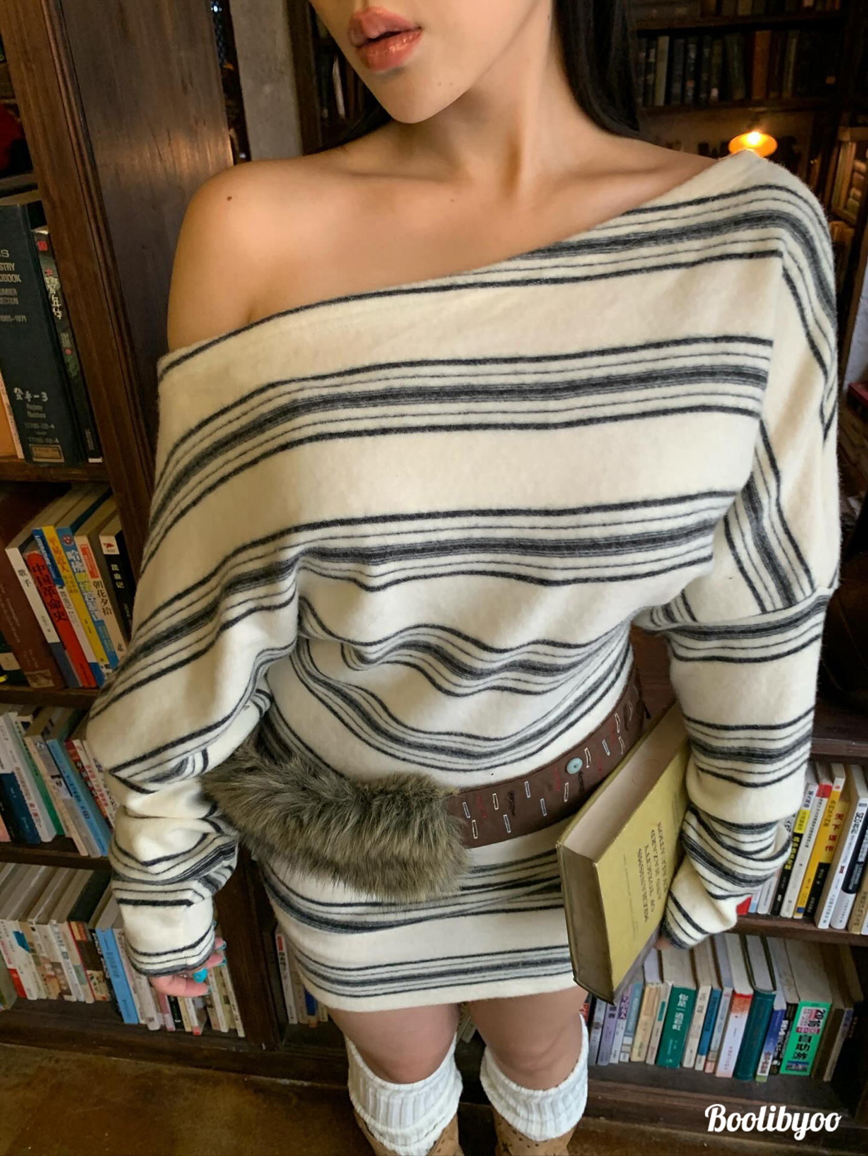 Boolibyoo Vintage Toffee Color Oversized Casual Spicy Girl Off-Shoulder Asymmetrical Striped Short Dress