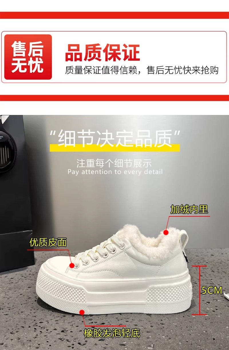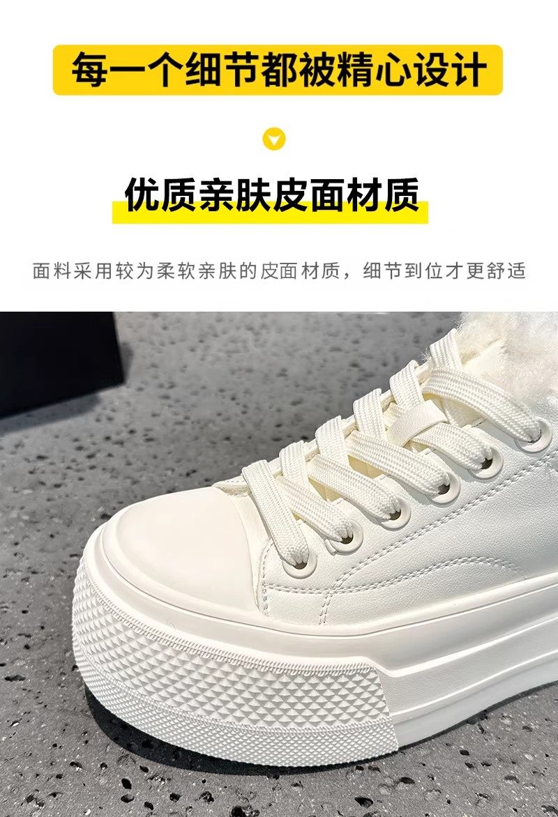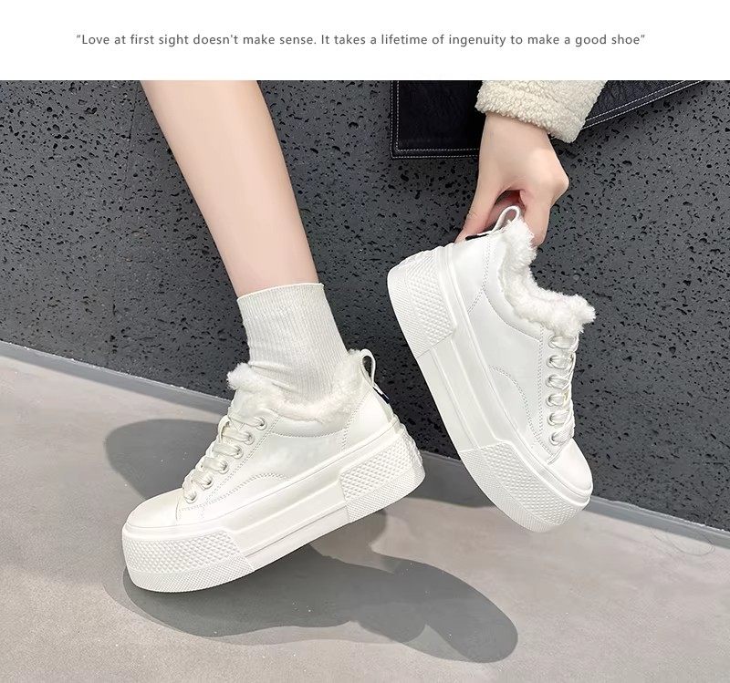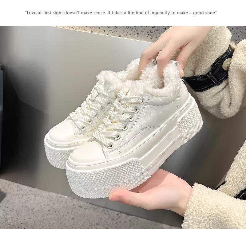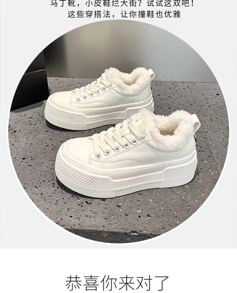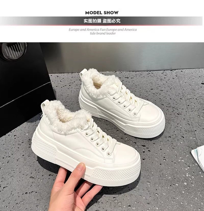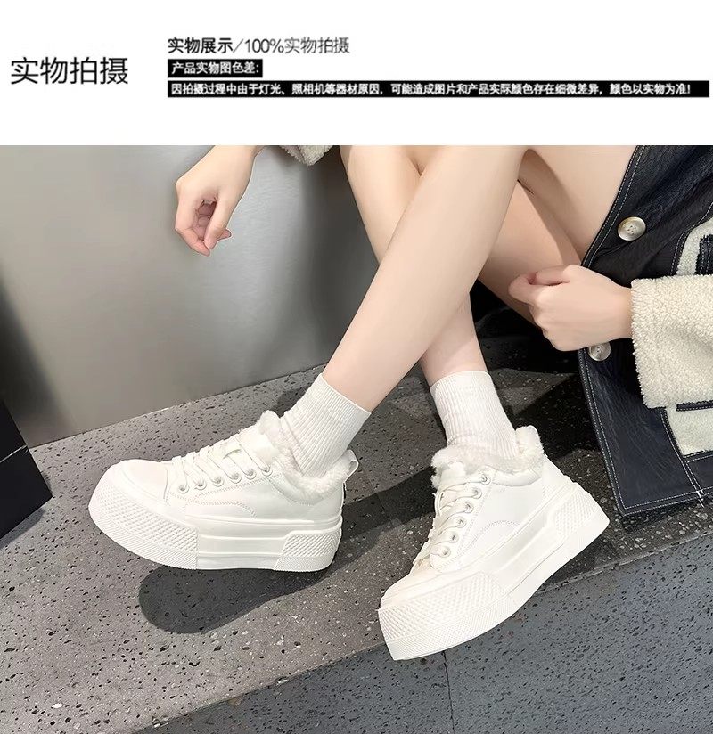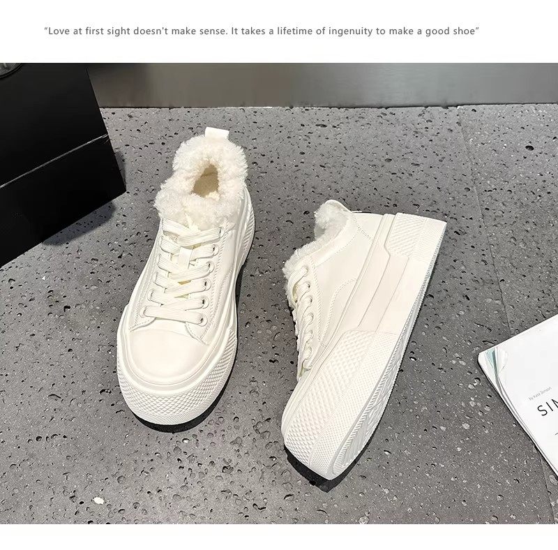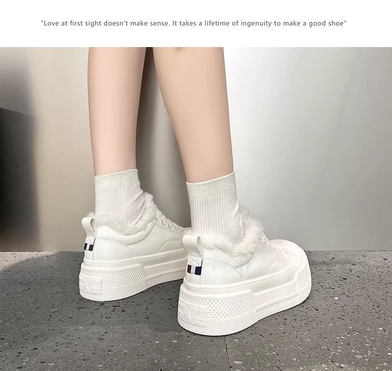 Hong Kong Genuine Leather Small-Sized Thick-Soled Height-Increasing Fleece-Lined White Sneakers for Women, Winter Lamb Wool Furry Shoes, Versatile Casual Sneakers