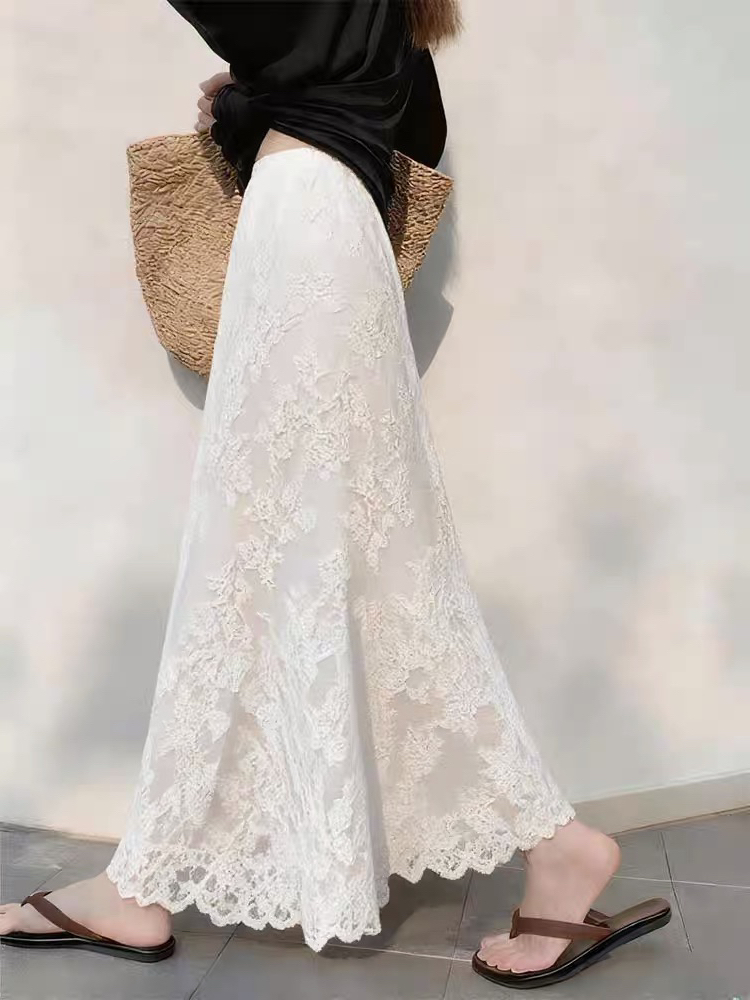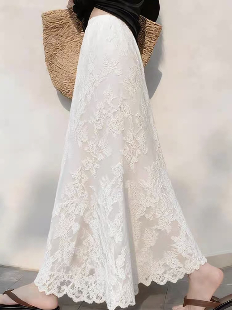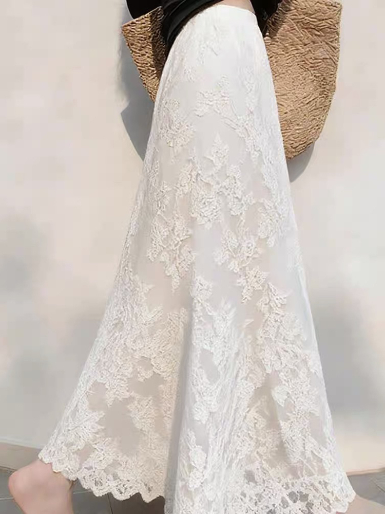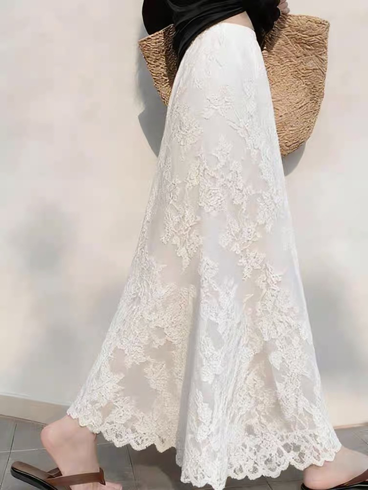 Autumn Unique Design, Chic and Elegant Drape, White Lace Skirt, Women's High-Waisted Slimming A-Line Long Skirt