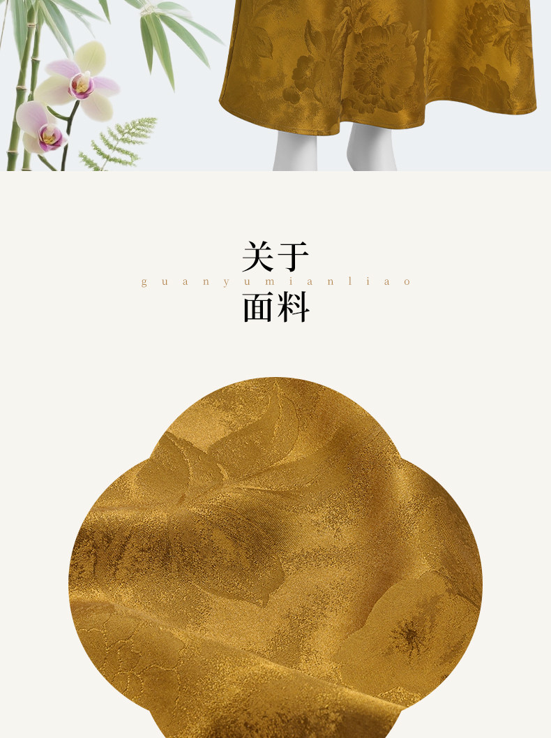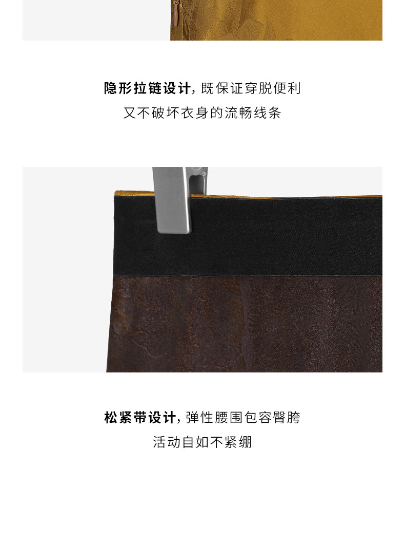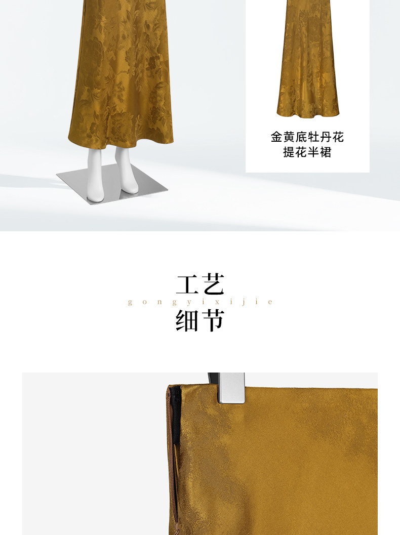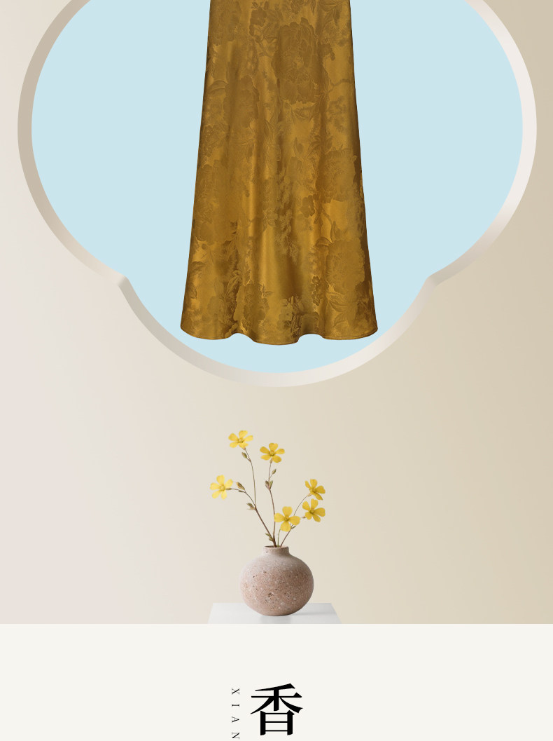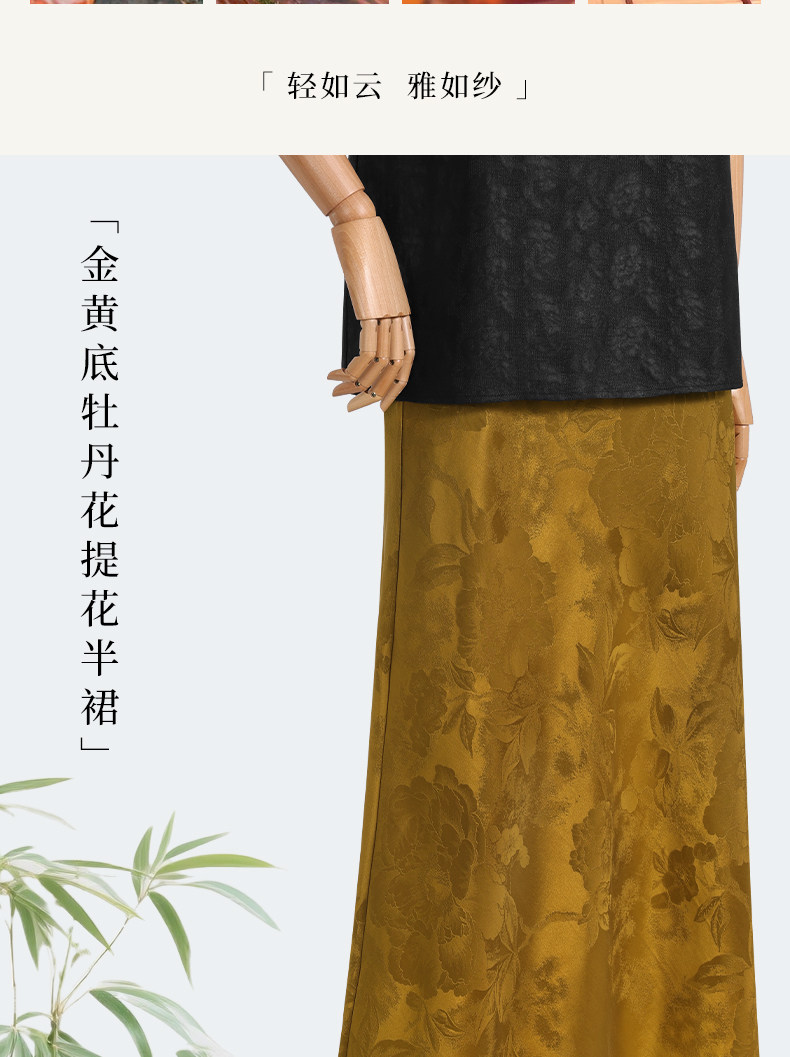 Chinese Silk Long Skirt with a Jacquard Pattern of Peonies on a Golden Background, New Chinese Style Half Skirt, National Style, Slimming Effect