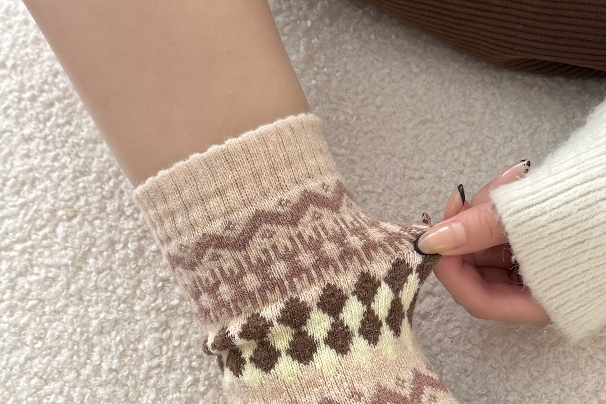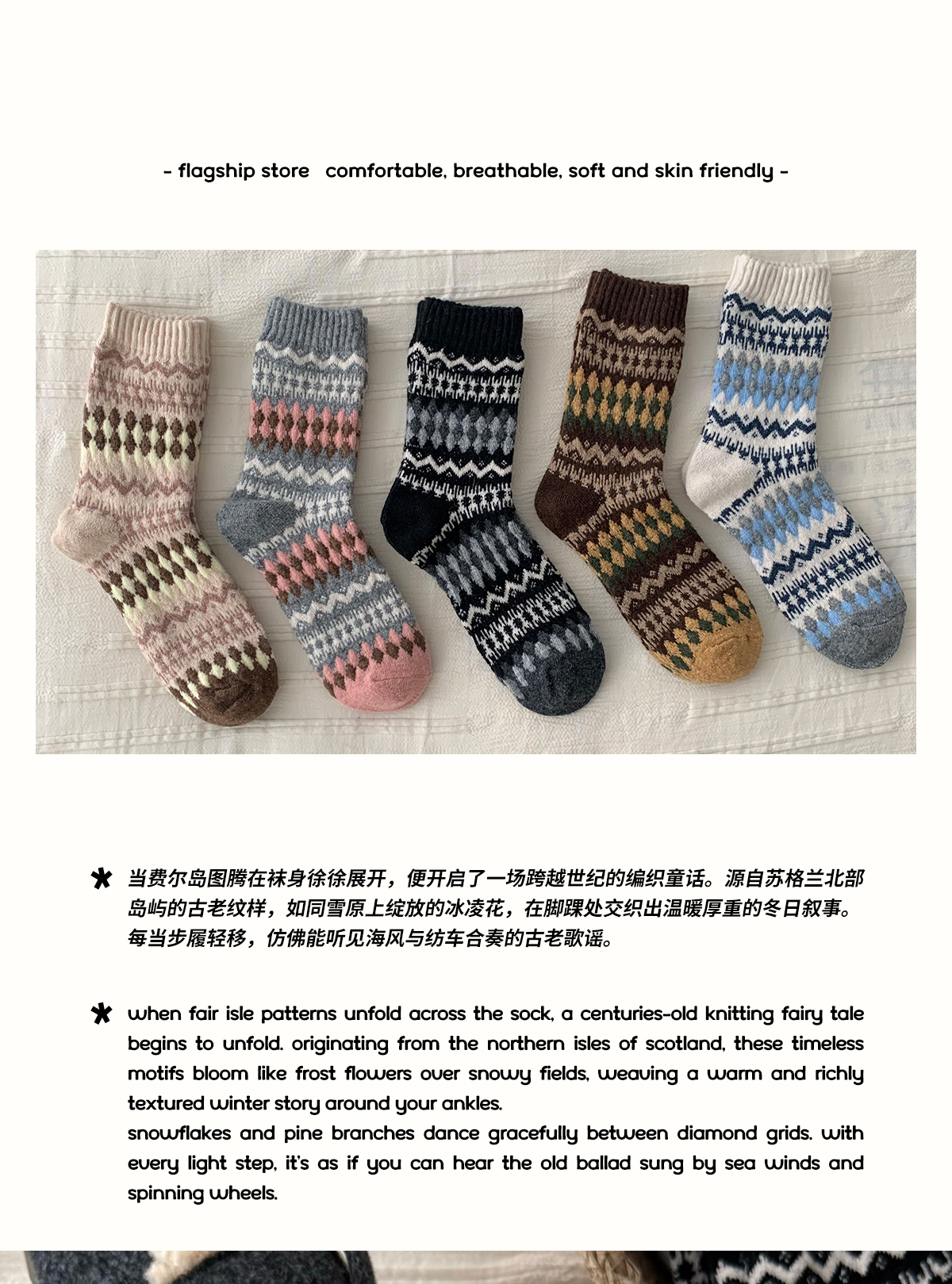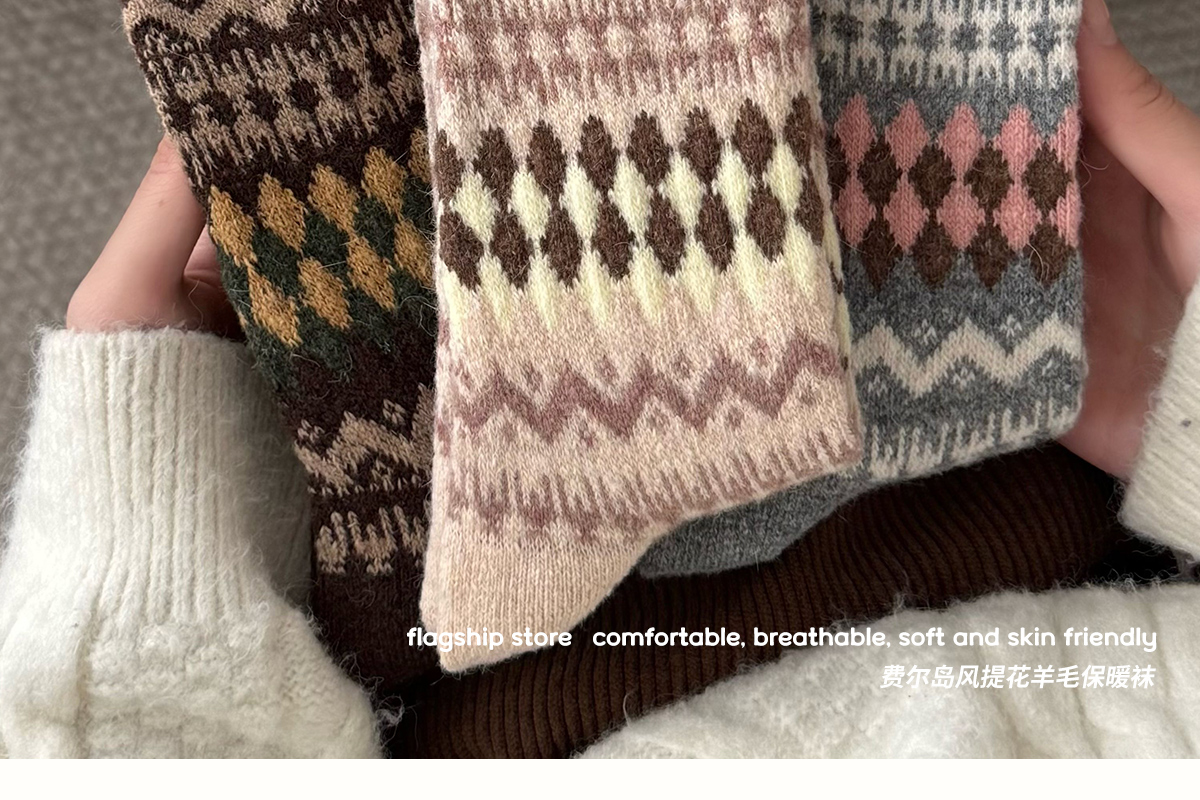 Retro Coffee-Colored Socks for Women in Autumn and Winter, Pure Cotton Mid-Calf Socks, Thickeneded and Warm Wool Cotton Socks, Fair Isle Stockings for Winter