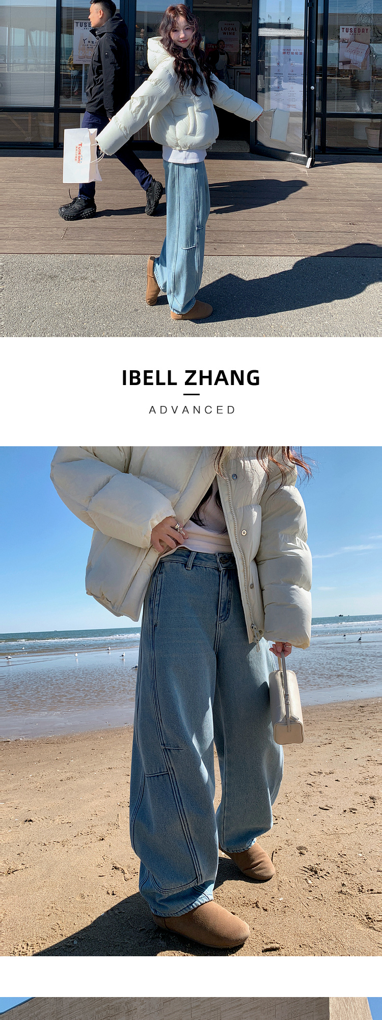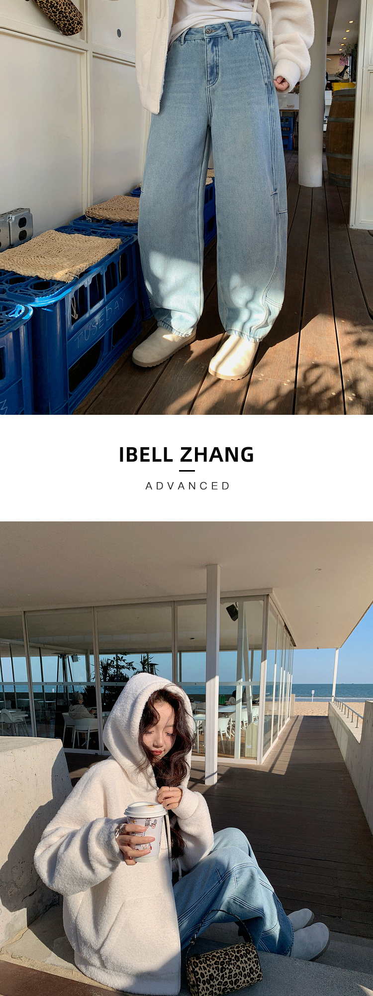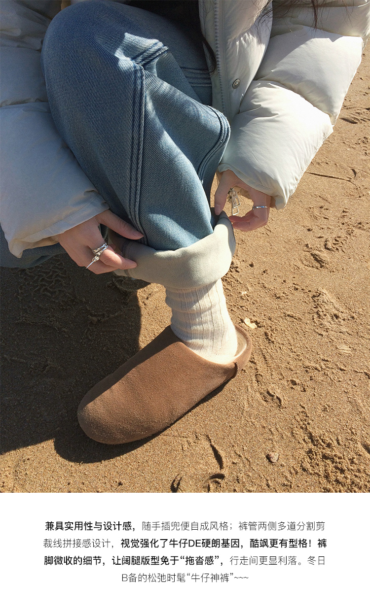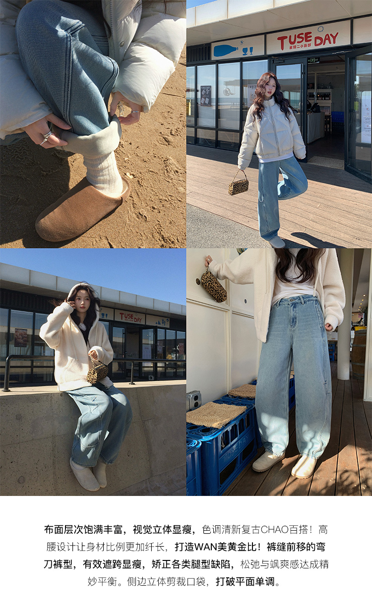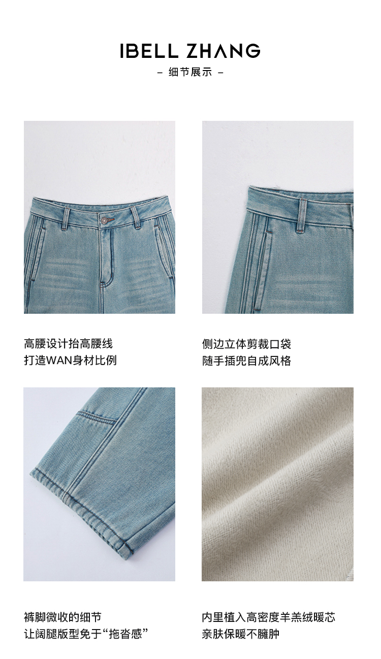 Zhang Beibei Ibell Thickened Baby Velvet Design Warm Slimming Three-Dimensional Cut Curved Knife White-Washed Jeans