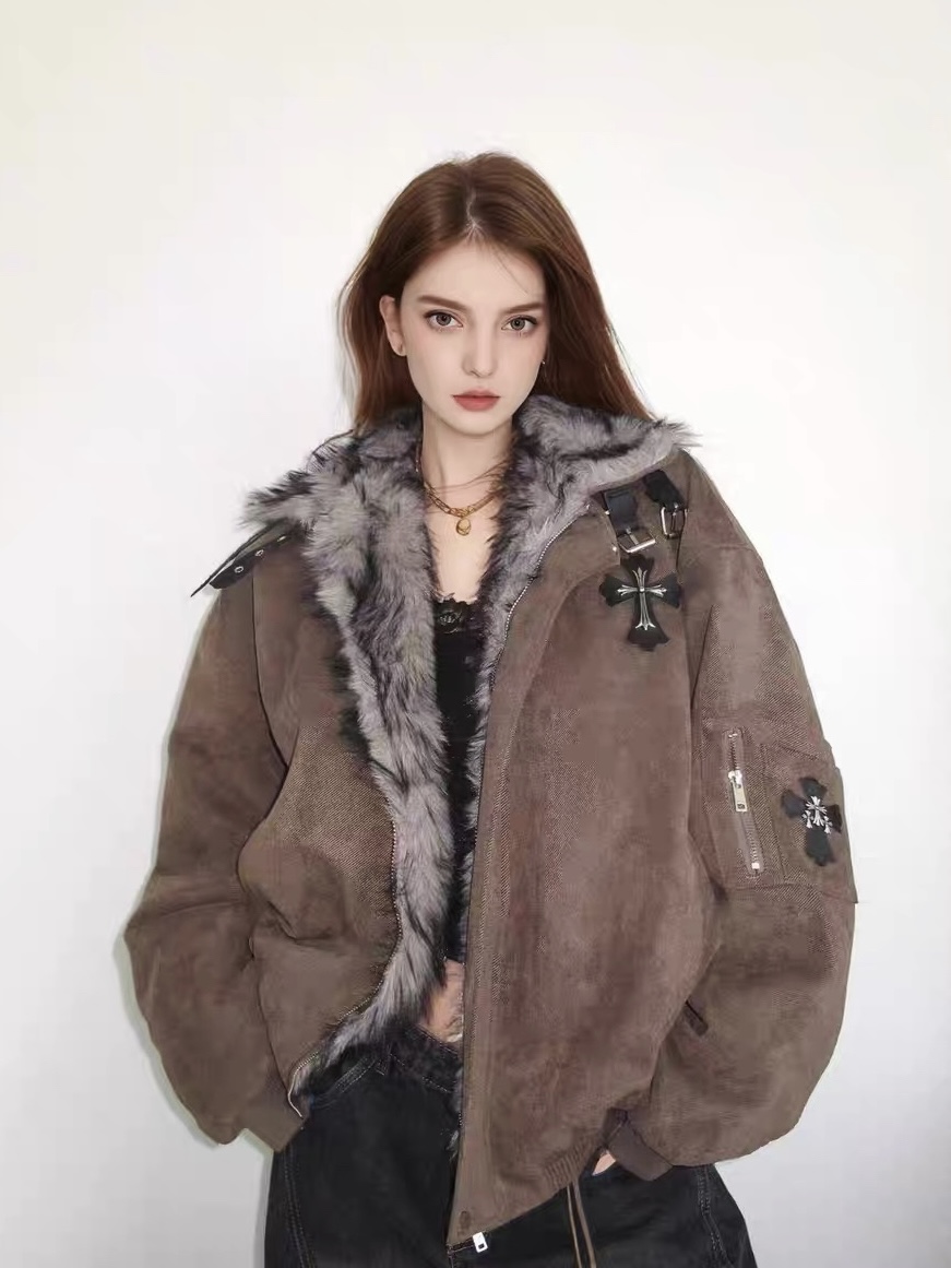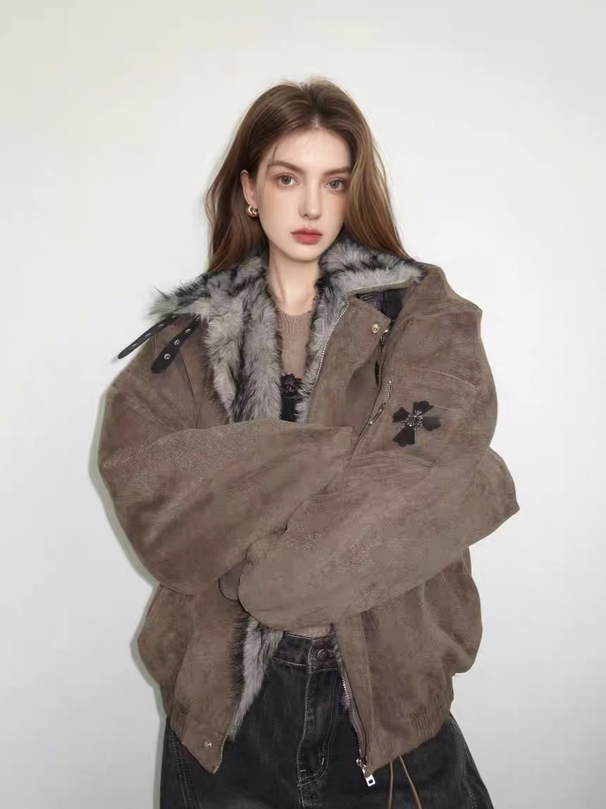 American Retro Fur Collar Cross-Patterned Cotton-Padded Jacket for Women, Fleece-Lined and Thickened, New Winter Cotton Coat, Trendy
