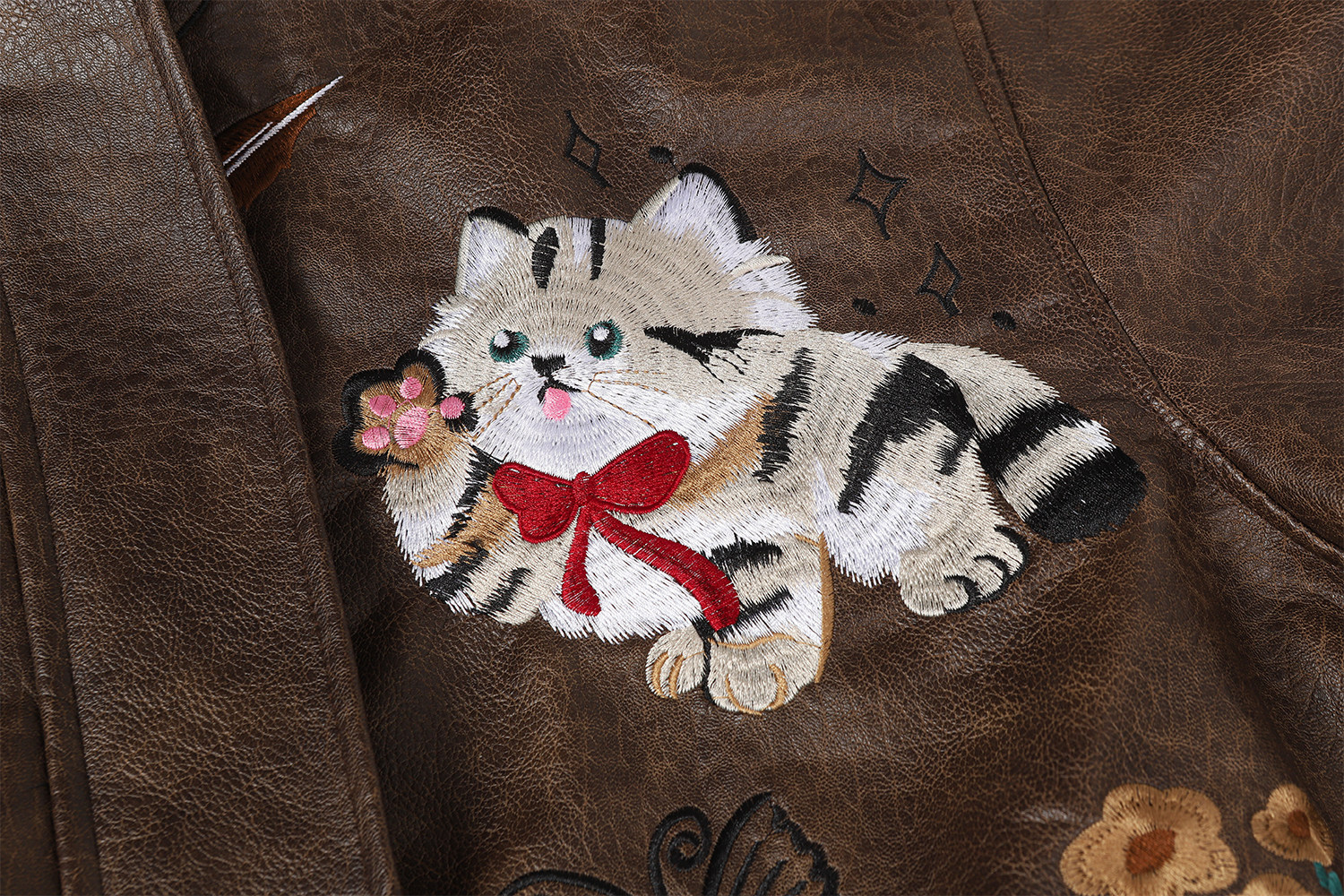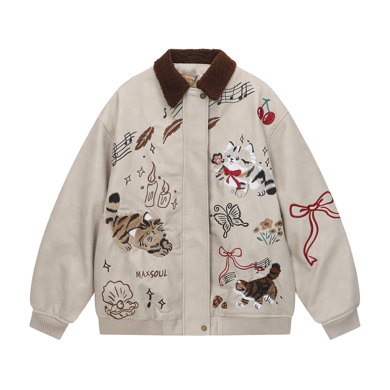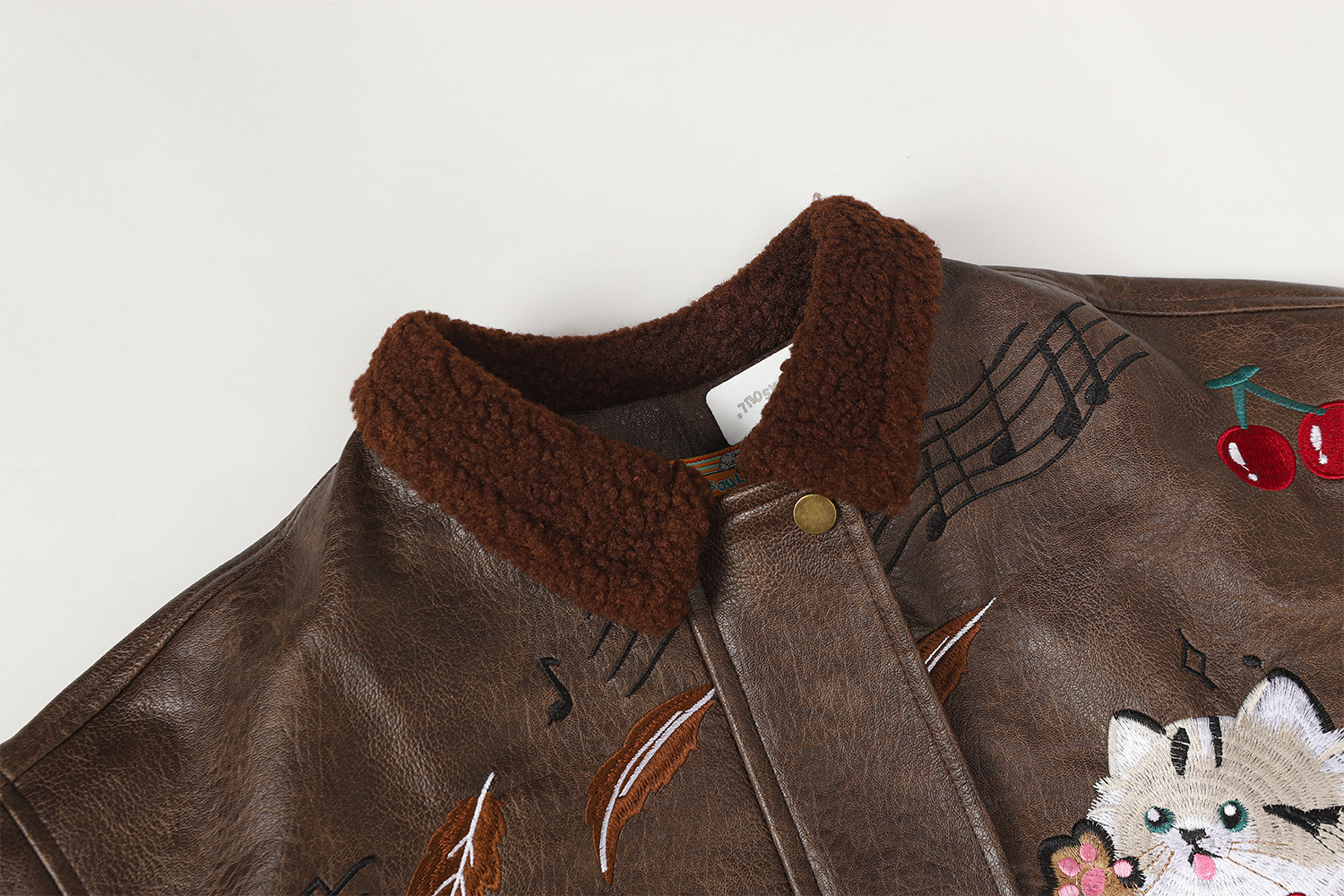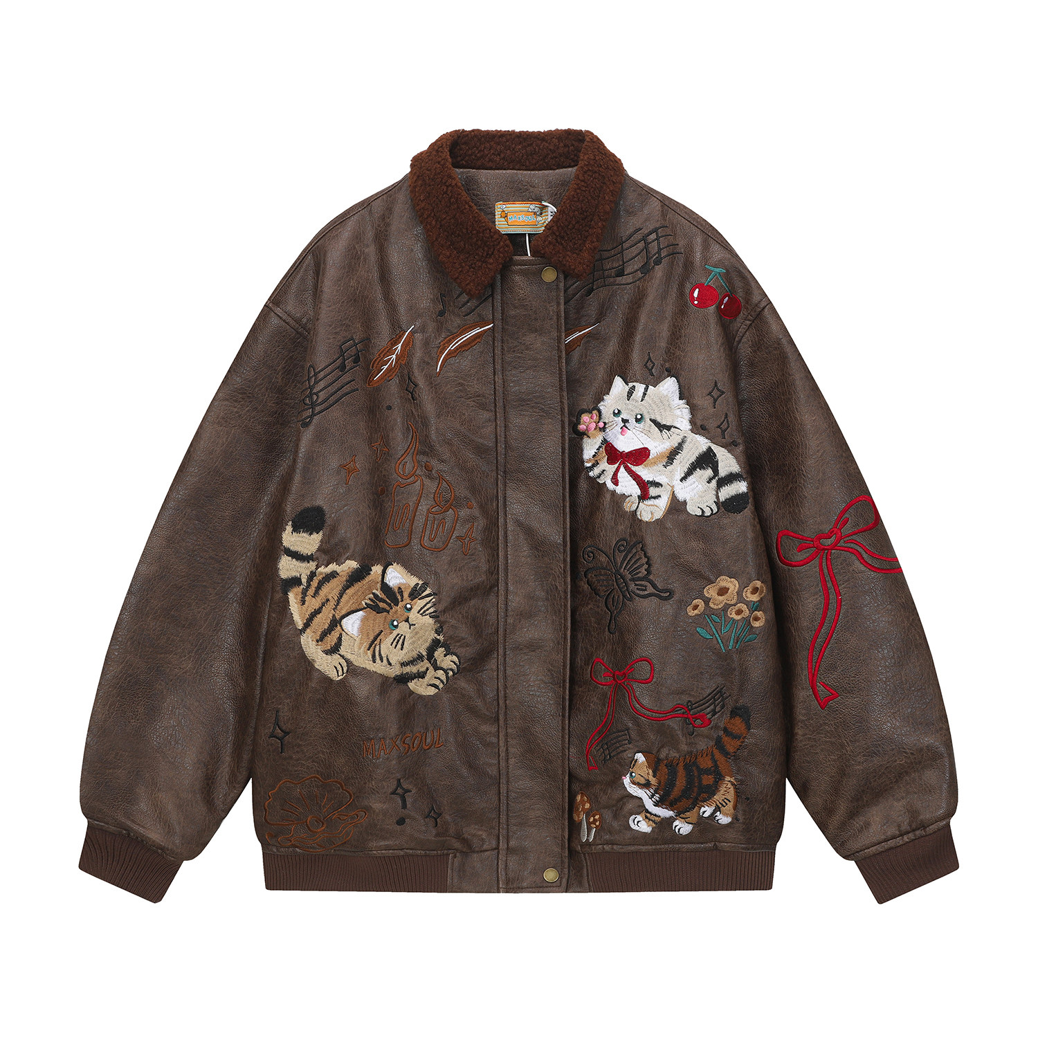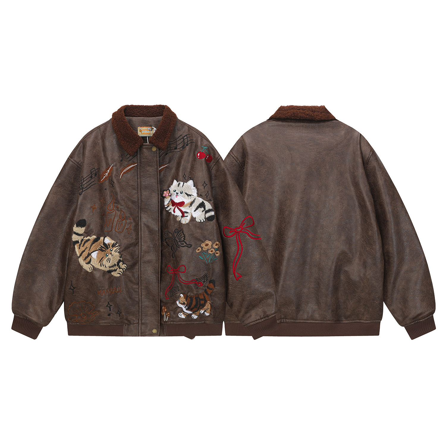 Wesvgm Retro Vintage Fun Cat Embroidered Leather Jacket for Men and Women, Winter Loose Fleece-Lined Coat, Trendy