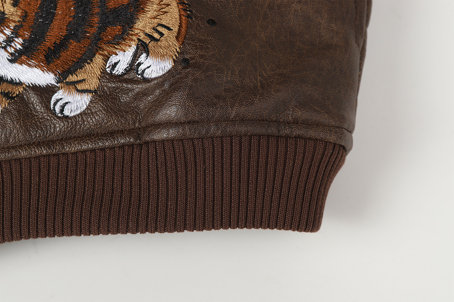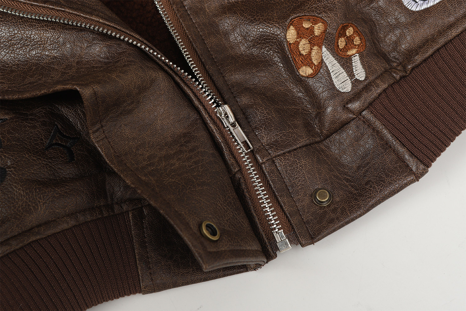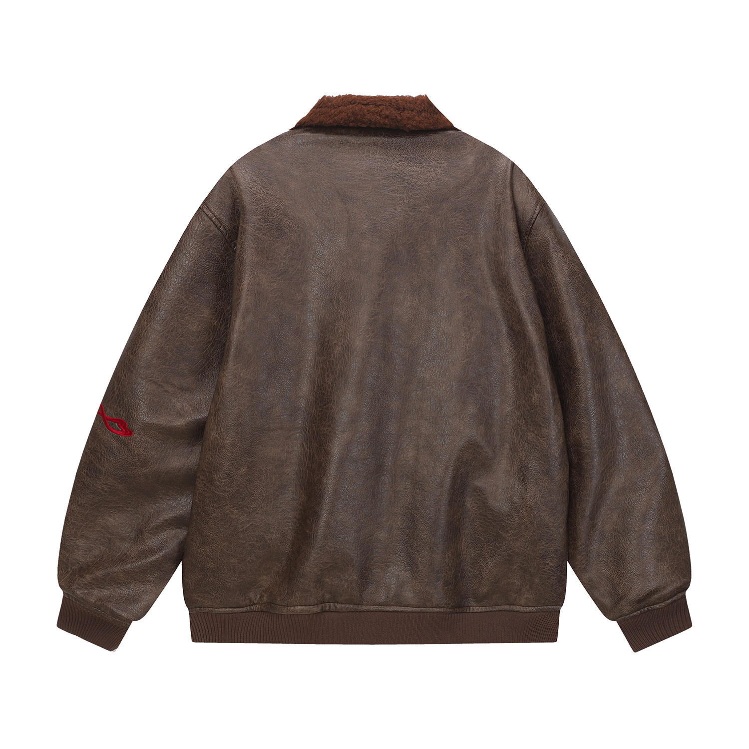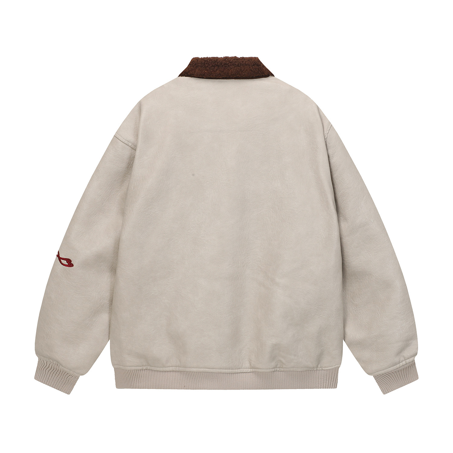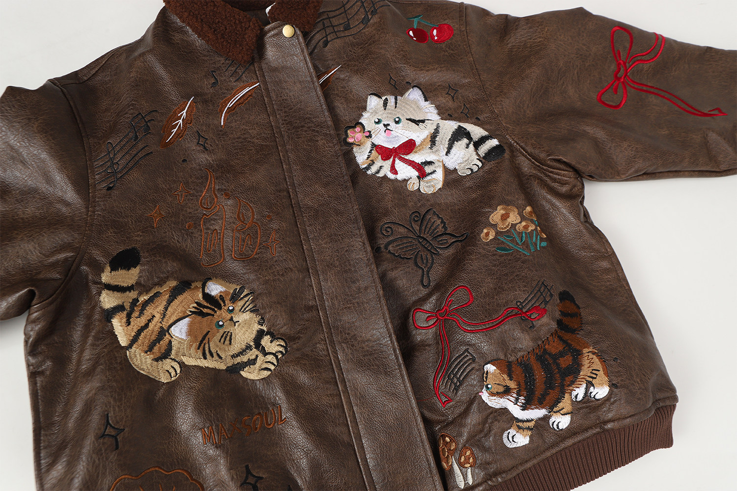 Wesvgm Retro Vintage Fun Cat Embroidered Leather Jacket for Men and Women, Winter Loose Fleece-Lined Coat, Trendy