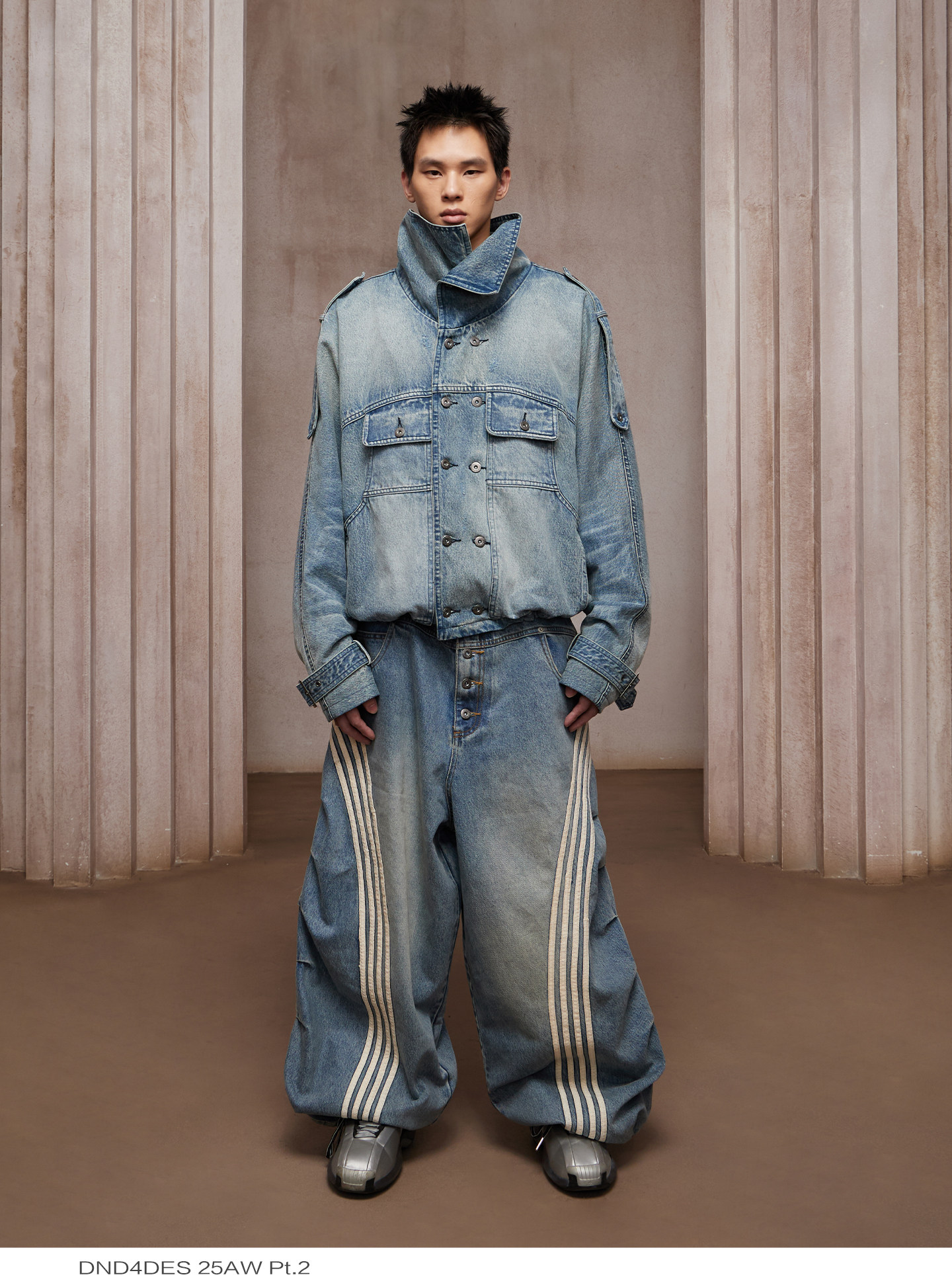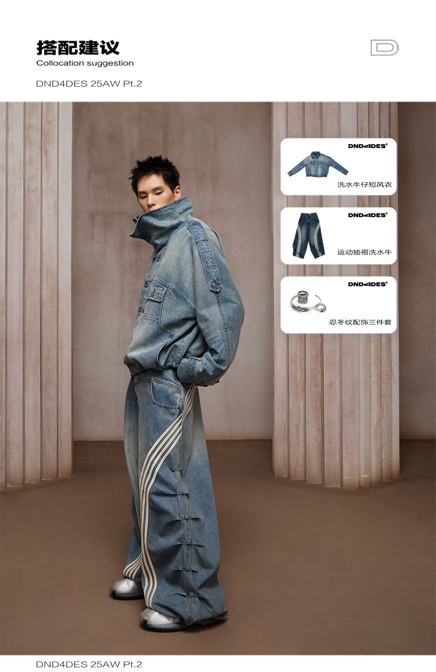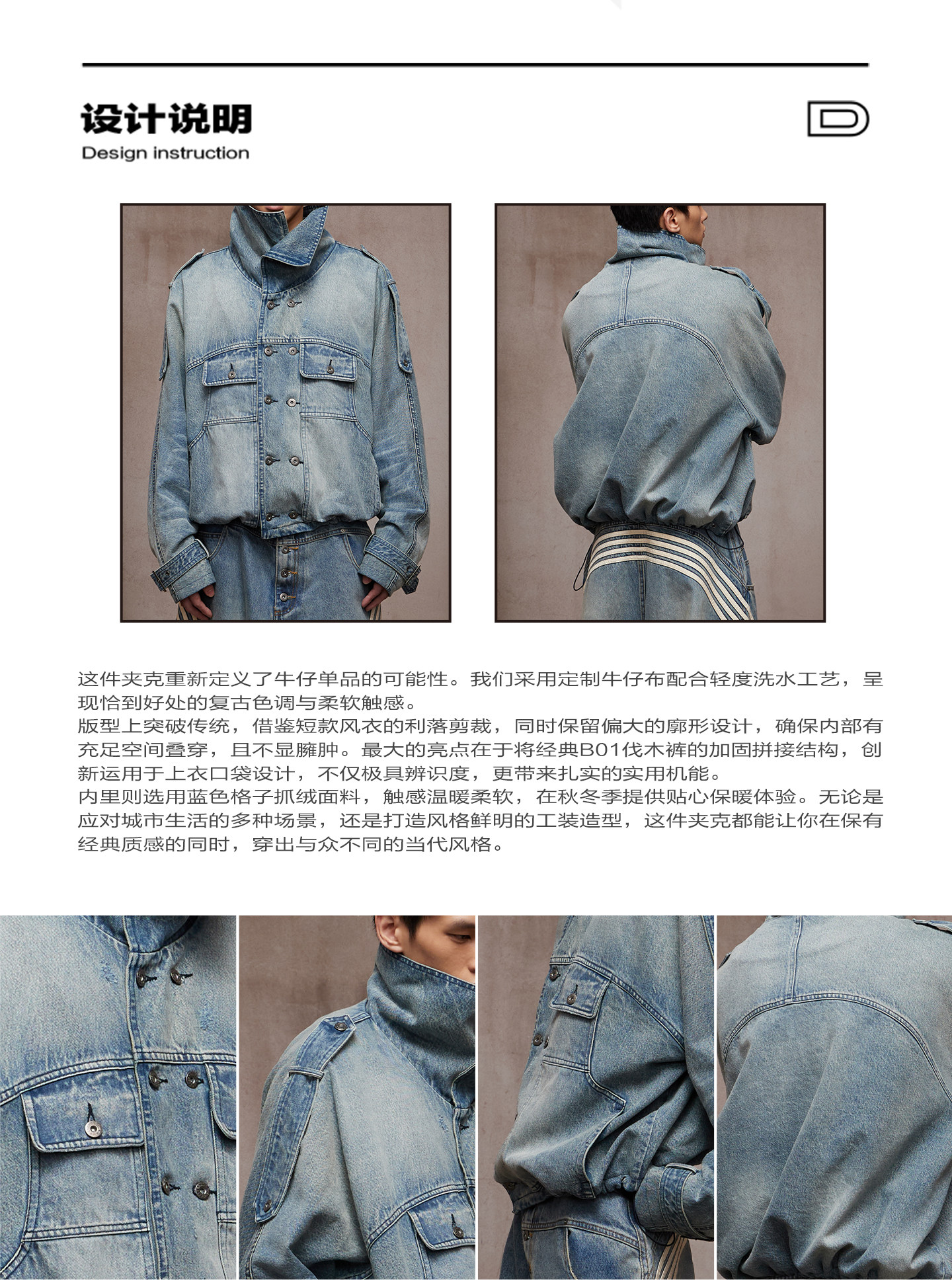 Dnd4Des American-Style Heavy-Duty Washed Vintage Double-Breasted Multi-Pocket Short Wide Denim Jacket with Stand Collar and Trench Coat Style